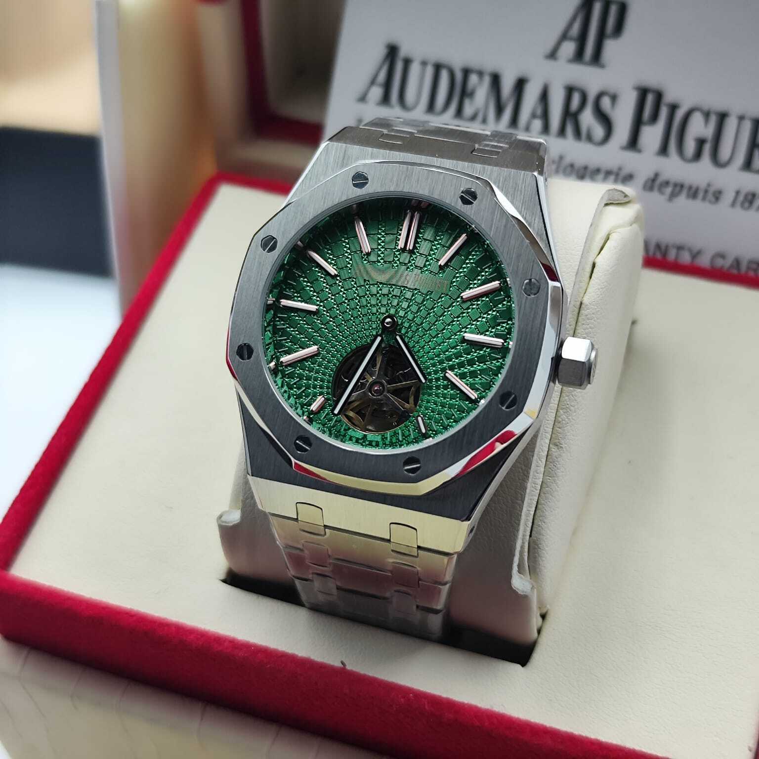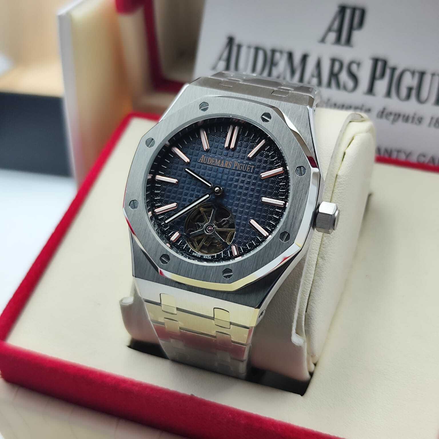 ساعة أوديمار بيغيه رويال أوك توربيون بتصميم استثنائي يجمع بين الأناقة والهندسة الميكانيكية الفريدة. مينا أزرق بتصميم “تابيسري” مع نافذة توربيون تكشف عن روعة الأداء. صنعت من الستانلس ستيل عالي الجودة لإطلالة فاخرة ومتينة.