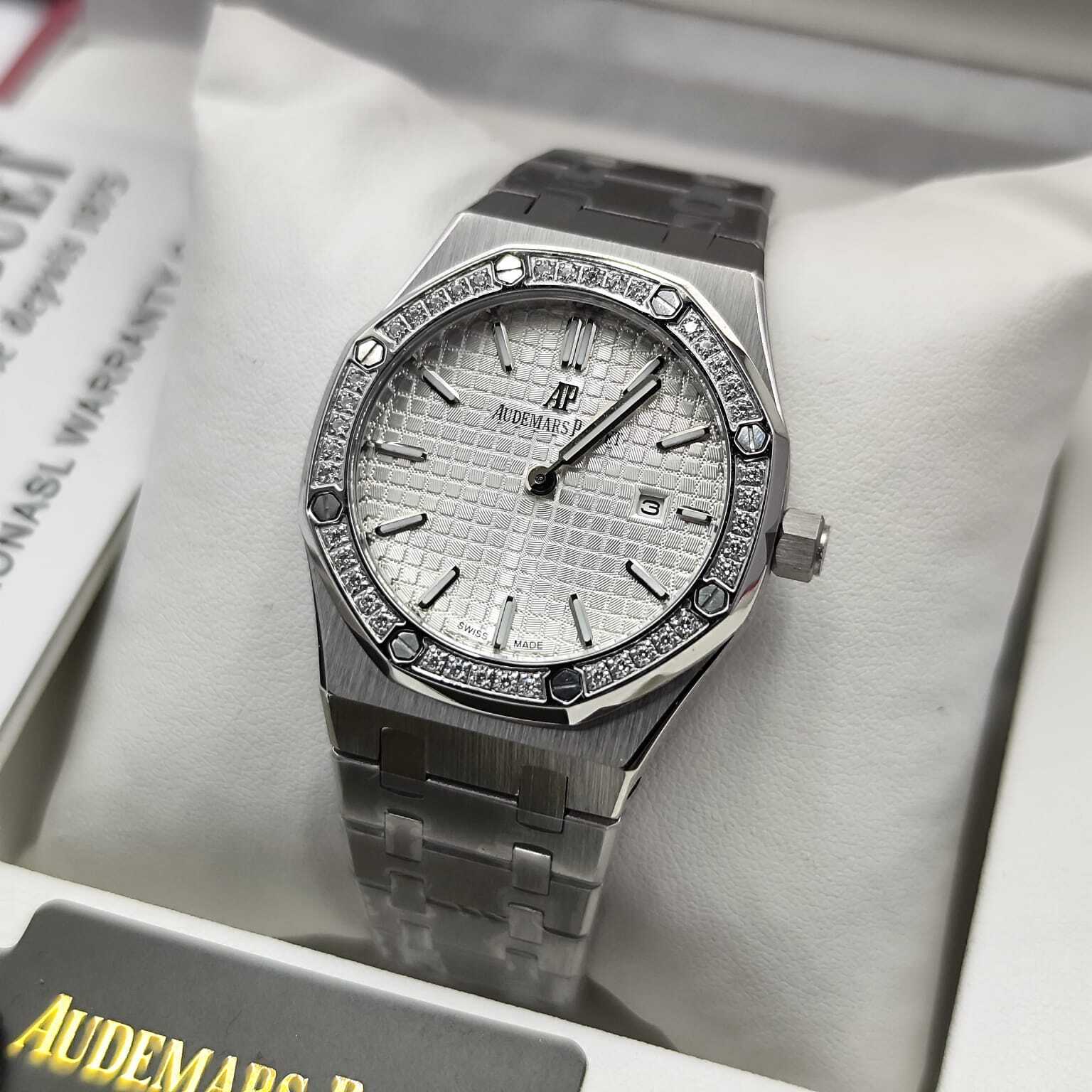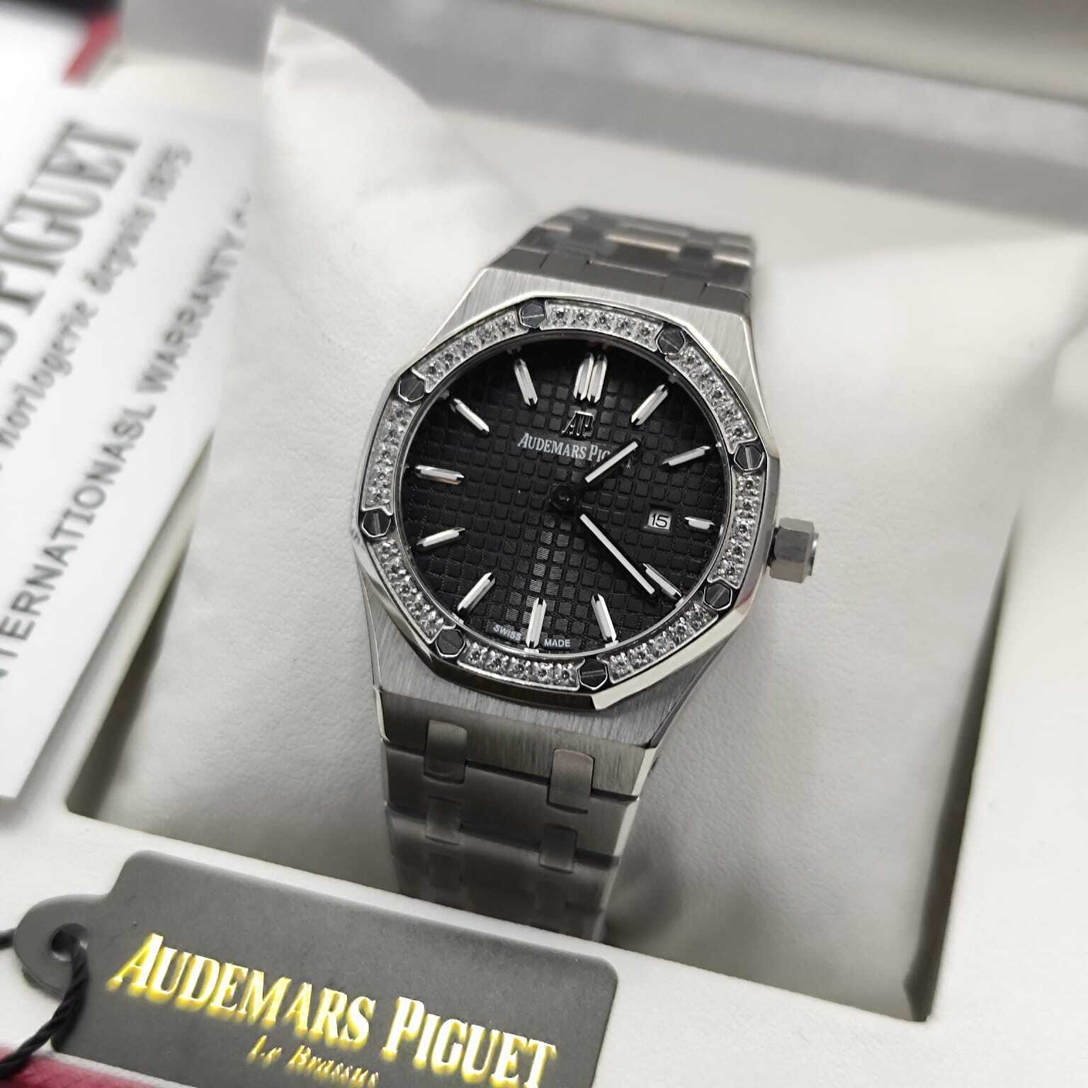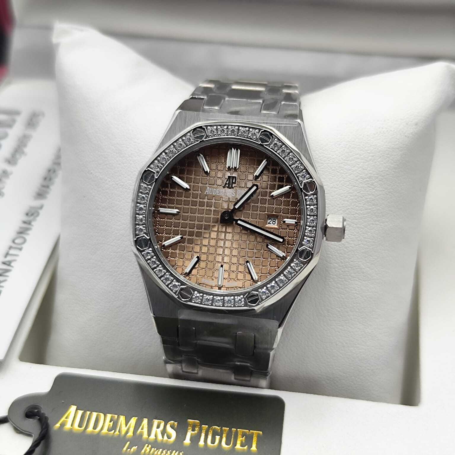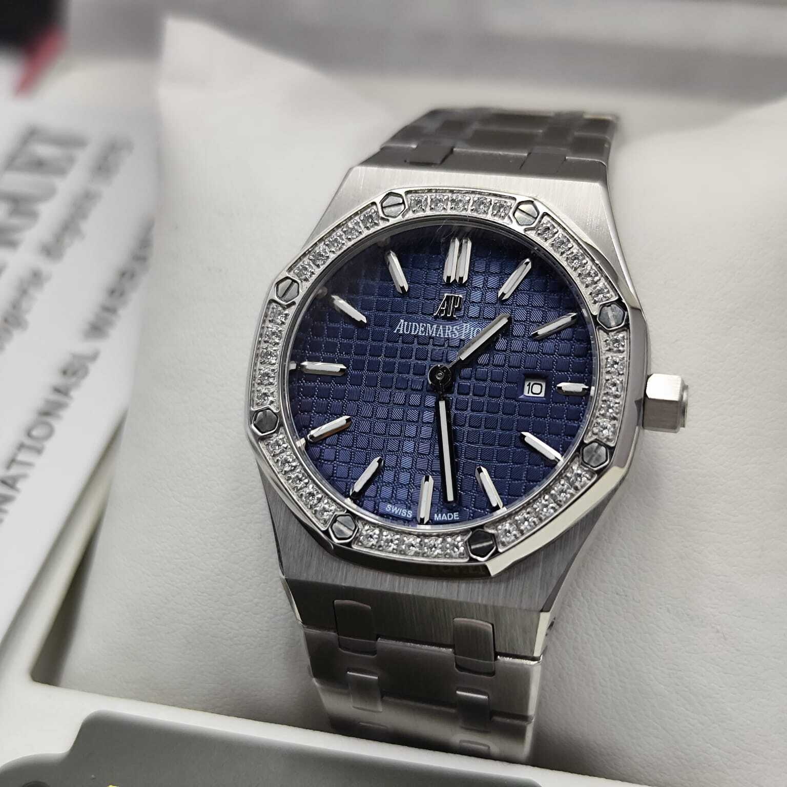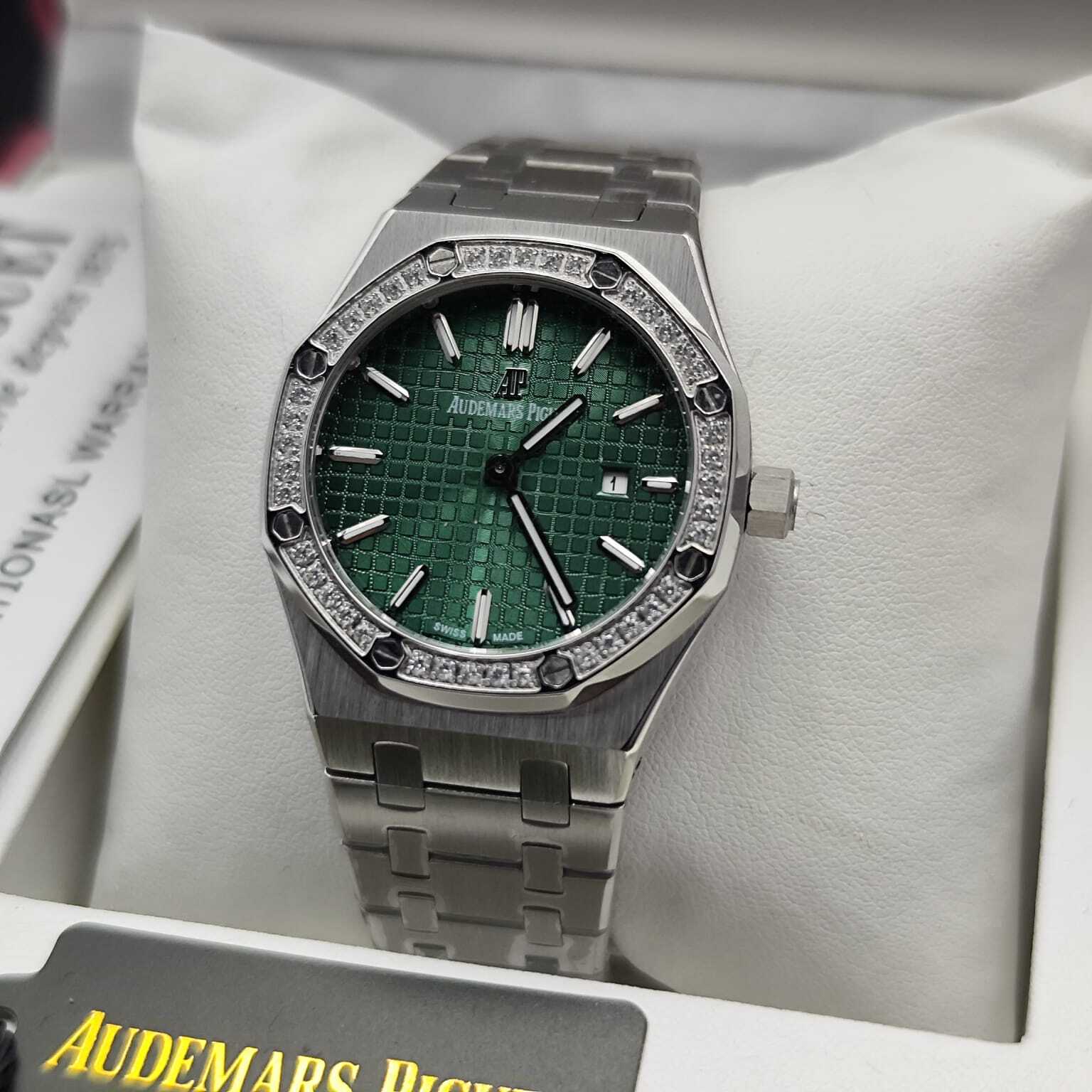ساعة أوديمار بيغيه رويال أوك بتصميم فاخر، هيكل ستانلس ستيل مع إطار مرصع بالأحجار، نقوش مميزة. تعمل بحركة كوارتز (بطارية)، وتتميز بعقارب ومؤشرات مضيئة مع عرض للتاريخ. جودة كوبي ون عالية وتأتي مع علبة وإكسسوارات فاخرة.