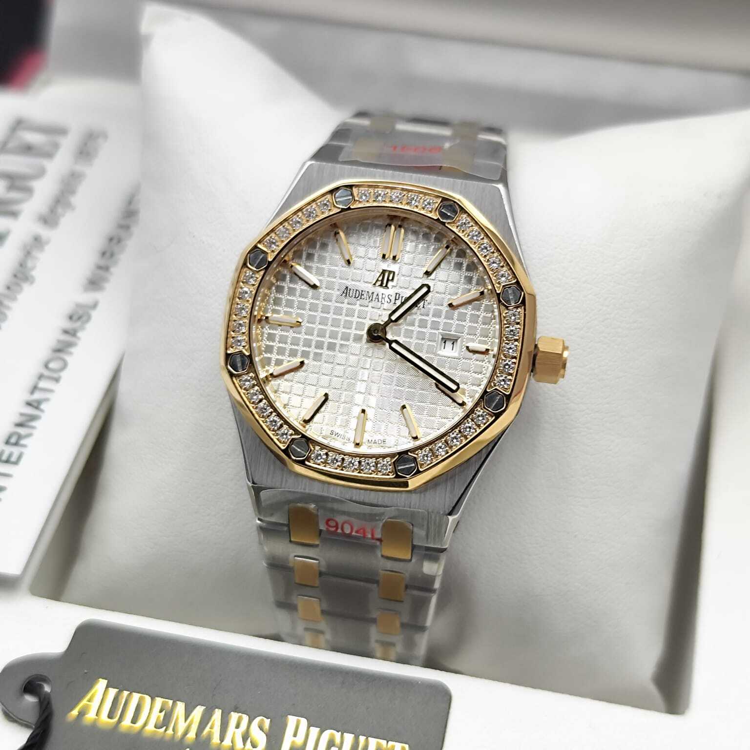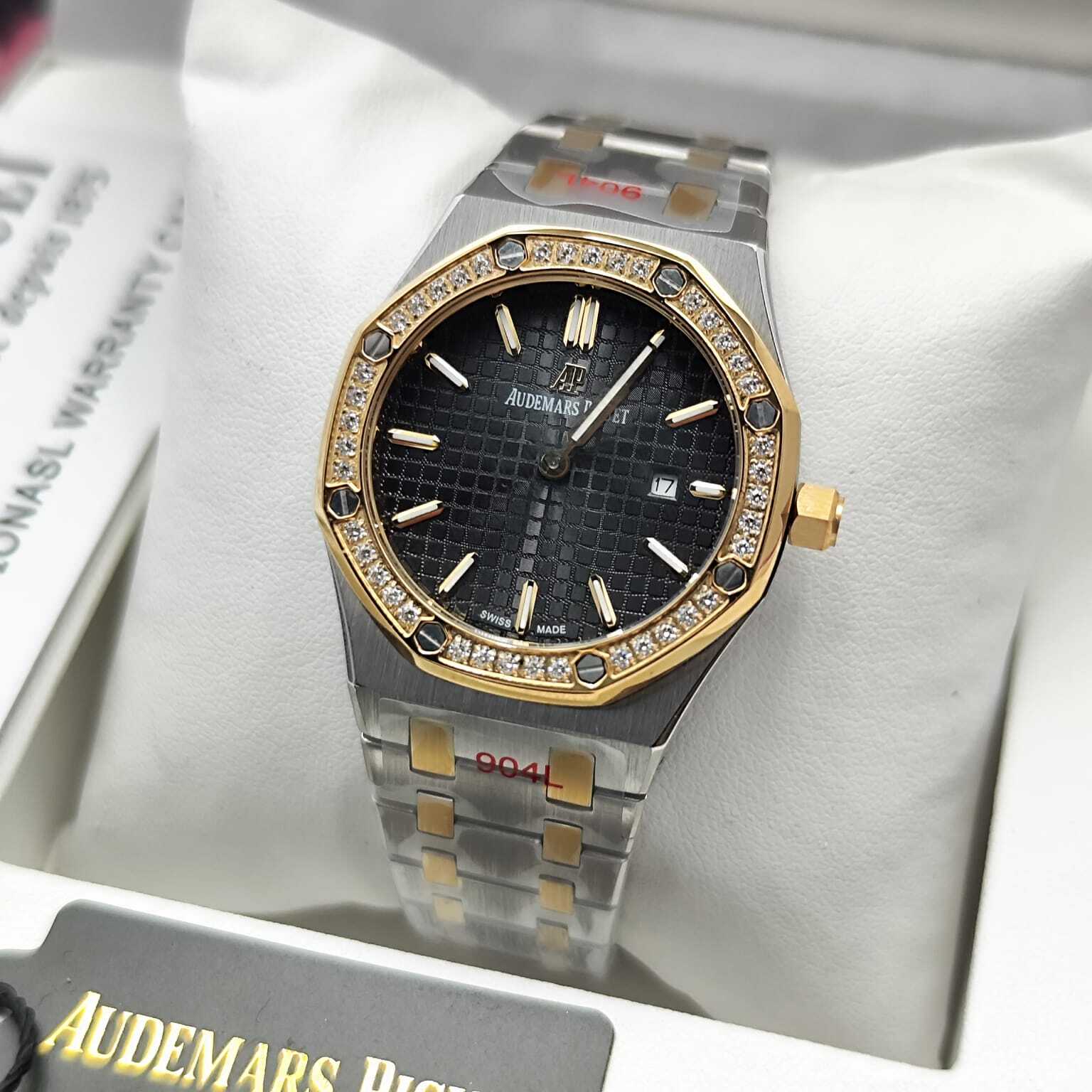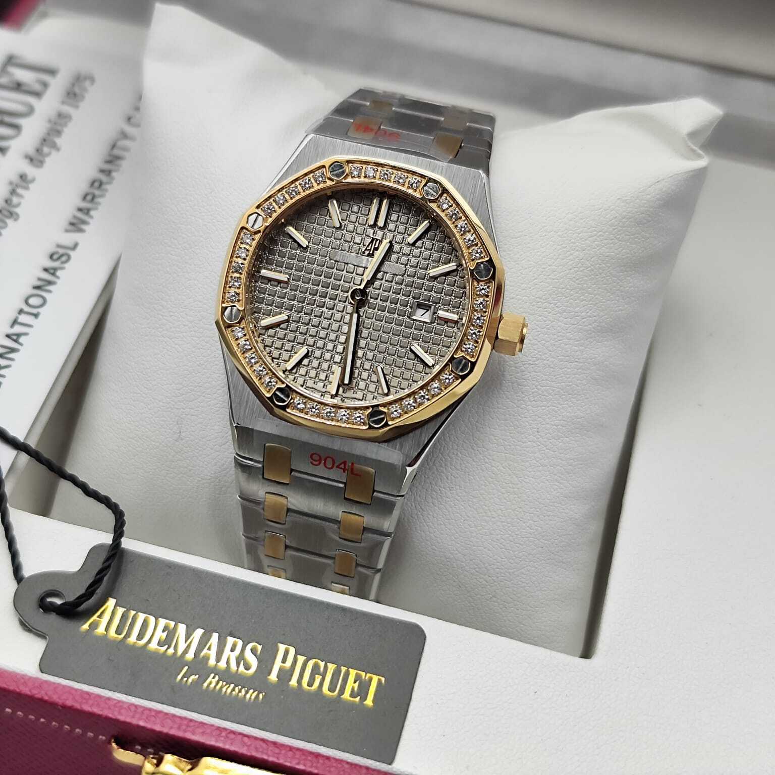 ساعة أوديمار بيغيه رويال أوك بتصميم فاخر، هيكل ستانلس ستيل مع إطار مرصع بالأحجار، نقوش مميزة. تعمل بحركة كوارتز وتتميز بعقارب ومؤشرات مضيئة مع عرض للتاريخ. جودة كوبي ون عالية وتأتي مع علبة وإكسسوارات فاخرة.