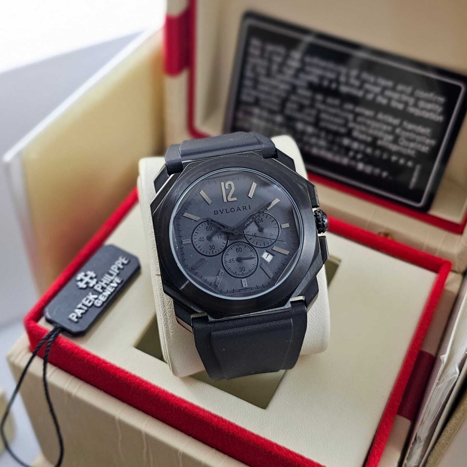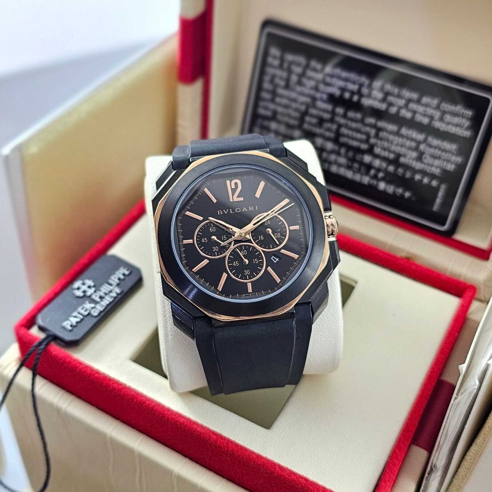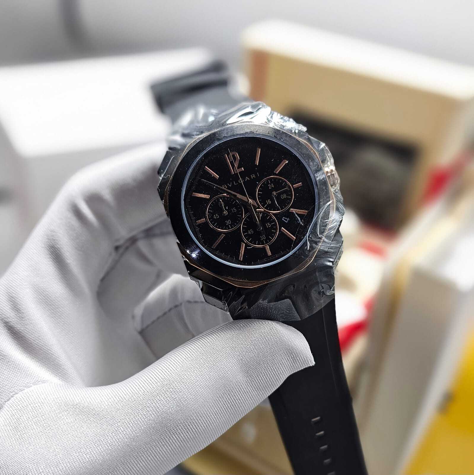 ساعة بولغاري كونوغراف رجالية بتصميم رياضي فاخر، تعمل بالبطارية مع خاصية الكرونوغراف وستوب ووتش. تأتي بهيكل متين ومزيج أنيق من color الأسود والذهبي، مع سوار ربل عالي الجودة لراحة مثالية وأناقة عصرية.