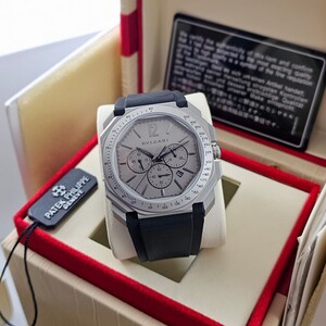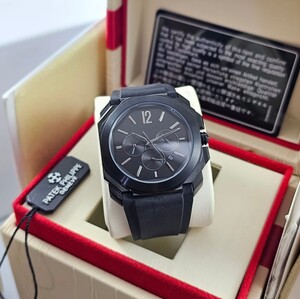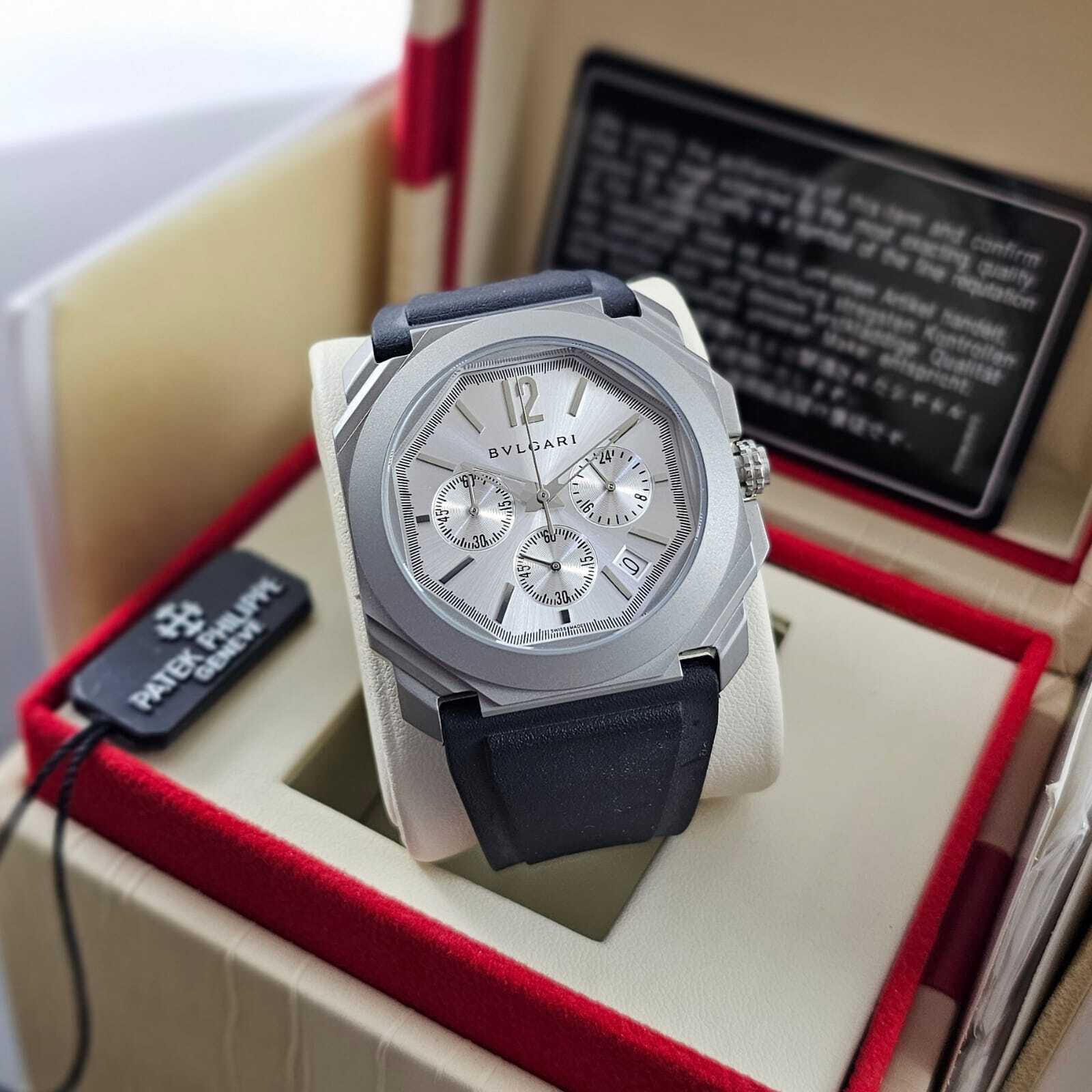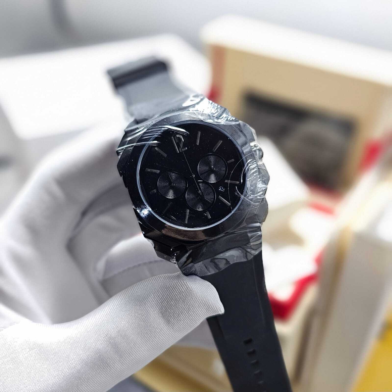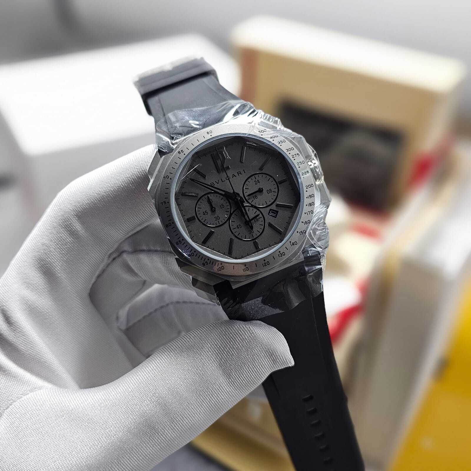 ساعة بولغاري كونوغراف رجالية بتصميم رياضي فاخر، تعمل بالبطارية مع خاصية الكرونوغراف وستوب ووتش. تأتي بهيكل متين ومزيج أنيق من color الأسود والذهبي، مع سوار ربل عالي الجودة لراحة مثالية وأناقة عصرية.