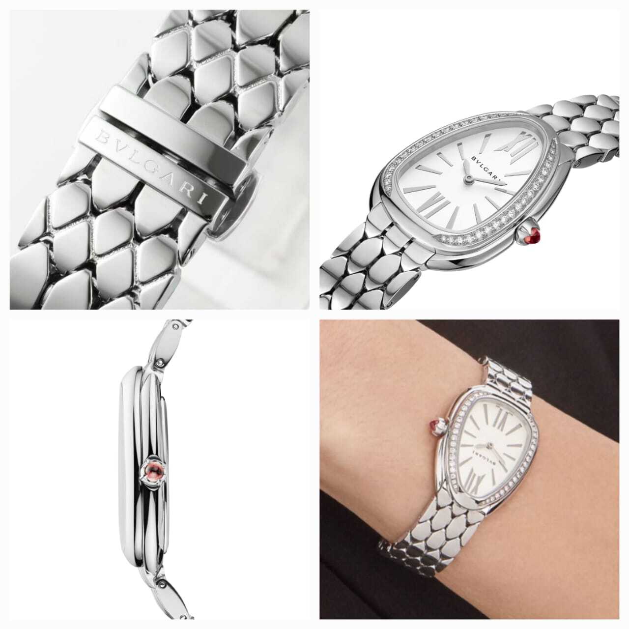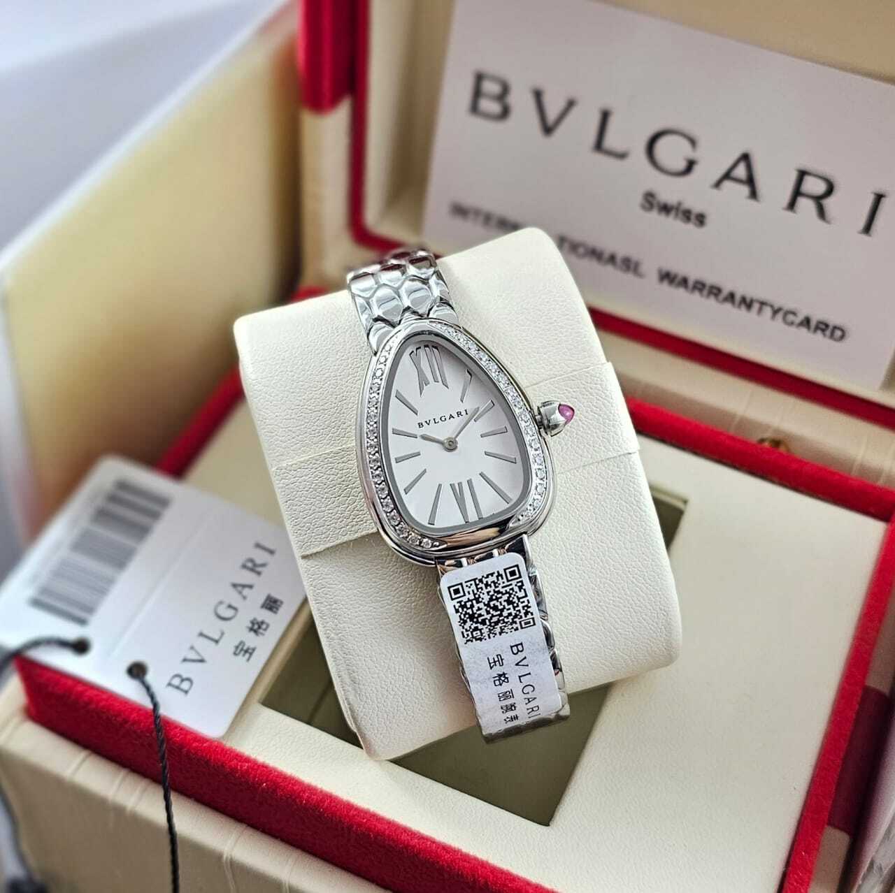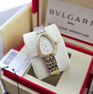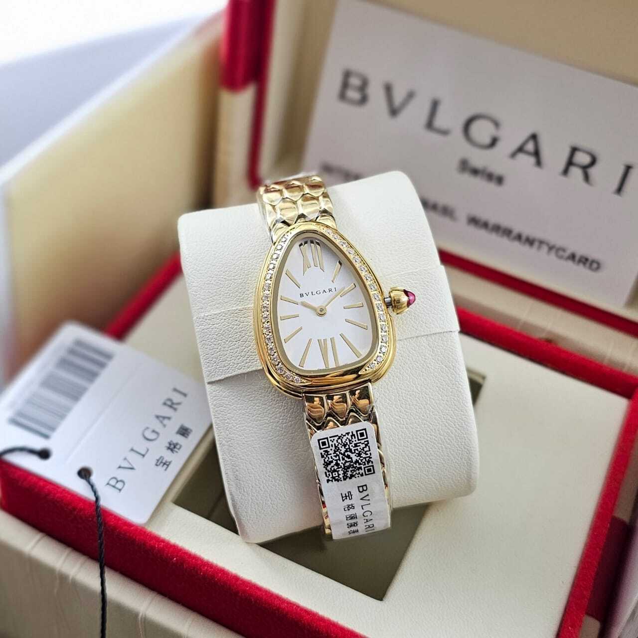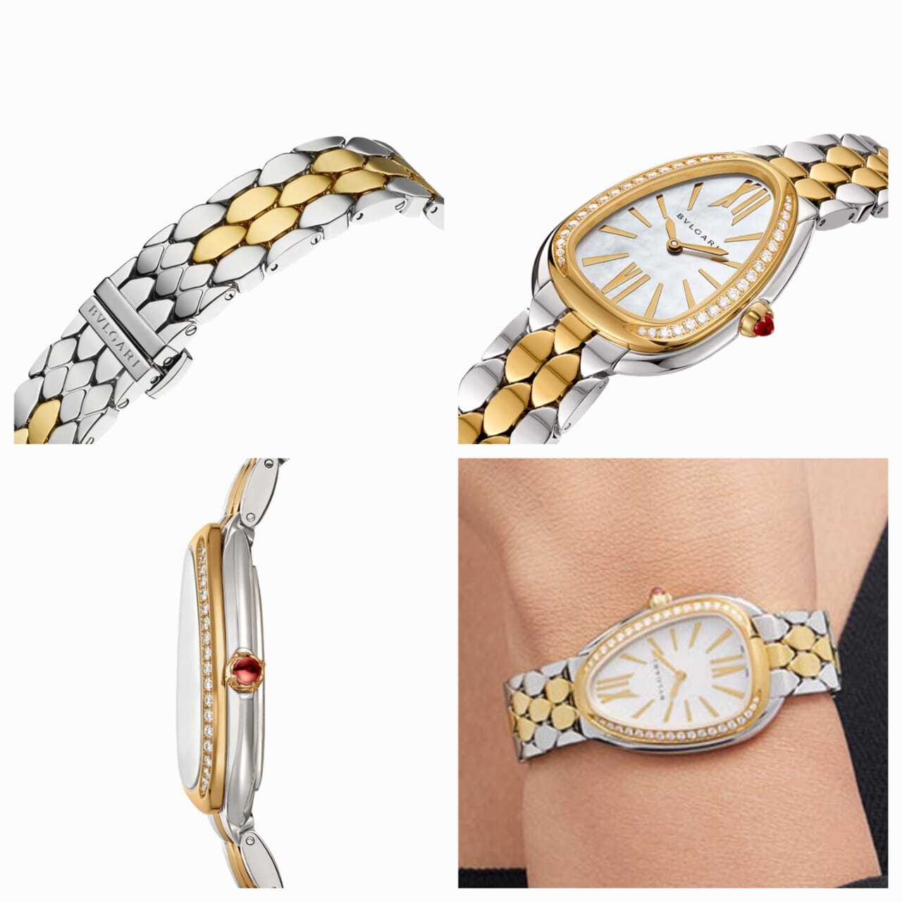 ساعة بولغاري سيربنتي النسائية بتصميم فاخر يجمع بين color الذهبي والفضي. ميناء أبيض وإطار أنيق، مع تاج مزين بحجر كابوشون. السوار بتصميم متداخل مستوحى من شكل الأفعى، ليعكس الأناقة العصرية والأنوثة الراقية.