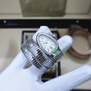 ساعة بولغري سيربنتي النسائية بتصميم الثعبان الأيقوني الذي يعكس الفخامة والجرأة. هيكل ستانلس ستيل بجودة عالية، ميناء أنيق، وسوار ملتف مرصع اللمعة يمنح المعصم حضورًا راقيًا. تعمل بالبطارية وتأتي بملحقات كاملة، مناسبة للهدايا والإطلالات الفاخرة.