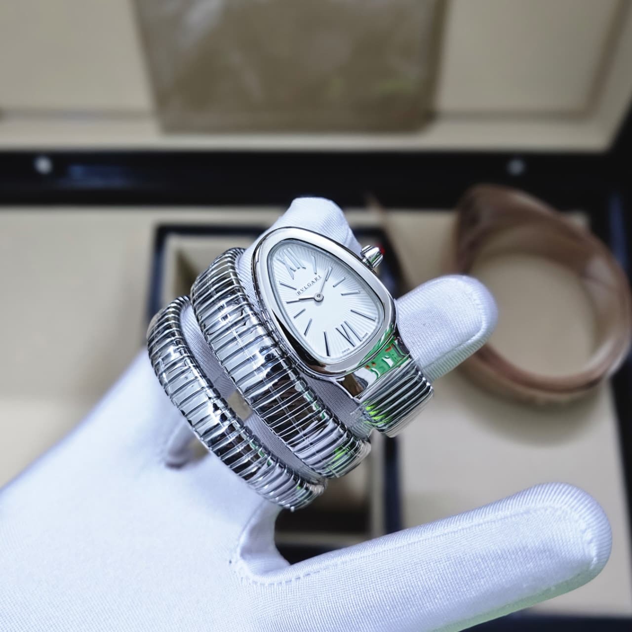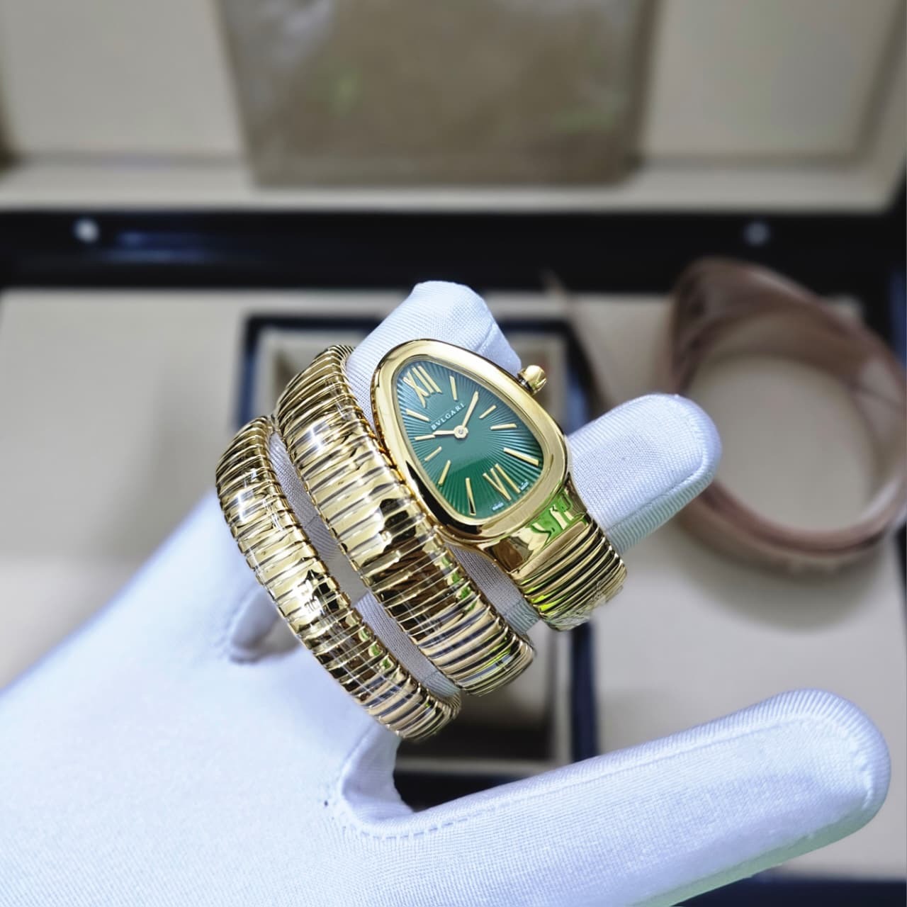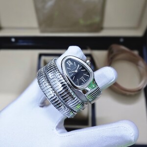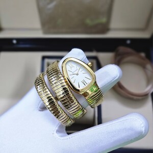 ساعة بولغري سيربنتي النسائية بتصميم الثعبان الأيقوني الذي يعكس الفخامة والجرأة. هيكل ستانلس ستيل بجودة عالية، ميناء أنيق، وسوار ملتف مرصع اللمعة يمنح المعصم حضورًا راقيًا. تعمل بالبطارية وتأتي بملحقات كاملة، مناسبة للهدايا والإطلالات الفاخرة.