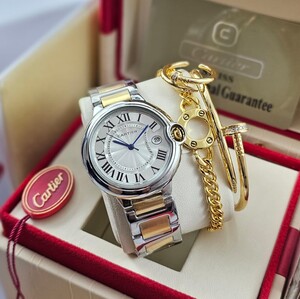 ساعة كارتير بالون بلو نسائية بتصميم فاخر من الستانلس ستيل الذهبي، ميناء أبيض بأرقام رومانية وسوار معدني أنيق. لمسة فخمة تكمّل أناقة المرأة العصرية وتمنحها حضورًا راقيًا في كل مناسبة