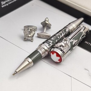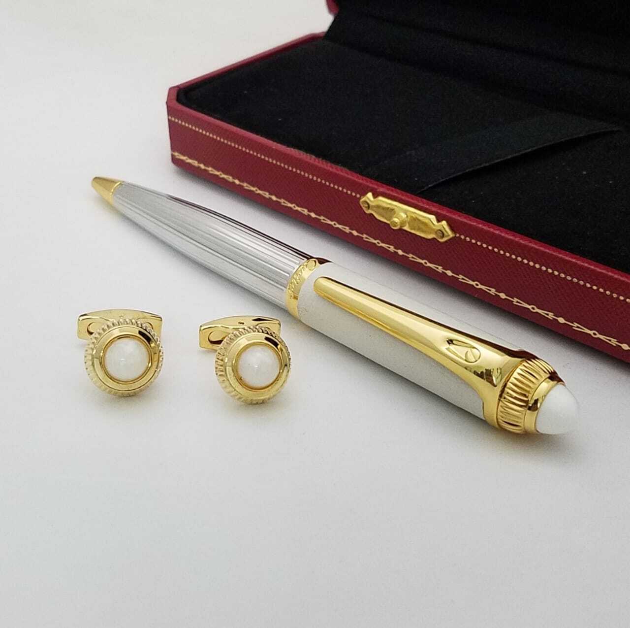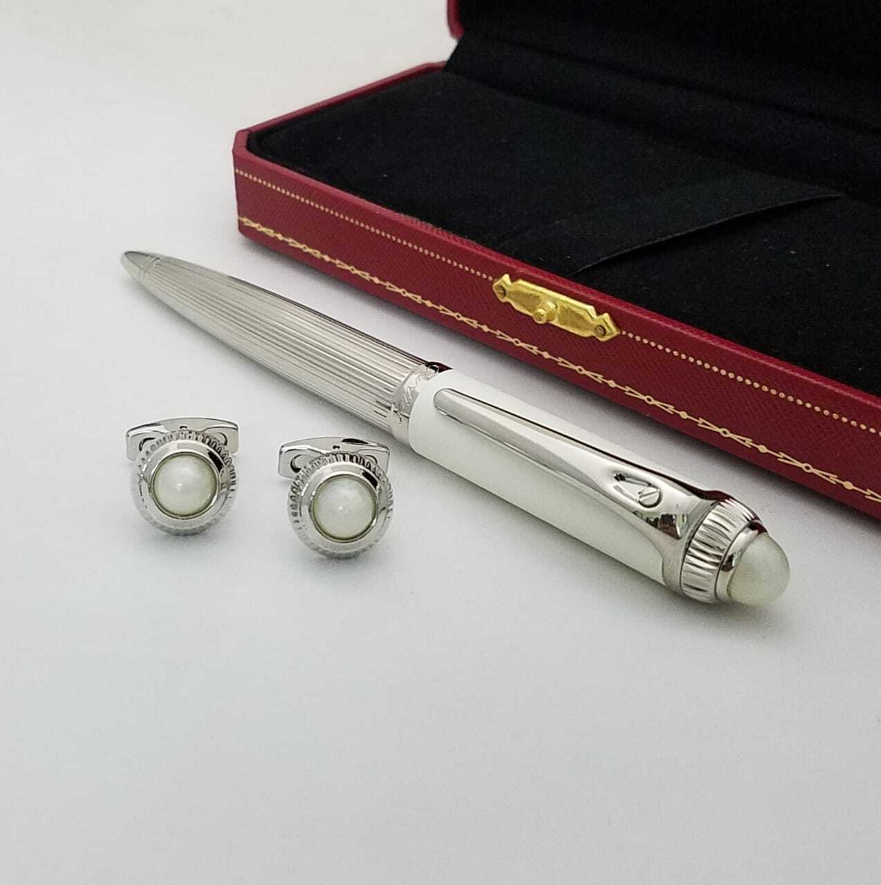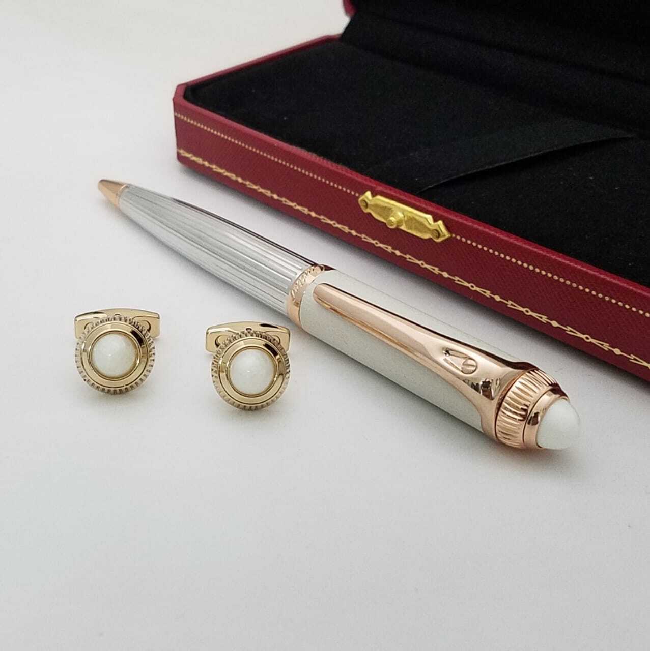 قلم فاخر بتصميم أنيق يجمع بين الفخامة والإبداع، مصنوع بدقة متناهية مع لمسات راقية. يرافقه زوج من الأزرار الفاخرة المزينة بحجر أنيق، ما يجعله هدية مثالية لأصحاب الذوق الرفيع.