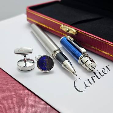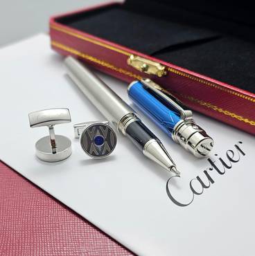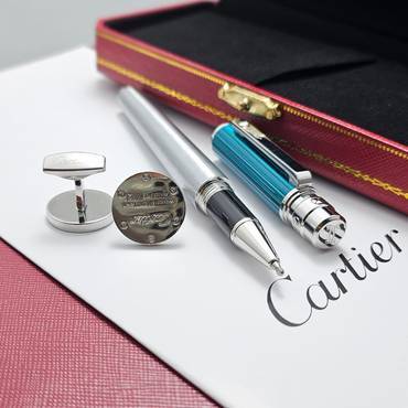 طقم كارتير الفاخر المصمم بأناقة عالية، يضم قلم حبر راقٍ بلمسات فضية وزرقاء عصرية، مصنوع من مواد فاخرة تعكس الحرفية المتقنة. بالإضافة إلى أزرار أكمام أنيقة بتصميم مربع فخم مستوحى من أسلوب كارتير الكلاسيكي. يأتي في علبة فاخرة، ما يجعله