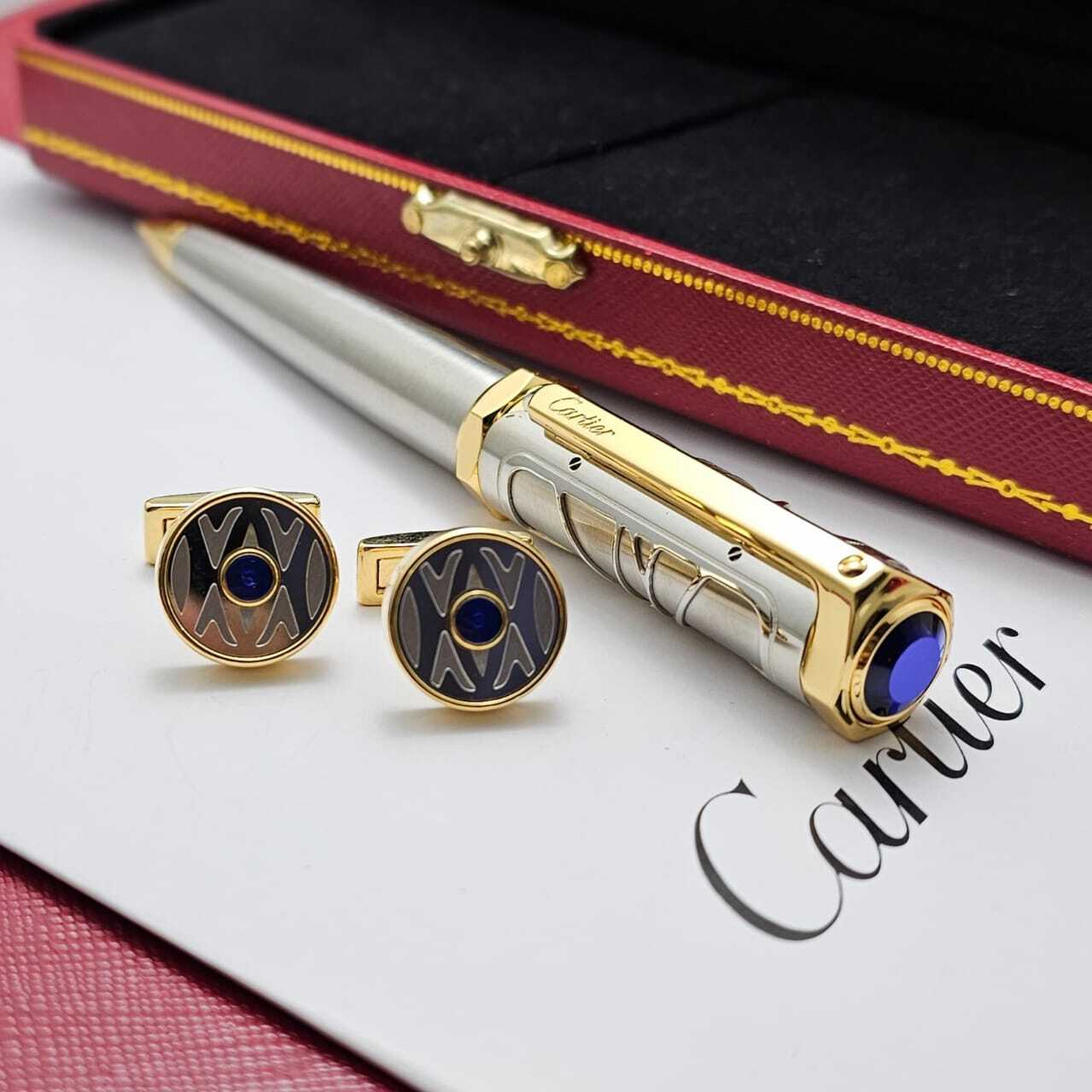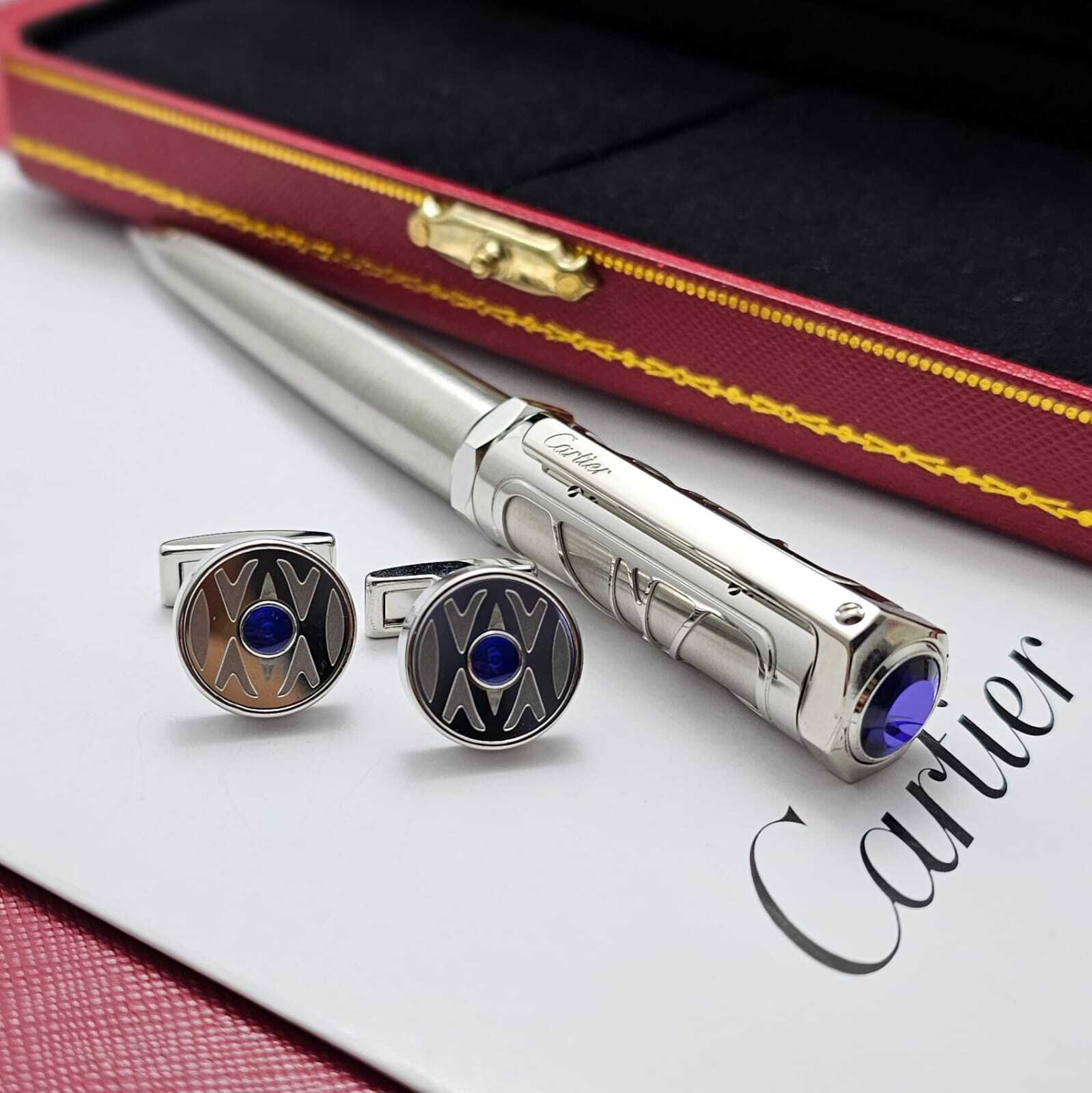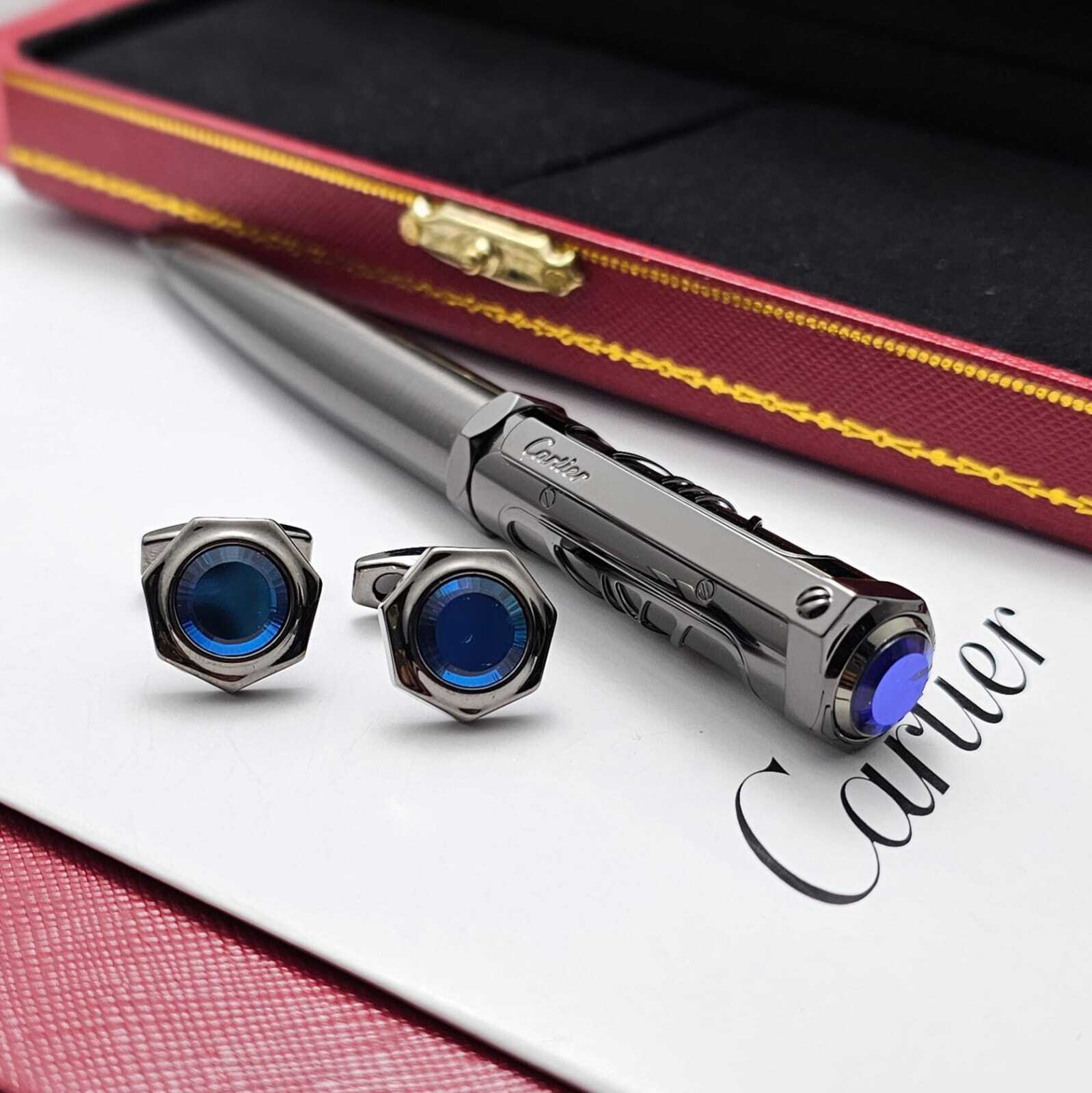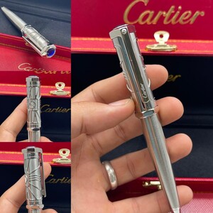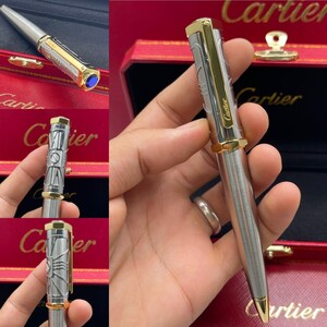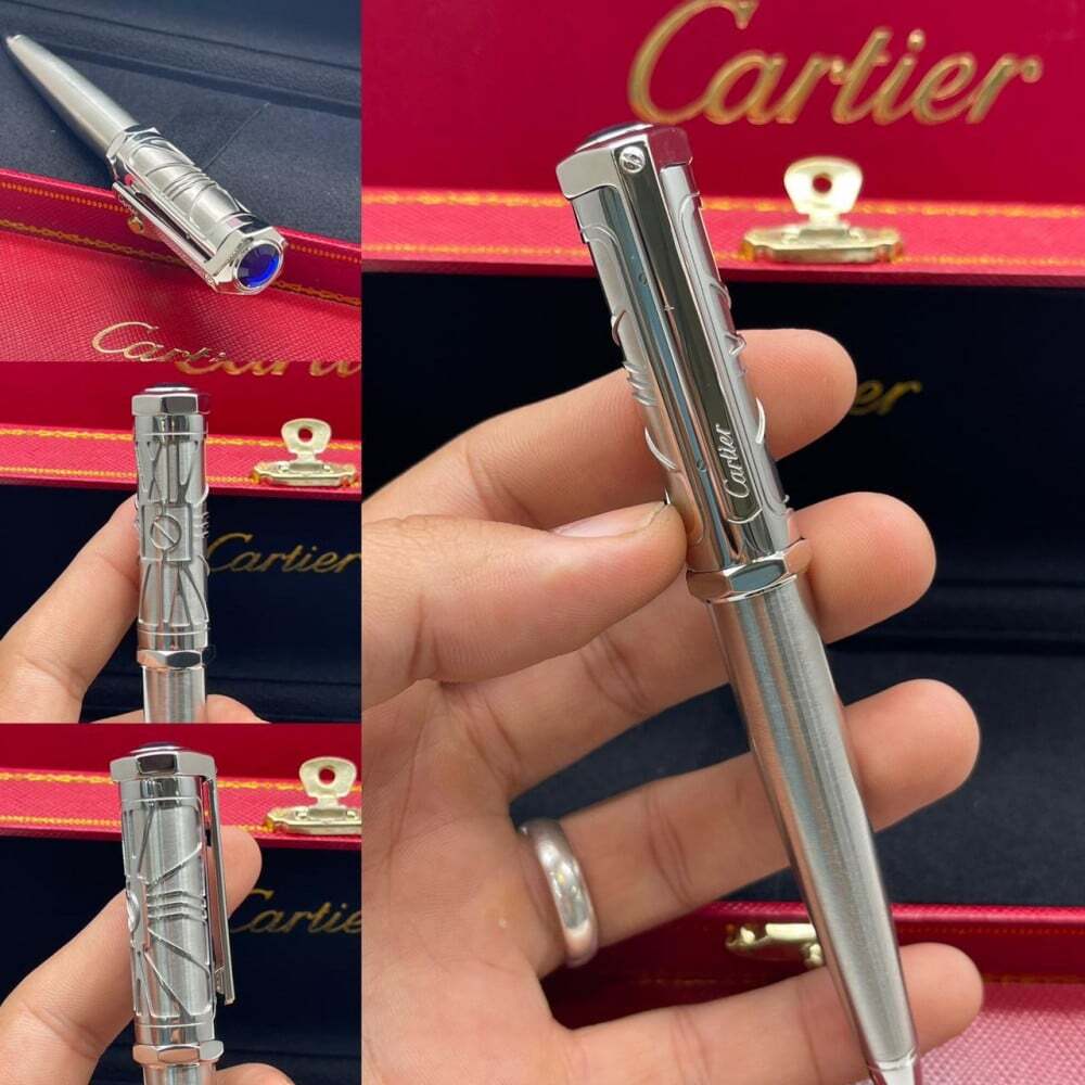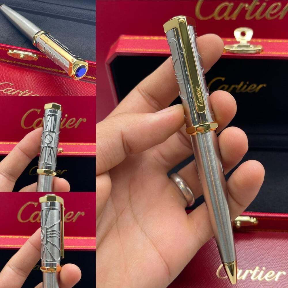 قلم كارتير الفاخر بتصميم أنيق يجمع بين الفضي والذهبي مع لمسات زرقاء راقية. تحفة فنية تعكس الفخامة والدقة في كل تفصيلة، ليكون خيارًا مثاليًا لأصحاب الذوق الرفيع وعشاق الكتابة بأسلوب راقٍ ومميز.