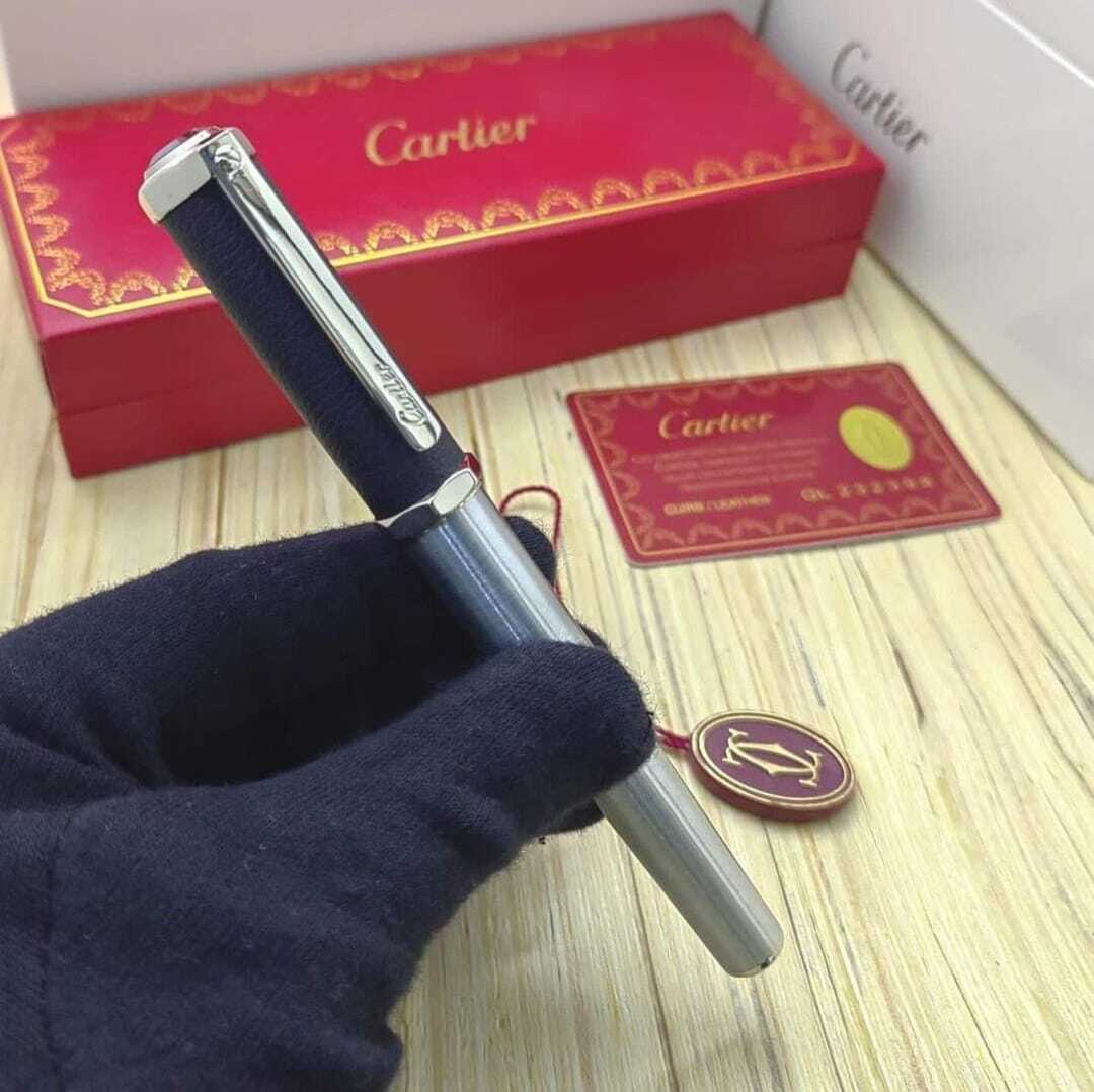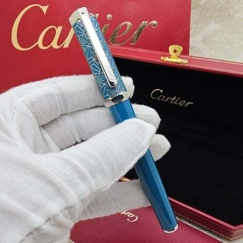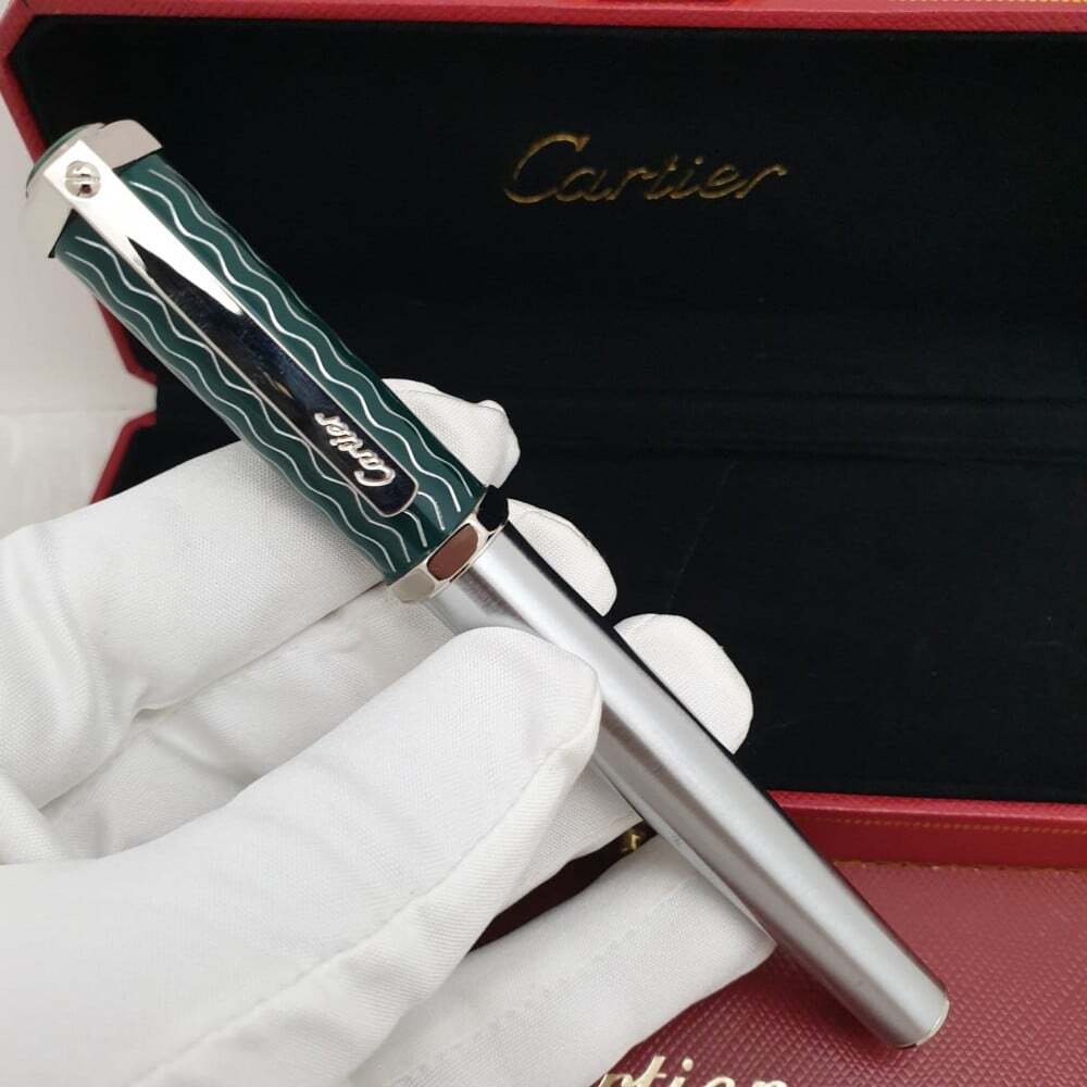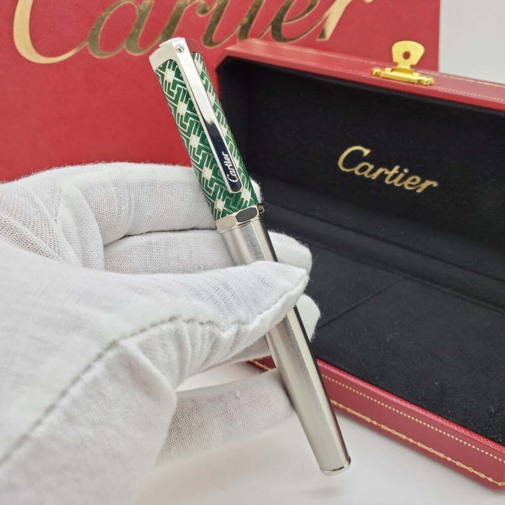 تحفة راقية من كارتييه! قلم فاخر بcolor الأخضر العميق، بتصميم أنيق ونقوش هندسية فريدة على الغطاء. يجمع بين الحرفية العالية والفخامة، ليمنحك تجربة كتابة سلسة وأداء مثالي. إضافة رائعة لهواة التميز والرقي.