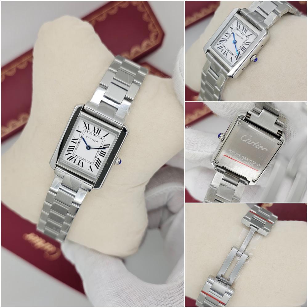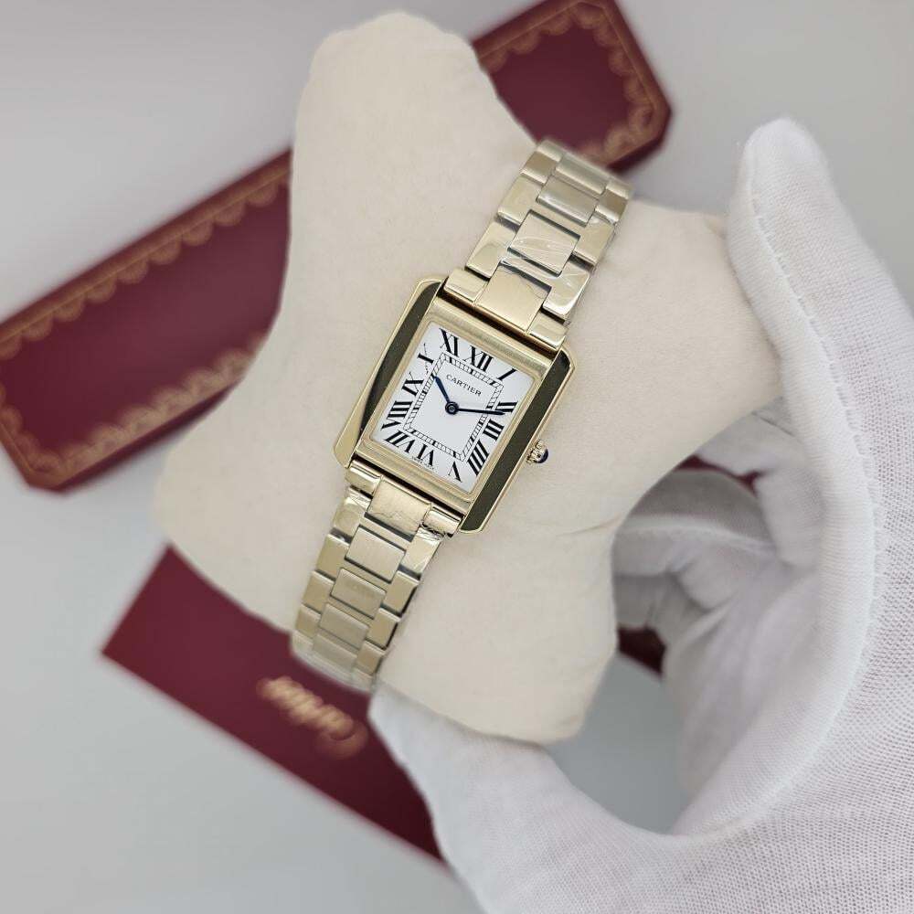 ساعة كارتييه تانك النسائية بتصميم مستطيل أنيق يعكس العراقة والرقي. ميناء أبيض بأرقام رومانية، وهيكل ذهبي لامع بأبعاد 29×22 مم. مزودة بمكينة كوارتز فائقة الدقة، وسوار ستانلس مريح، لتكون رمزًا للجمال الكلاسيكي.
