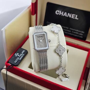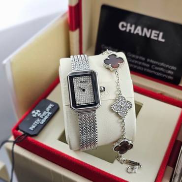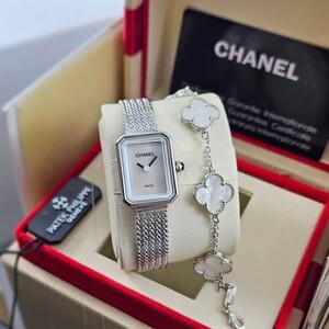 ساعة CHANEL PREMIÈRE بتصميم فريد يجمع بين الفخامة والبساطة، ميناء مرصع بالكامل بفصوص براقة تعكس الضوء بسحر، مع سوار شبكي فاخر وهيكل من الستانلس ستيل المقاوم للصدأ. لمسة أنيقة تكمّل إطلالتك الراقية. جودة كوبي ون، مرفقة بكام