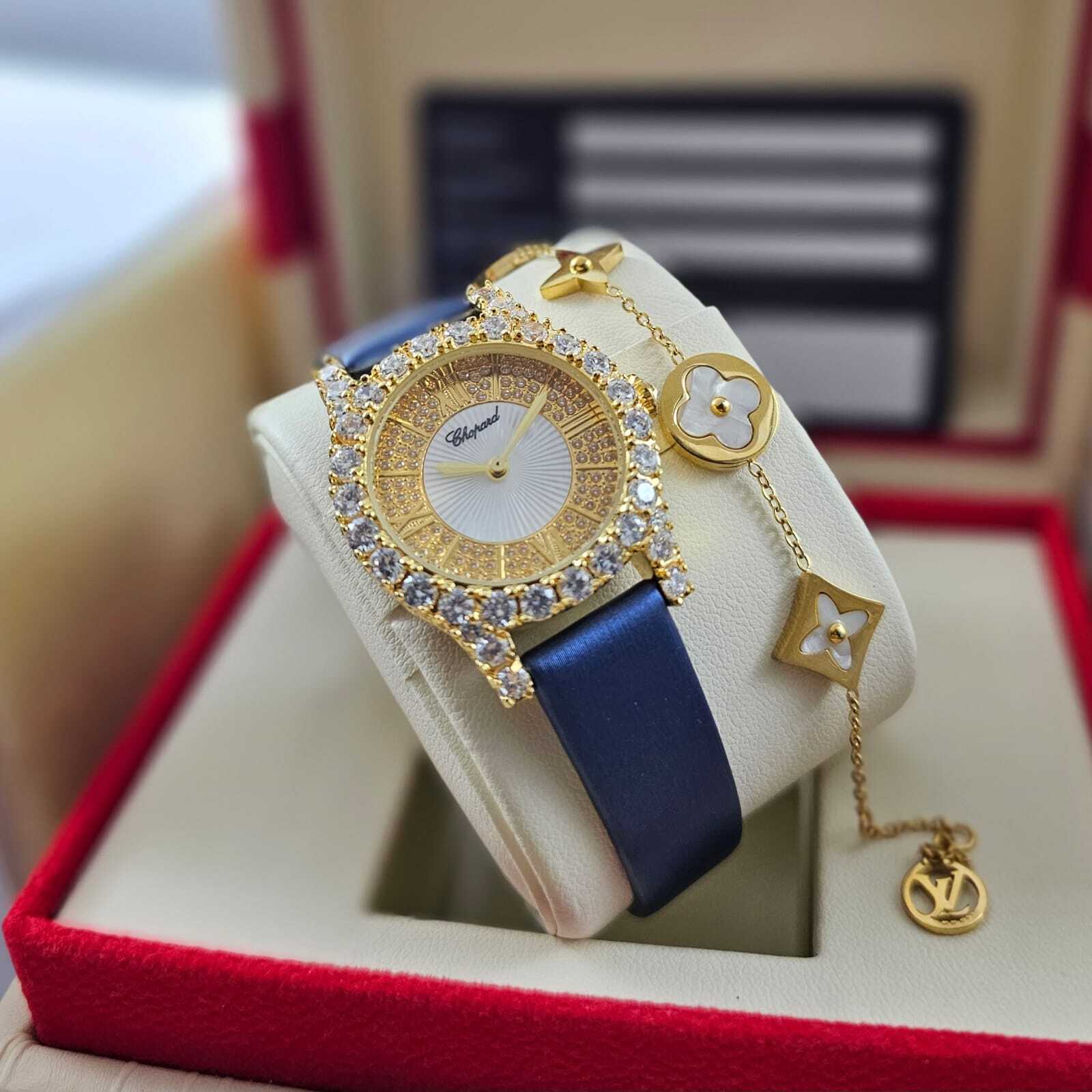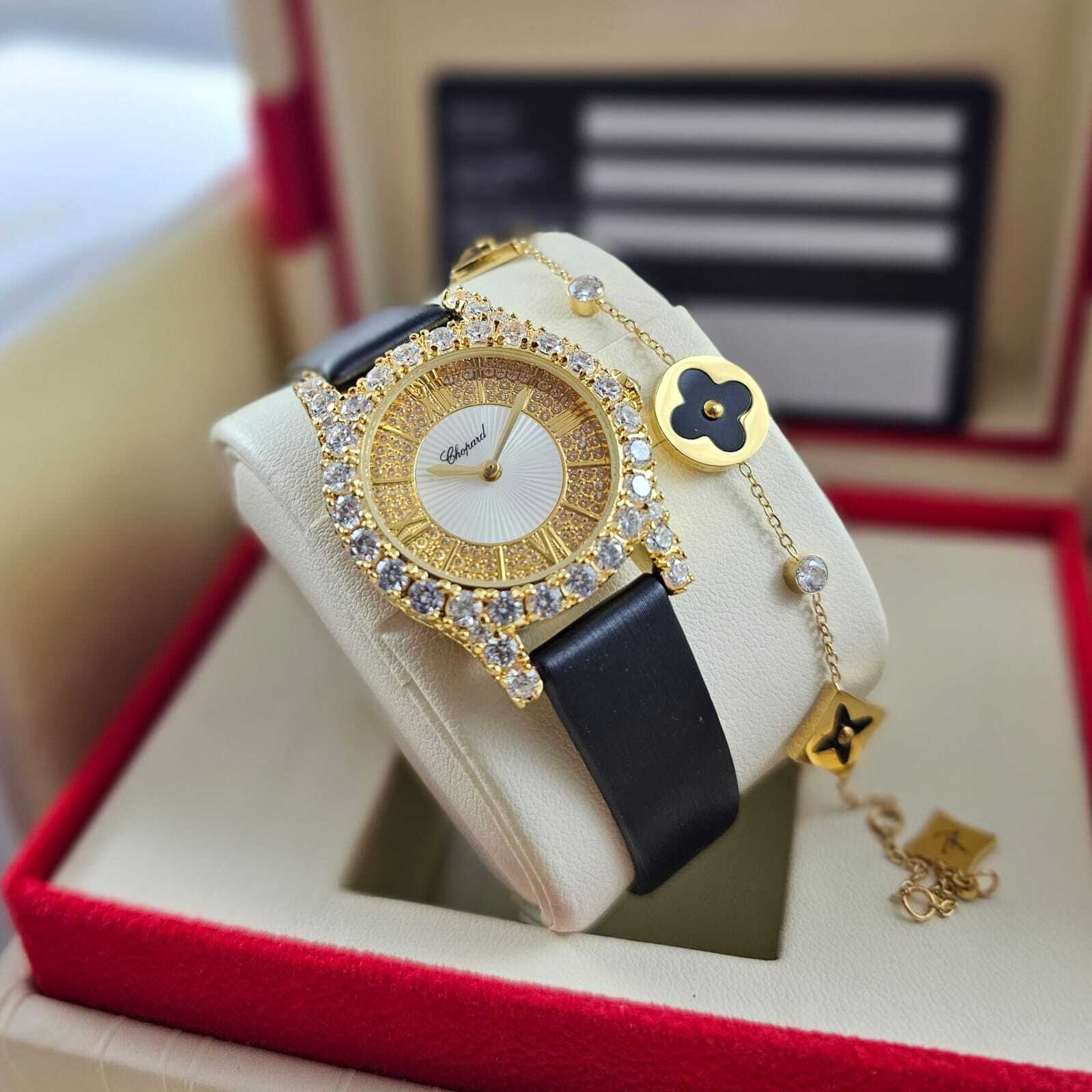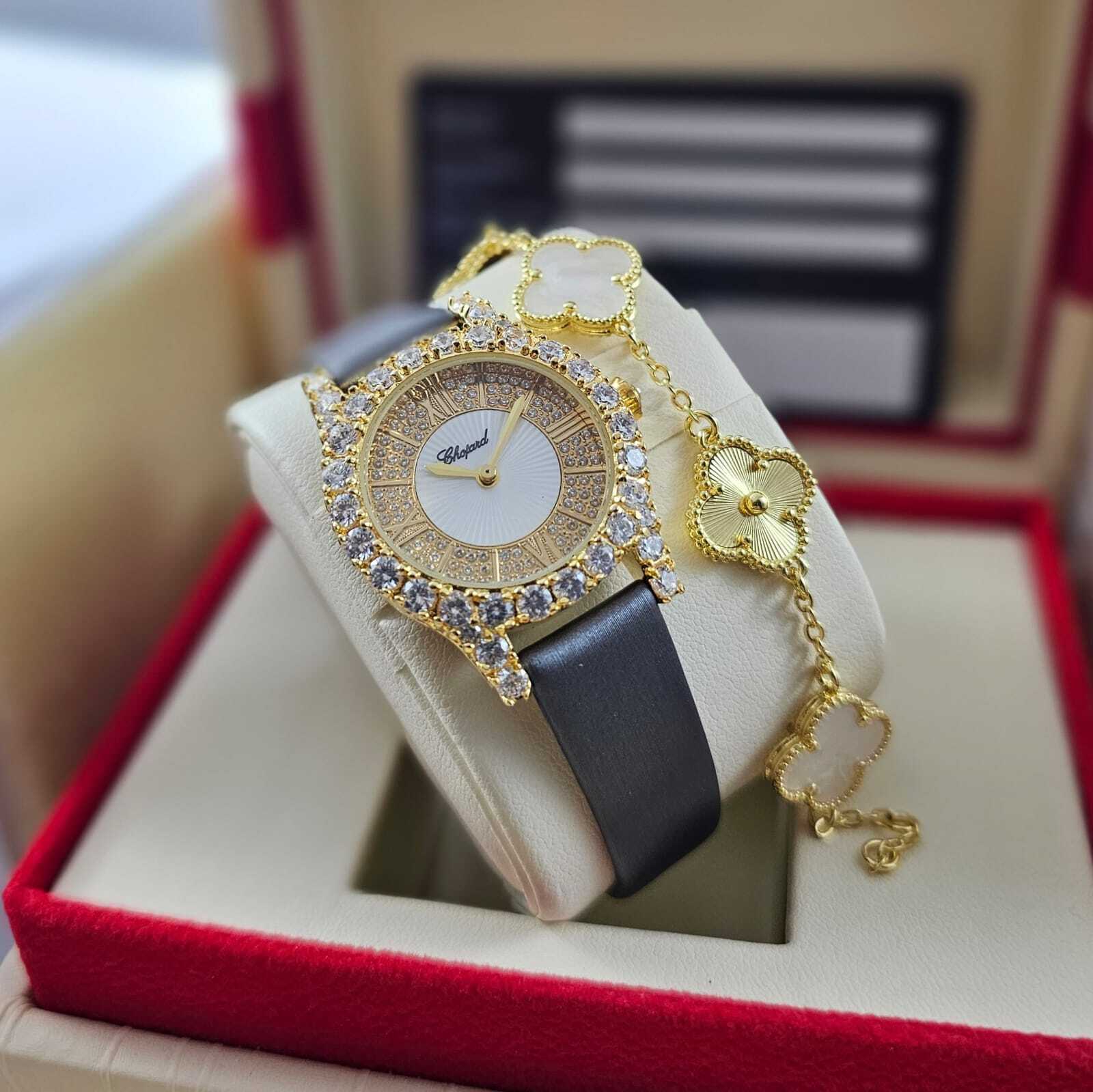 تألقي بإطلالة فاخرة مع ساعة شوبارد المذهلة، بتصميم ذهبي فاخر مرصع بالأحجار البراقة، مع ميناء أنيق وسوار جلد يضفي لمسة راقية. تجمع بين الأناقة والفخامة، مما يجعلها الخيار المثالي لمحبي التميز.