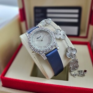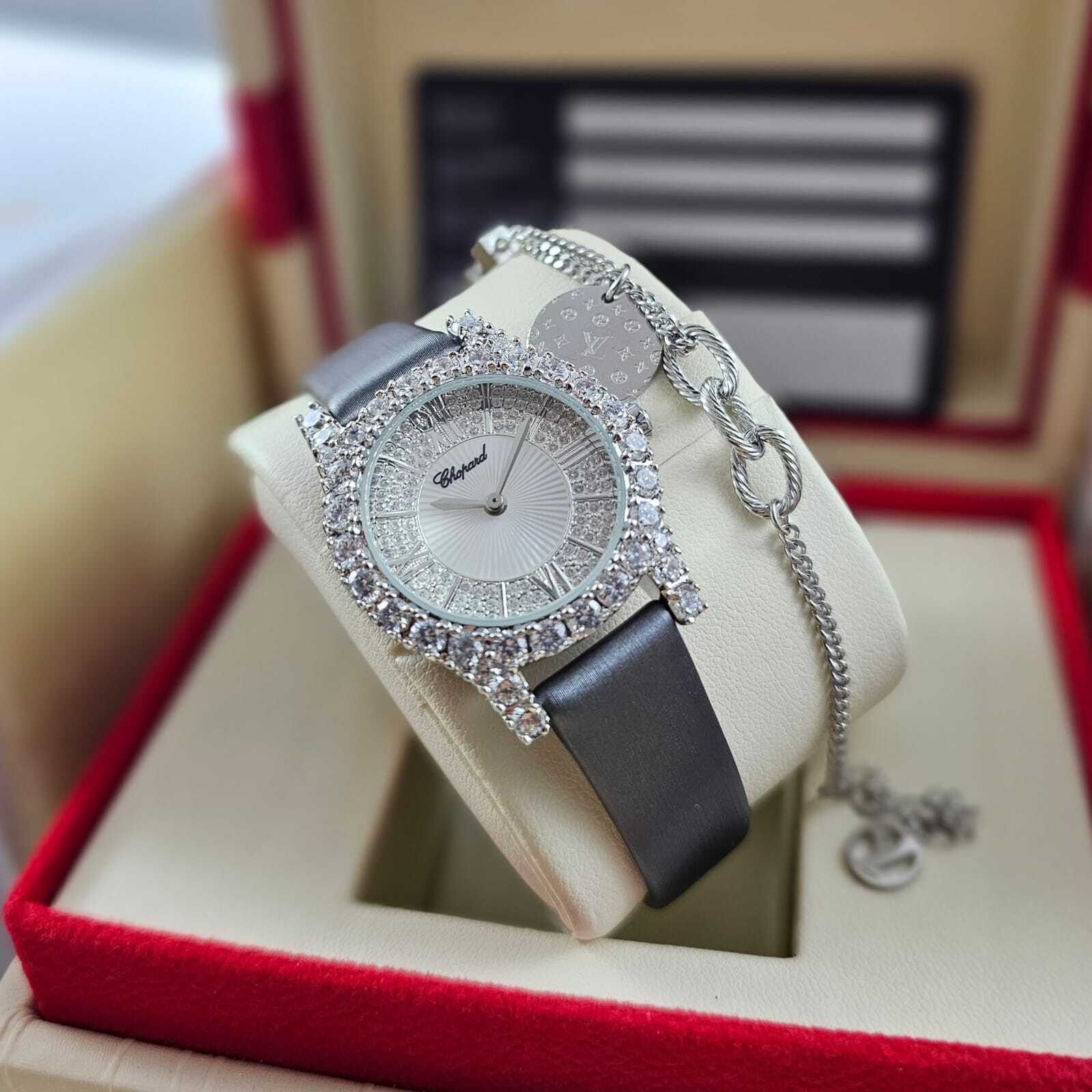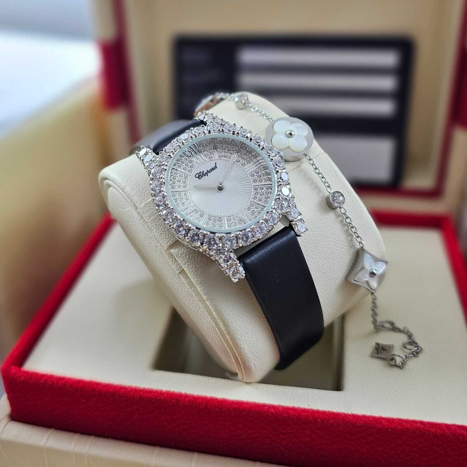 تألقي بإطلالة فاخرة مع ساعة شوبارد المذهلة، بتصميم فضي فاخر مرصع بالأحجار البراقة، مع ميناء أنيق وسوار جلد يضفي لمسة راقية. تجمع بين الأناقة والفخامة، مما يجعلها الخيار المثالي لمحبي التميز.