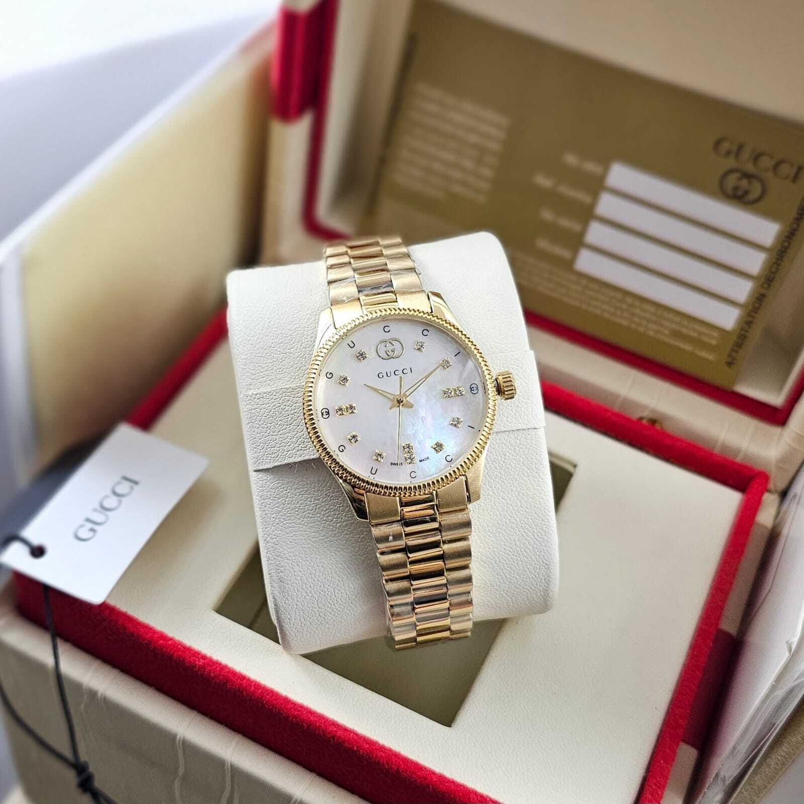 تألقي مع ساعة قوتشي الفاخرة ذات التصميم الذهبي الأنيق. تتميز بميناء أبيض راقٍ مع تفاصيل ذهبية راقية، وسوار معدني فاخر يعكس الفخامة. تجمع هذه الساعة بين الأناقة والجودة العالية لتناسب إطلالتك اليومية والمناسبات الخاصة.