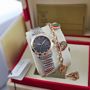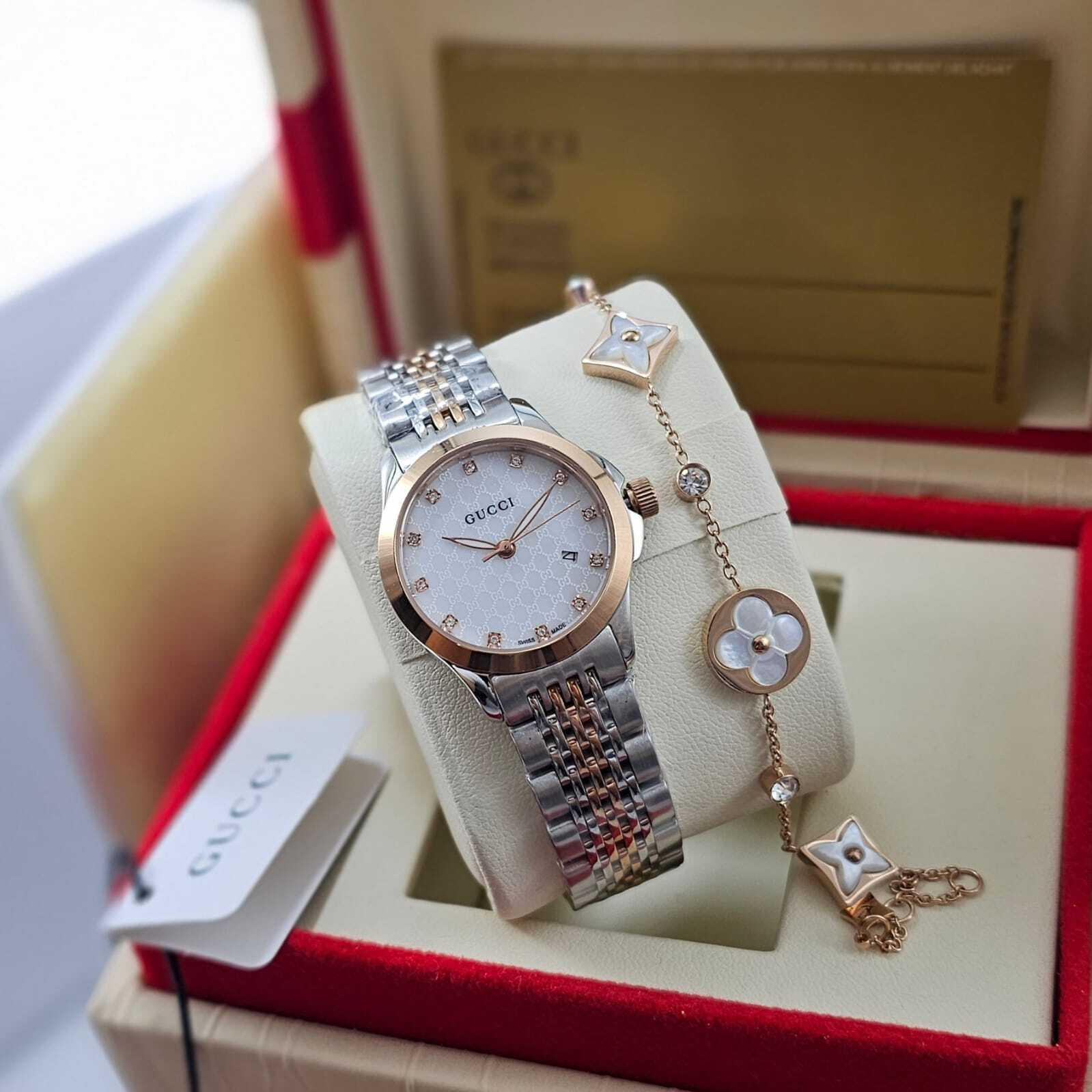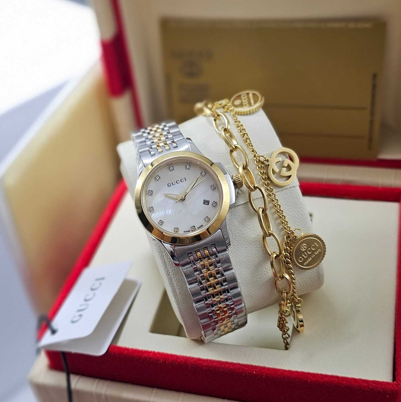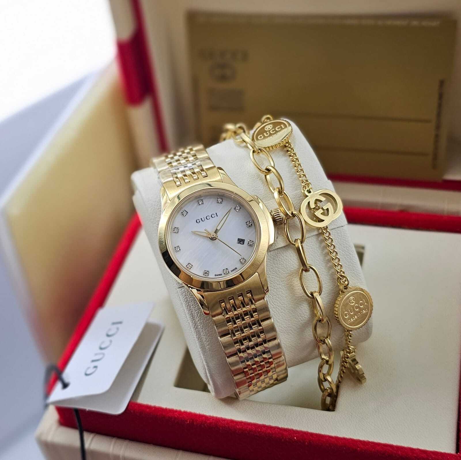 ساعة نسائية فاخرة من قوتشي بتصميم راقٍ يجمع بين الأناقة واللمسات العصرية، تأتي مع إسوارة مطابقة لإطلالة متكاملة تعكس الفخامة والتميز.