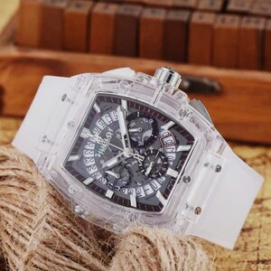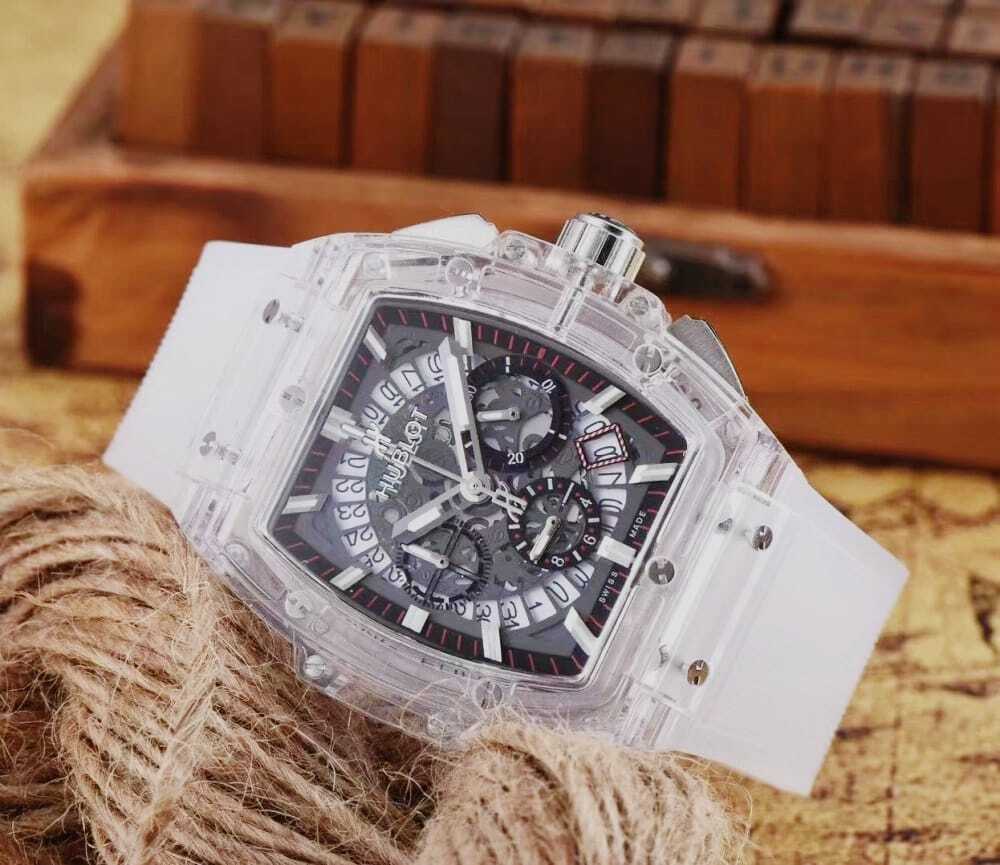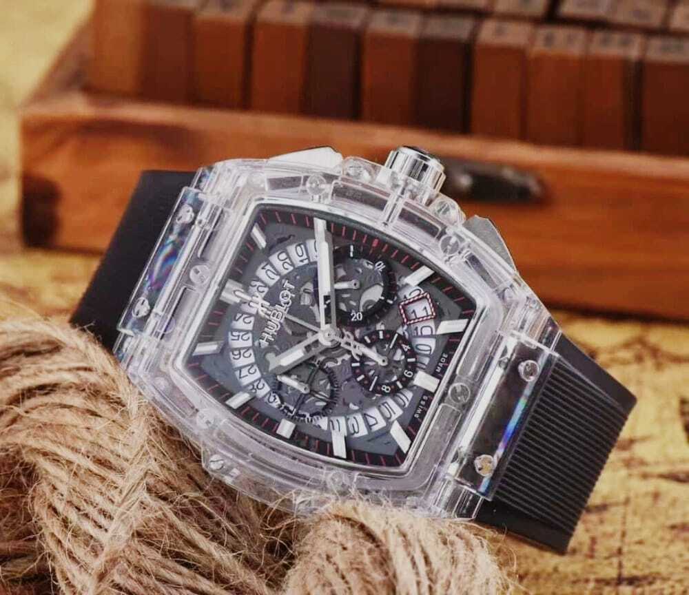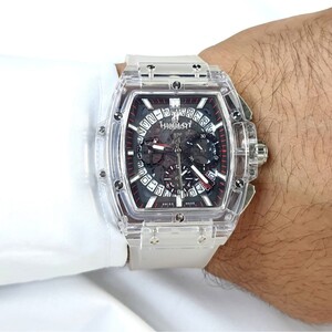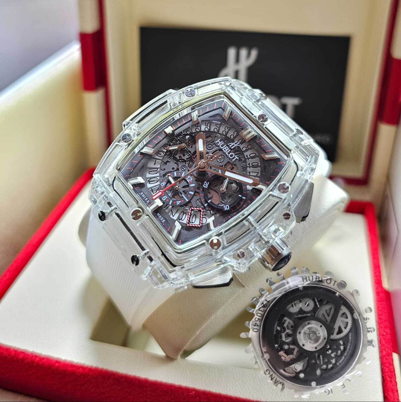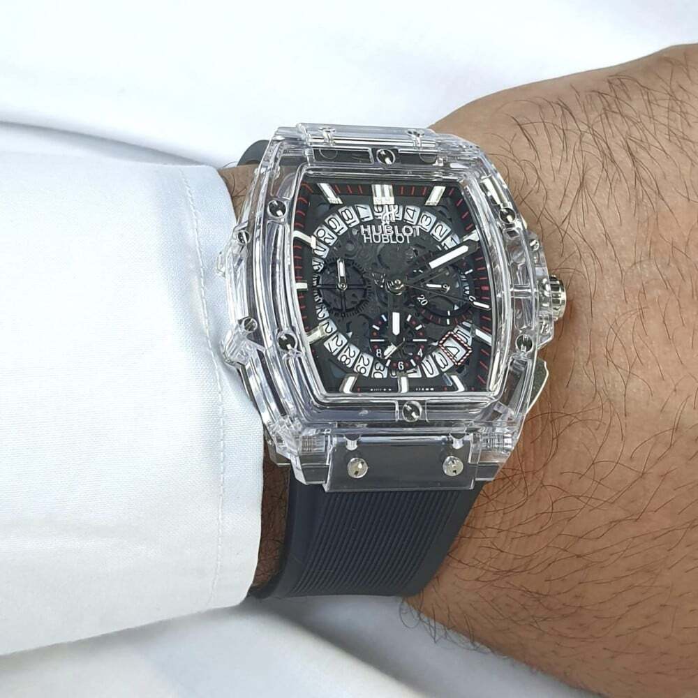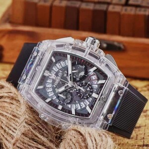 استعد لتجربة فريدة مع ساعة هوبلت الشفافة! تصميمها الجريء والمبتكر يجعل منها قطعة فنية على معصمك. مع مزيجها الرائع بين الشفافية والالوان الداخلبة لهيكل ، ستكون ملفتة لأنظار الجميع.