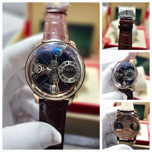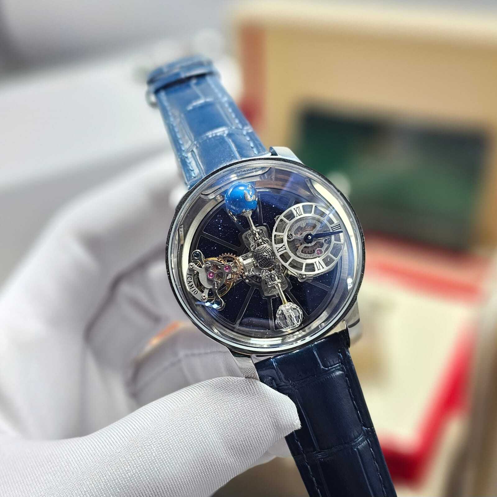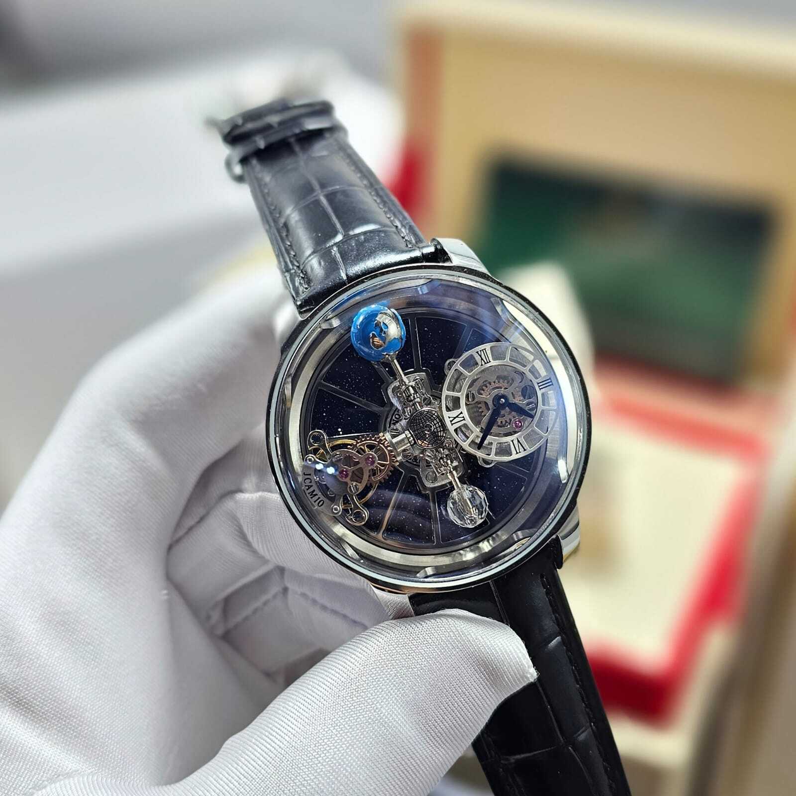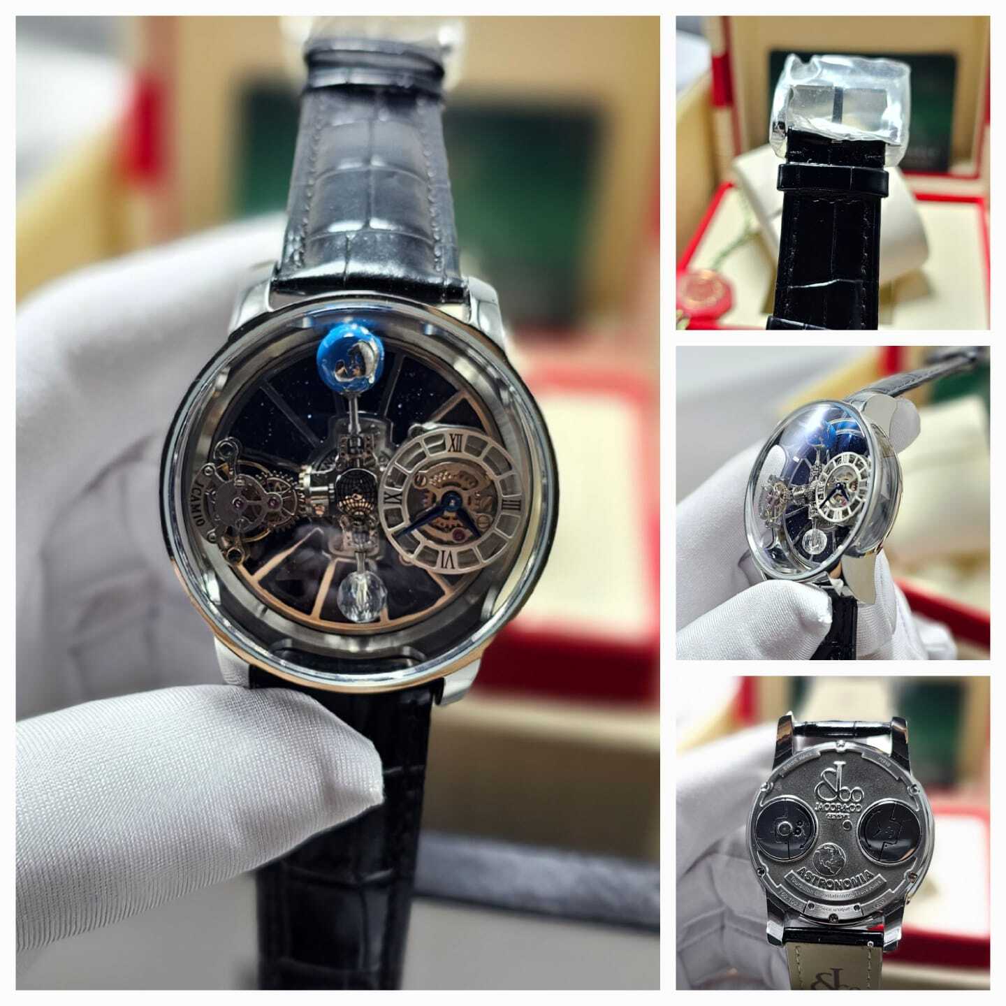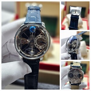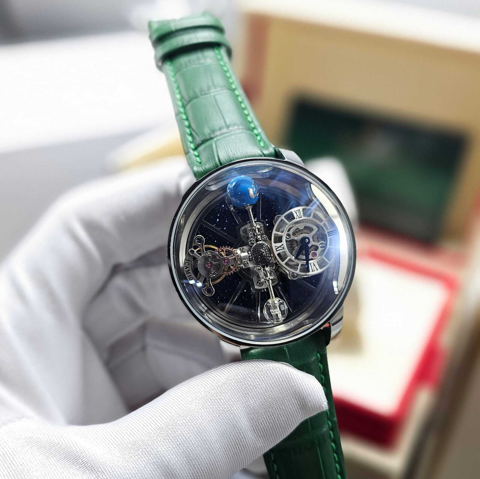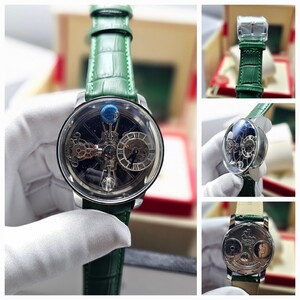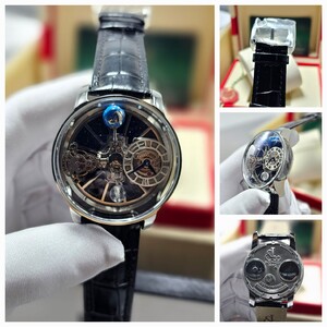 تحفة فنية من Jacob & Co، تتميز بآلية توربيون ثلاثي المحاور بتصميم مستوحى من الفلك. هيكل فاخر من الستانلس ستيل، مع زجاج ياقوتي وسوار جلدي أنيق. دقة هندسية مع أداء ميكانيكي مذهل لمحبي الساعات الفاخرة.