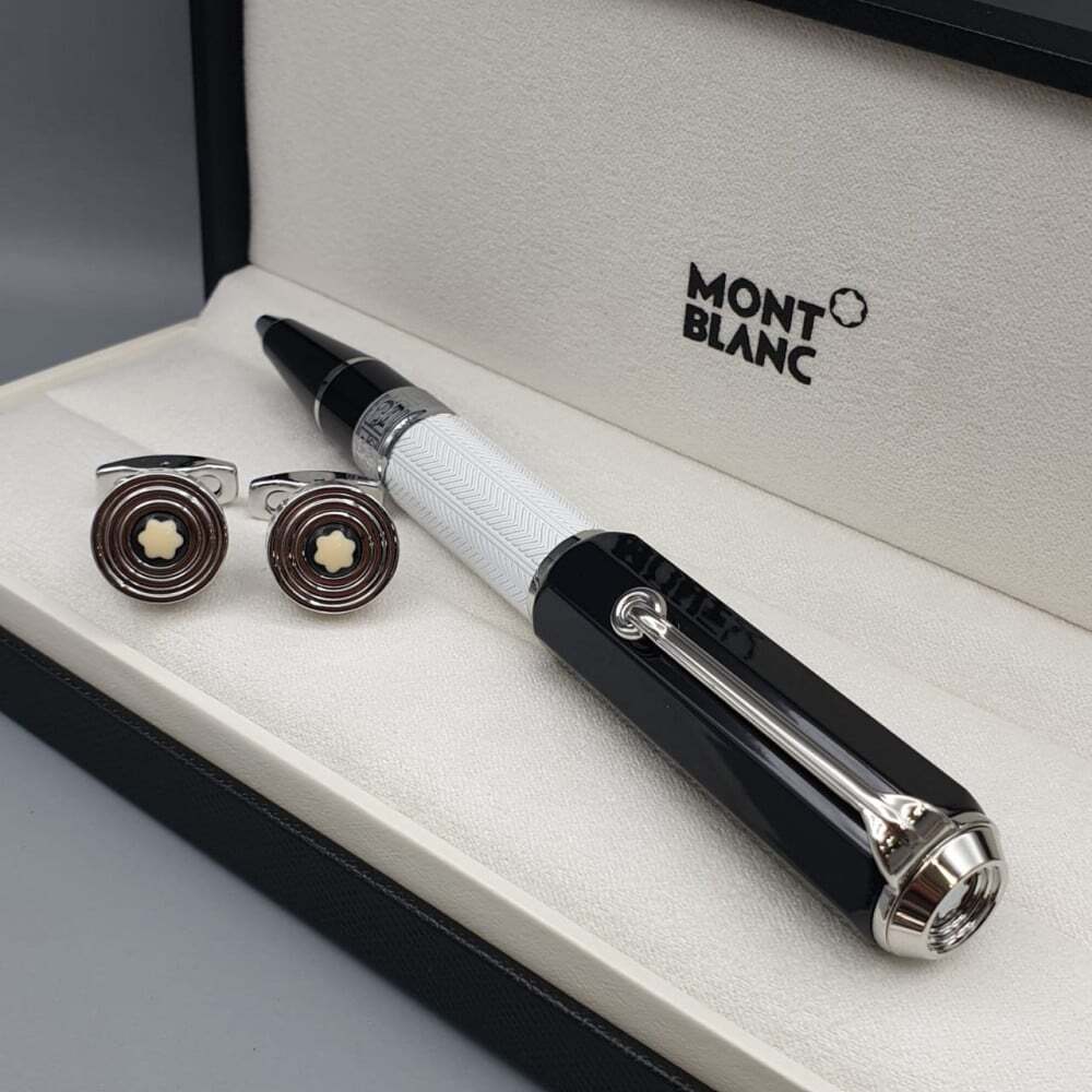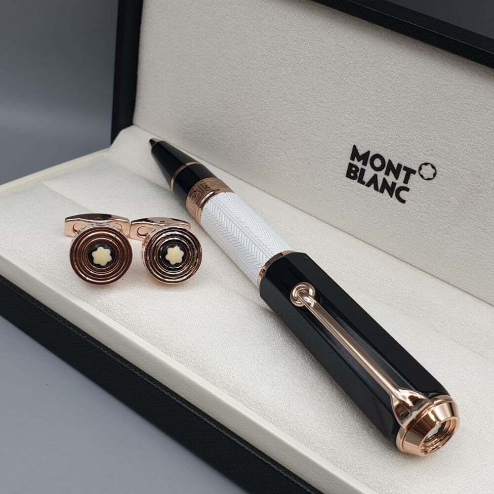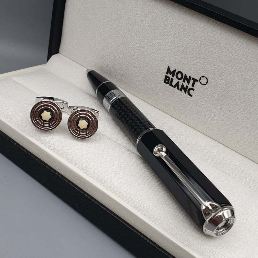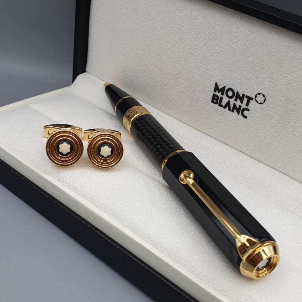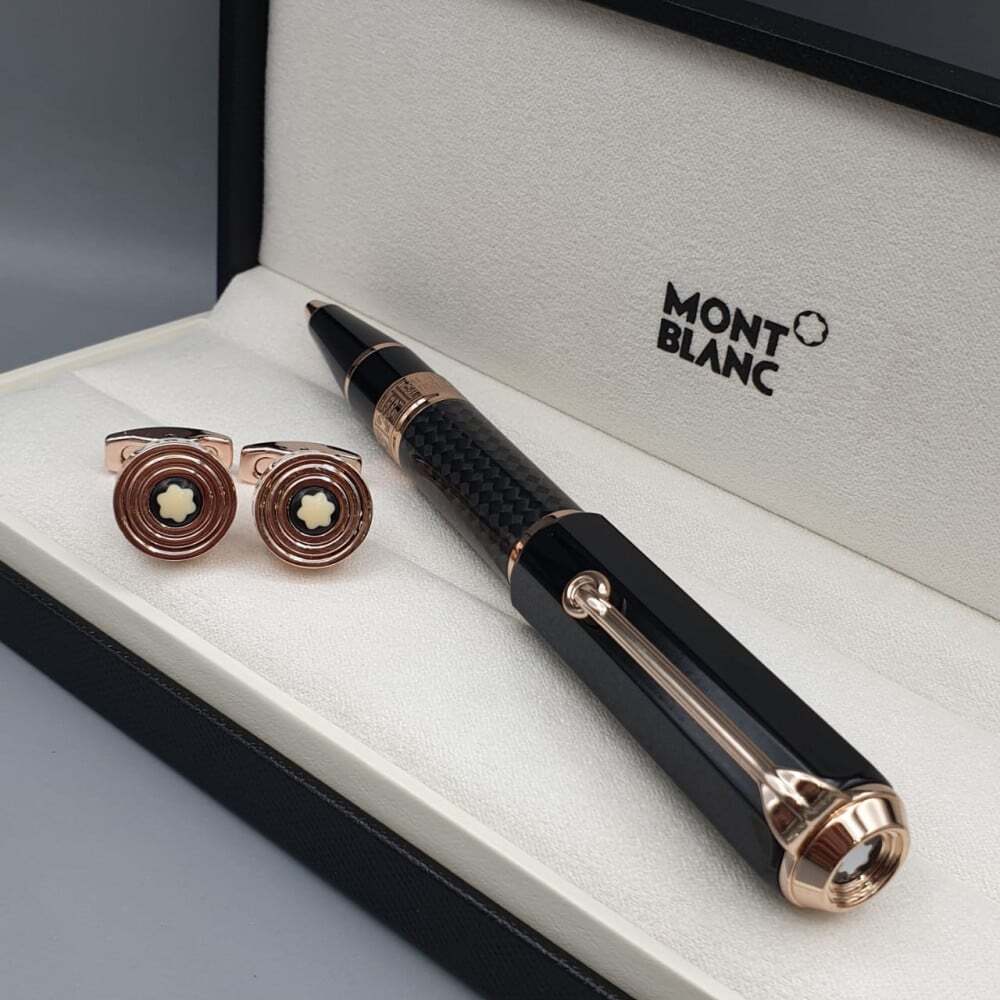 طقم مونت بلانك الفاخر يجسد الأناقة الراقية، يضم قلمًا فاخرًا بتصميم كلاسيكي يجمع بين الأسود والذهبي مع تفاصيل فريدة، يرافقه زوج من أزرار الأكمام الراقية بشعار مون بلان الأيقوني. يأتي في علبة أنيقة، ما يجعله الهدية المثالية لعشاق الفخامة.