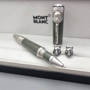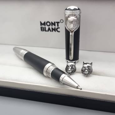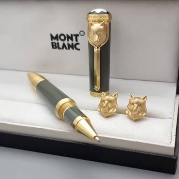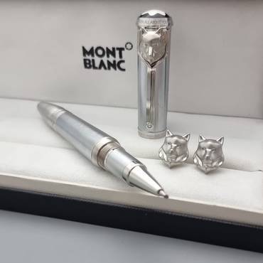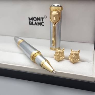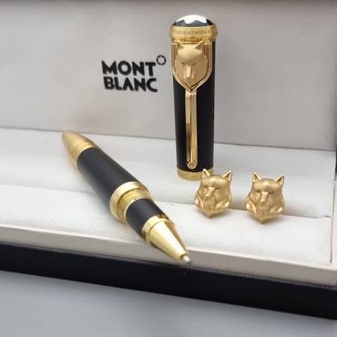قلم مونت بلانك الفاخر بتصميم أنيق يجمع بين color الأسود والمعدن الفضي، مزود بمشبك أنيق يحمل توقيع العلامة. أزرار أكمام بتصميم رأس النمر تعكس الفخامة والجرأة بتفاصيل دقيقة. جودة عالية وتقفيل متقن يضمنان لمسة راقية تعكس ذوقك الرفيع.