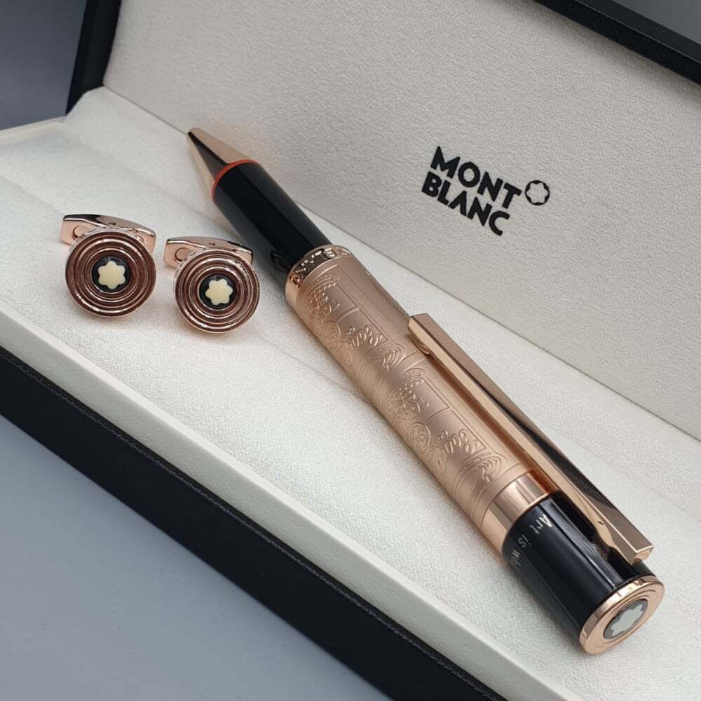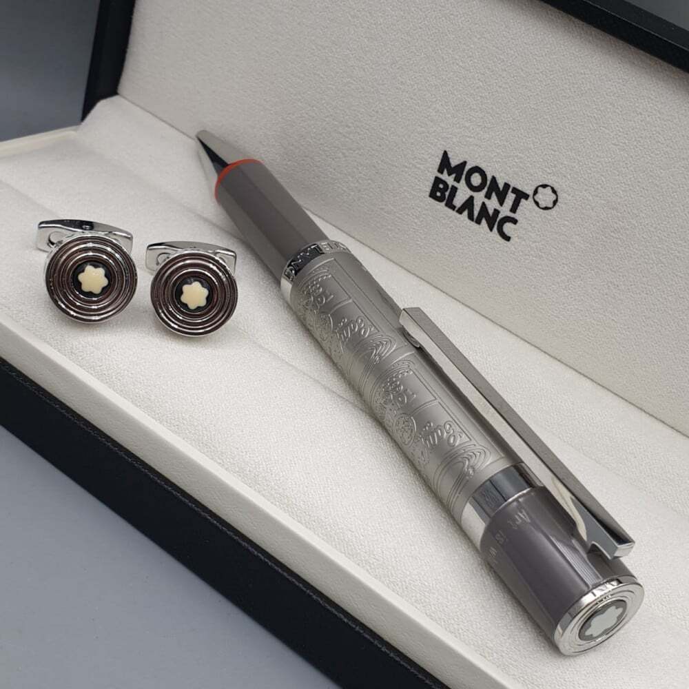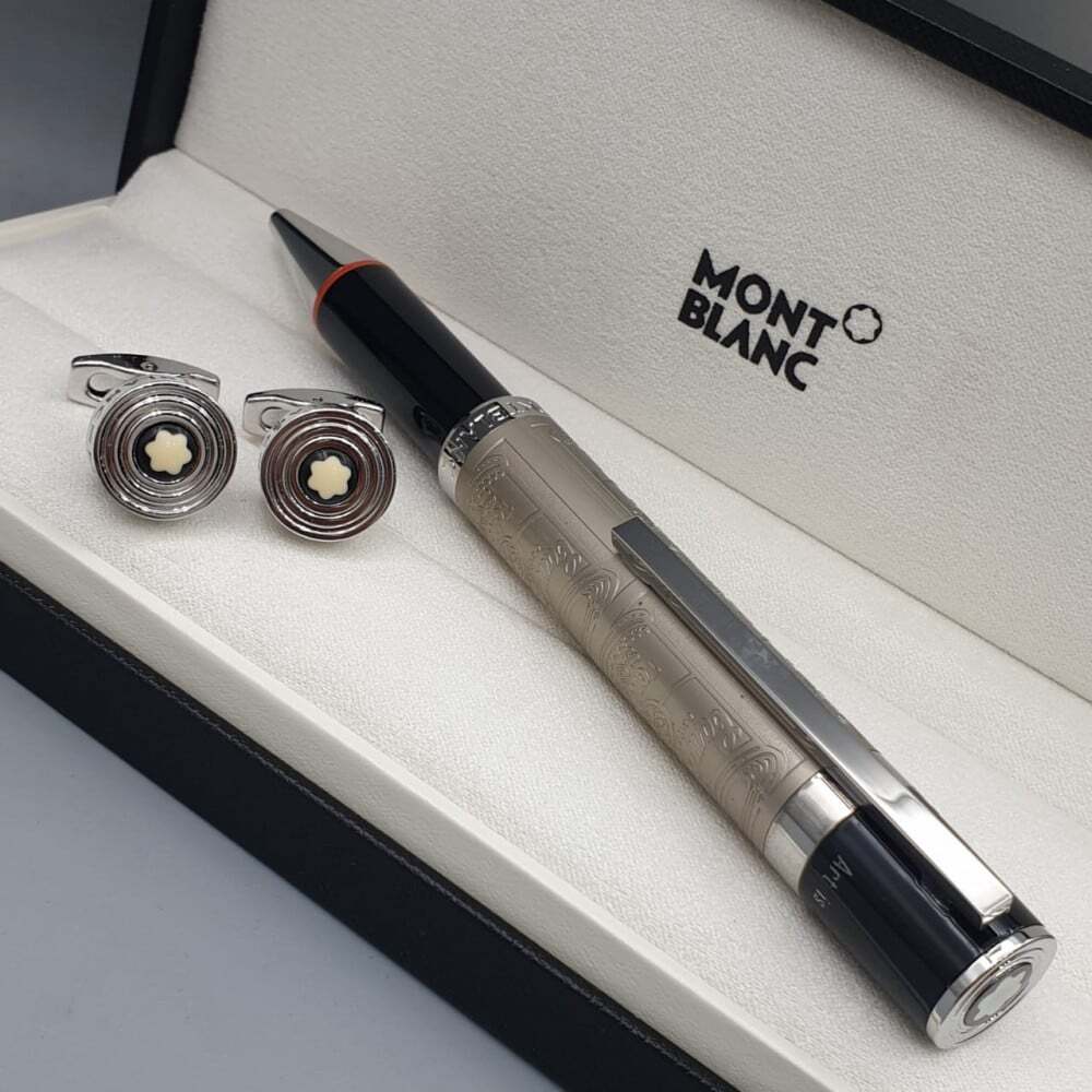 طقم مونت بلانك الفاخر بتصميم راقٍ يجمع بين الفخامة والأناقة. قلم حبر محفور بتفاصيل دقيقة ولمسات فضية راقية، مع أزرار أكمام أنيقة تحمل شعار مونت بلانك الأيقوني. يأتي في علبة فاخرة، مما يجعله هدية مثالية لعشاق التميز.