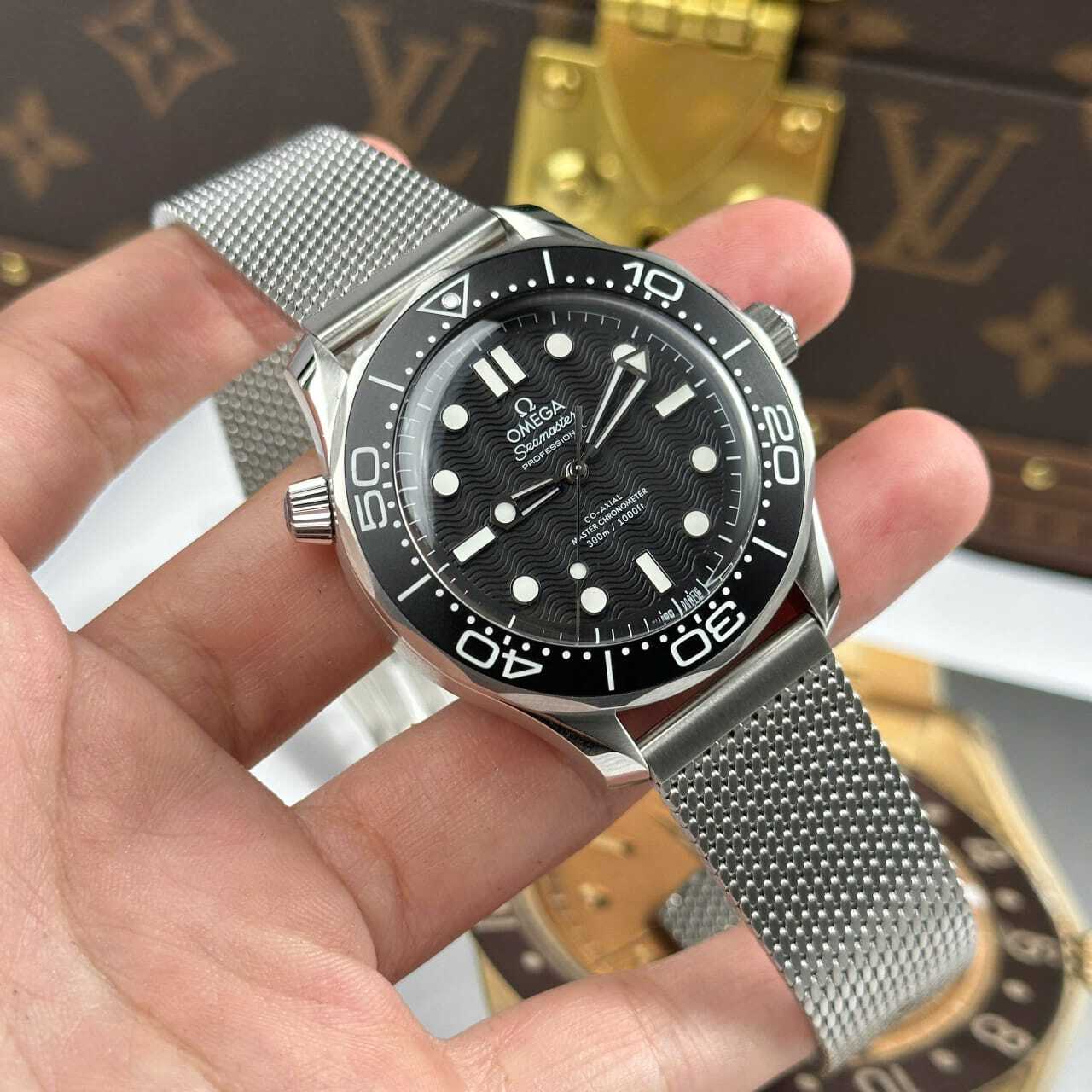 ساعة أوميغا سيماستر أوتوماتيك رجالية بمقاس 41 مم، إطار أزرق دوّار وميناء موجي أزرق مع مؤشرات مضيئة. ظهر شفاف يبرز حركة الماكينة. سوار ستانلس ستيل شبكي راقٍ مع قفل آمن. جودة كوبي ون عالية مع علبة وكيس وكرت.