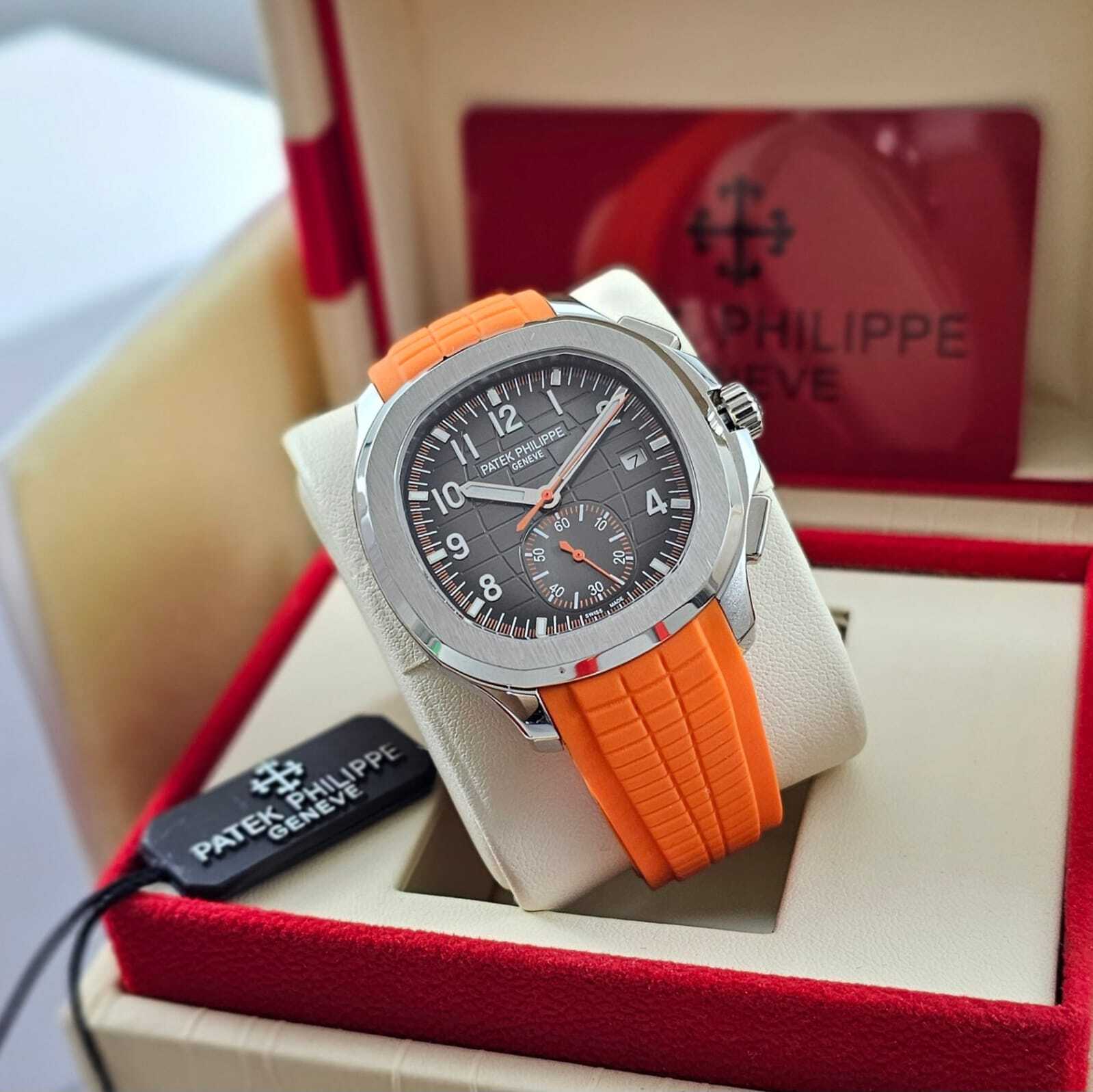 ساعة Patek Philippe Aquanaut بتصميم رياضي أنيق، تجمع بين الفخامة والأداء العالي. ميناء رمادي جذاب مع عقارب مضيئة وسوار مطاطي برتقالي يضفي لمسة جريئة. خيار مثالي لعشاق الأناقة والتميّز.