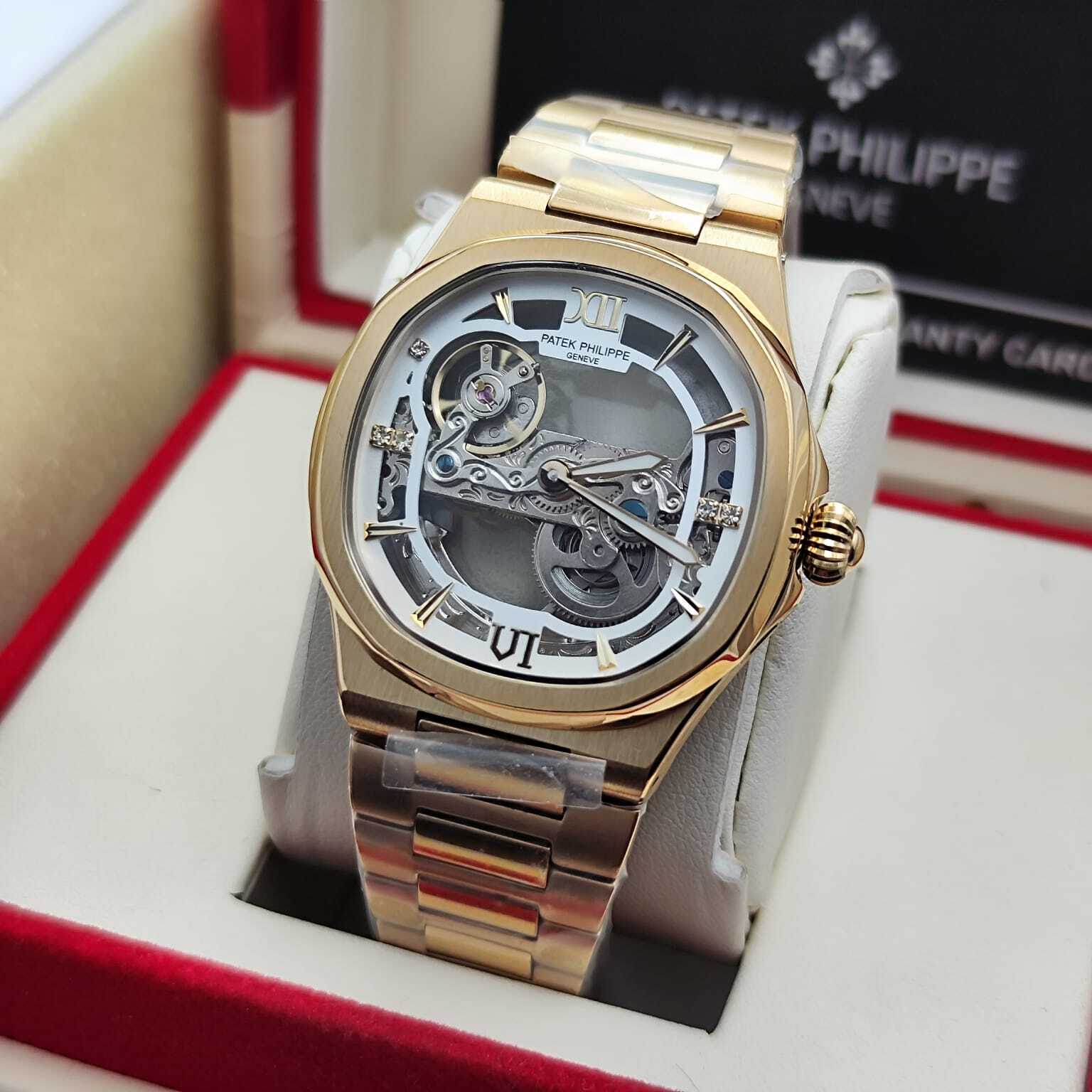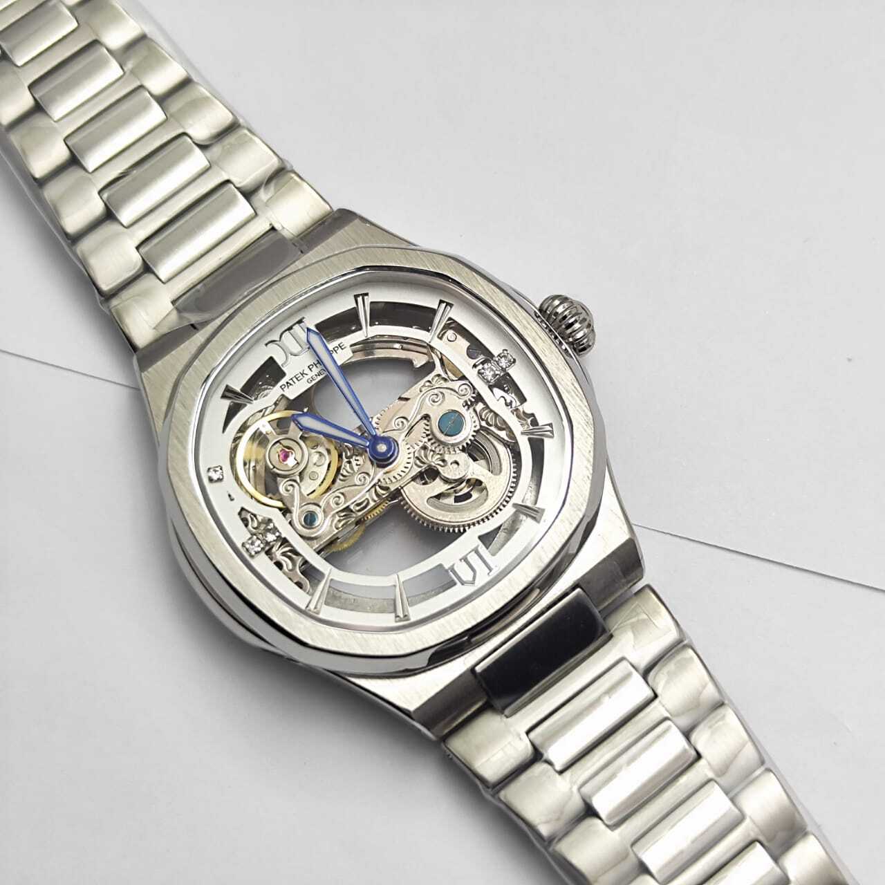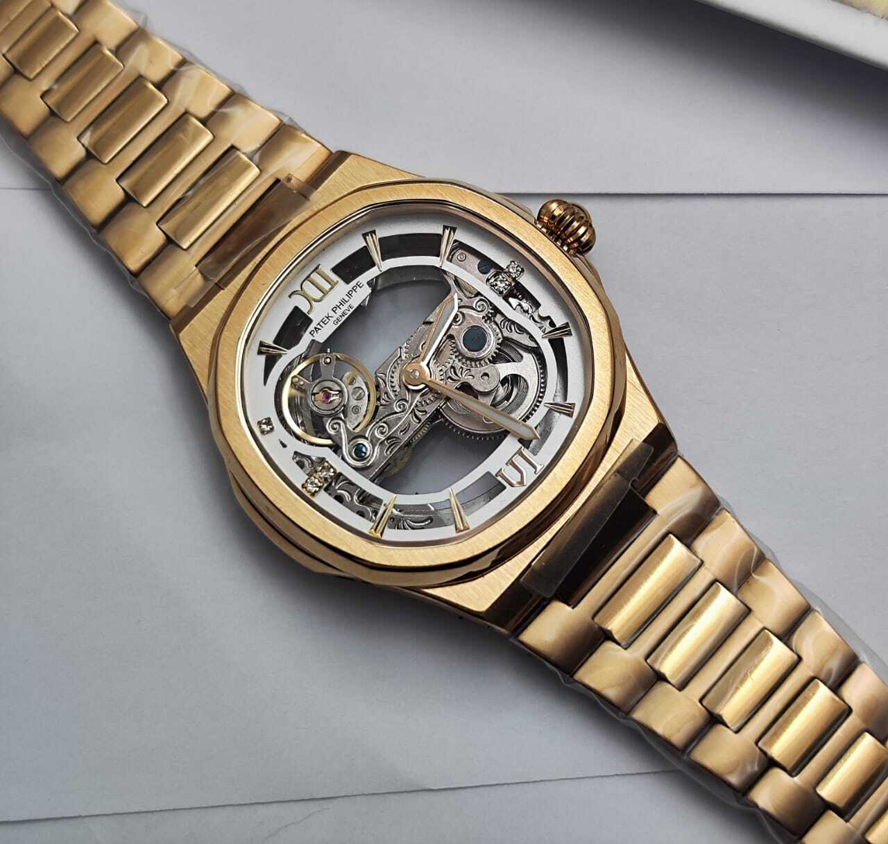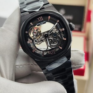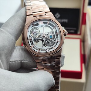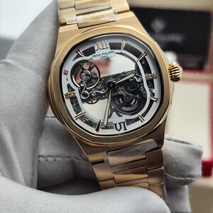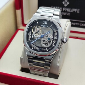 ساعة فاخرة بتصميم مكشوف يكشف عن روعة الميكانيكية الداخلية، تجمع بين الأناقة والهندسة الدقيقة، مثالية لعشاق التميز واللمسات العصرية الفاخرة. تفاصيل الساعة: التفاصيل البيانات الموديل باتيك فيليب نوتيلوس سكليتون المكينة أو