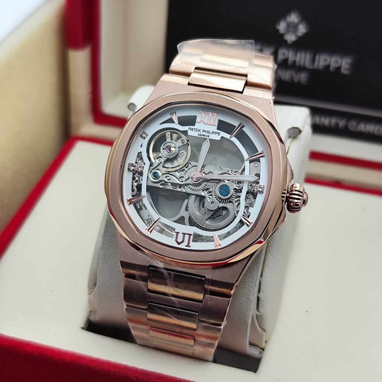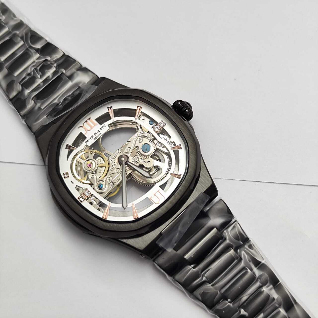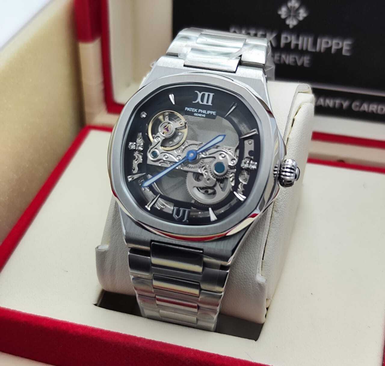 ساعة فاخرة بتصميم مكشوف يكشف عن روعة الميكانيكية الداخلية، تجمع بين الأناقة والهندسة الدقيقة، مثالية لعشاق التميز واللمسات العصرية الفاخرة. تفاصيل الساعة: التفاصيل البيانات الموديل باتيك فيليب نوتيلوس سكليتون المكينة أو