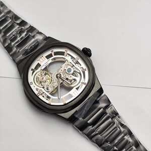 ساعة فاخرة بتصميم مكشوف يكشف عن روعة الميكانيكية الداخلية، تجمع بين الأناقة والهندسة الدقيقة، مثالية لعشاق التميز واللمسات العصرية الفاخرة.