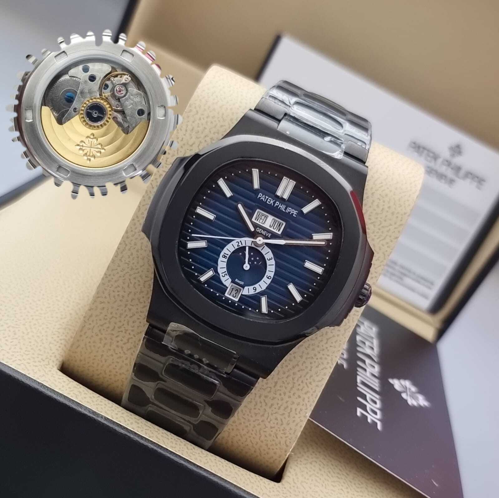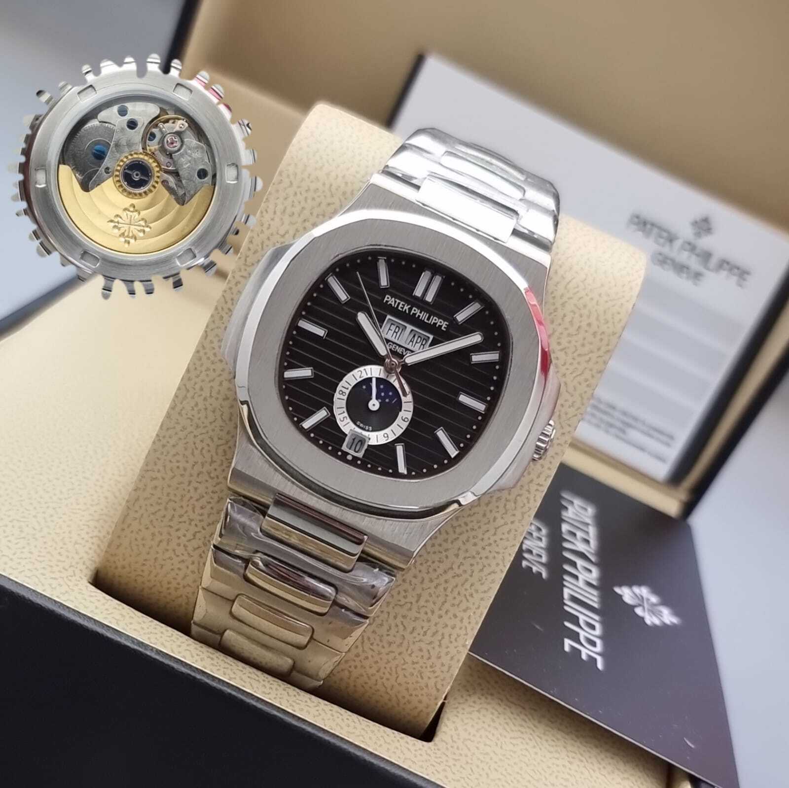 ساعة باتيك فيليب نوتيلوس الفاخرة ، عالية الجودة، بهيكل ستانلس ستيل وميناء مخطط مع عقارب ومؤشرات مضيئة. تعمل بحركة أوتوماتيكية وتعرض اليوم والتاريخ.