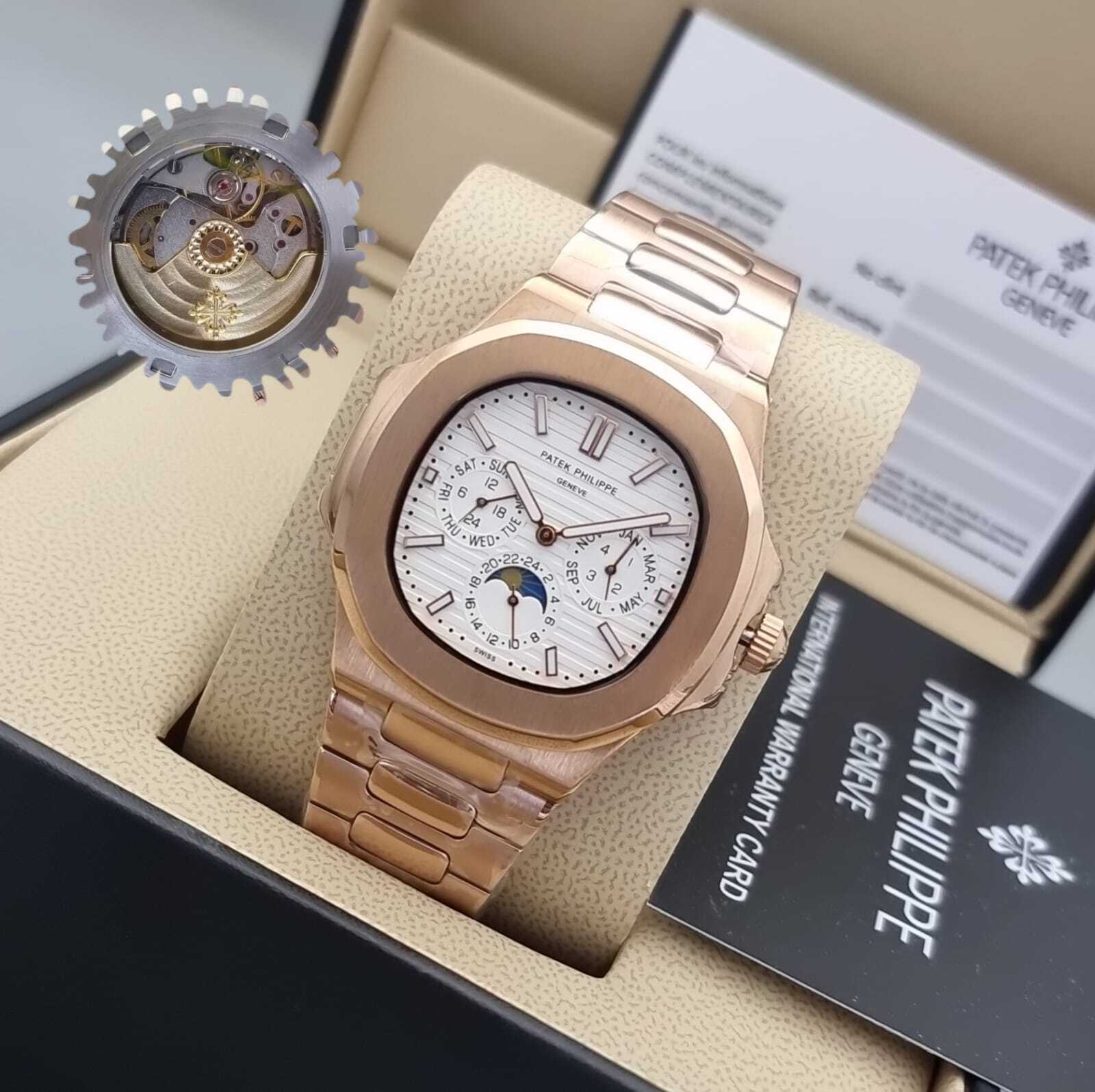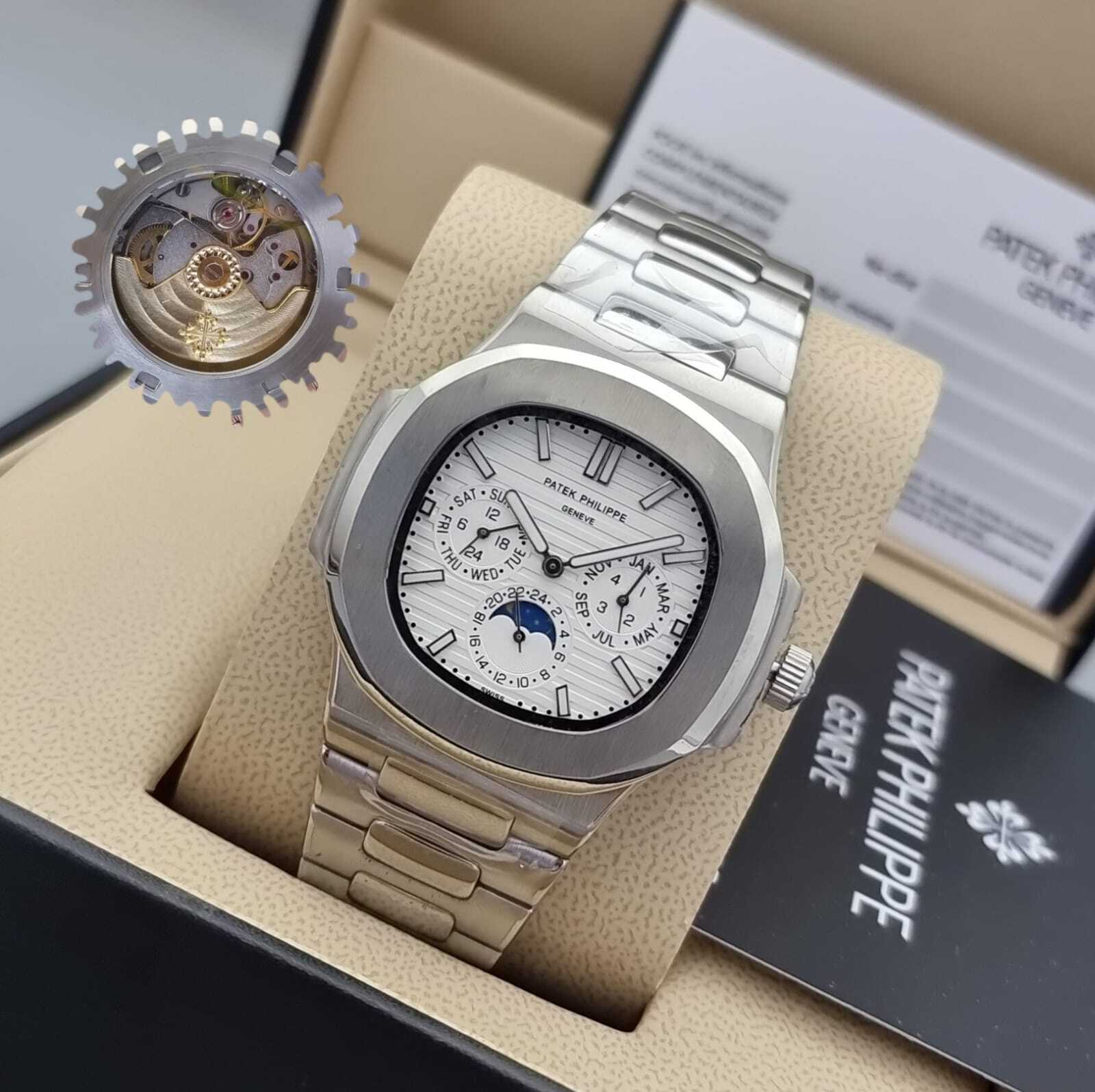 باتيك فيليب نوتيلوس 5712/1A، أوتوماتيك بجودة كوبي ون عالية، بهيكل وسوار من الفولاذ المقاوم للصدأ. يتميز بميناء أبيض مع عرض للتقويم القمري، التاريخ، اليوم، ومؤشر احتياطي الطاقة. مزود بقفل قابل للطي، ويأتي مع علبة، كيس، وكرت.