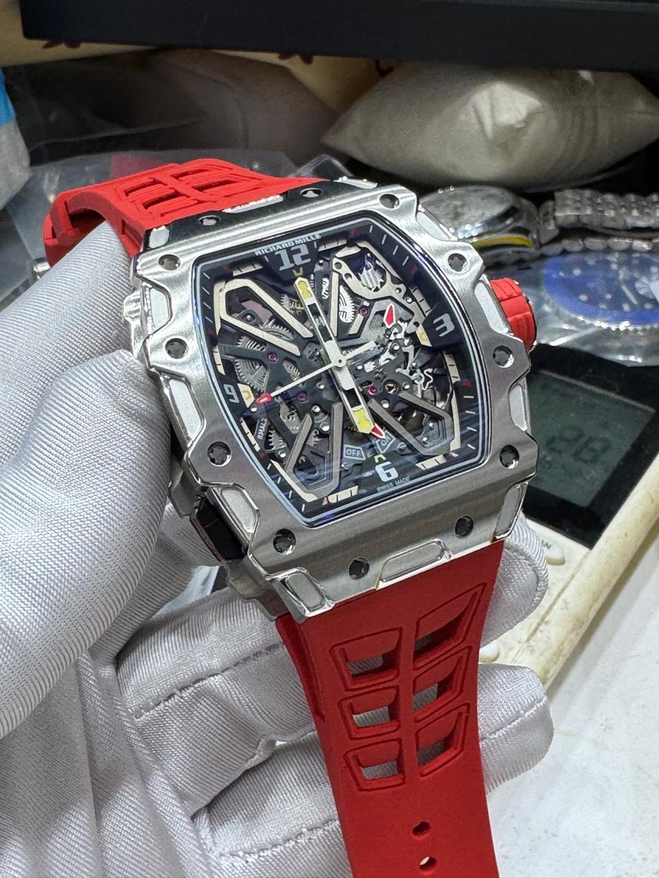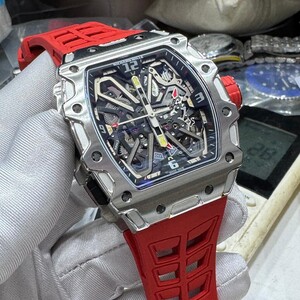 ساعة ريتشارد ميل RM 35-01 رافائيل نادال هيكلي عصري يبرز التفاصيل الميكانيكية الظاهرة داخل هيكل معدني قوي. تأتي بسوار رياضي أحمر يمنحها طابعًا جريئًا، وإطار معدني محكم المسامير يعزز حضورها. مزيج مثالي بين القوة، التقنية، والجاذبية العالية،