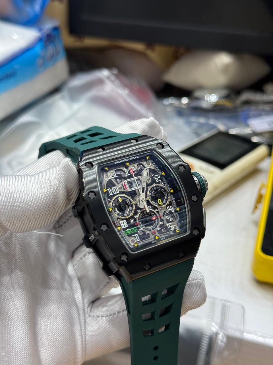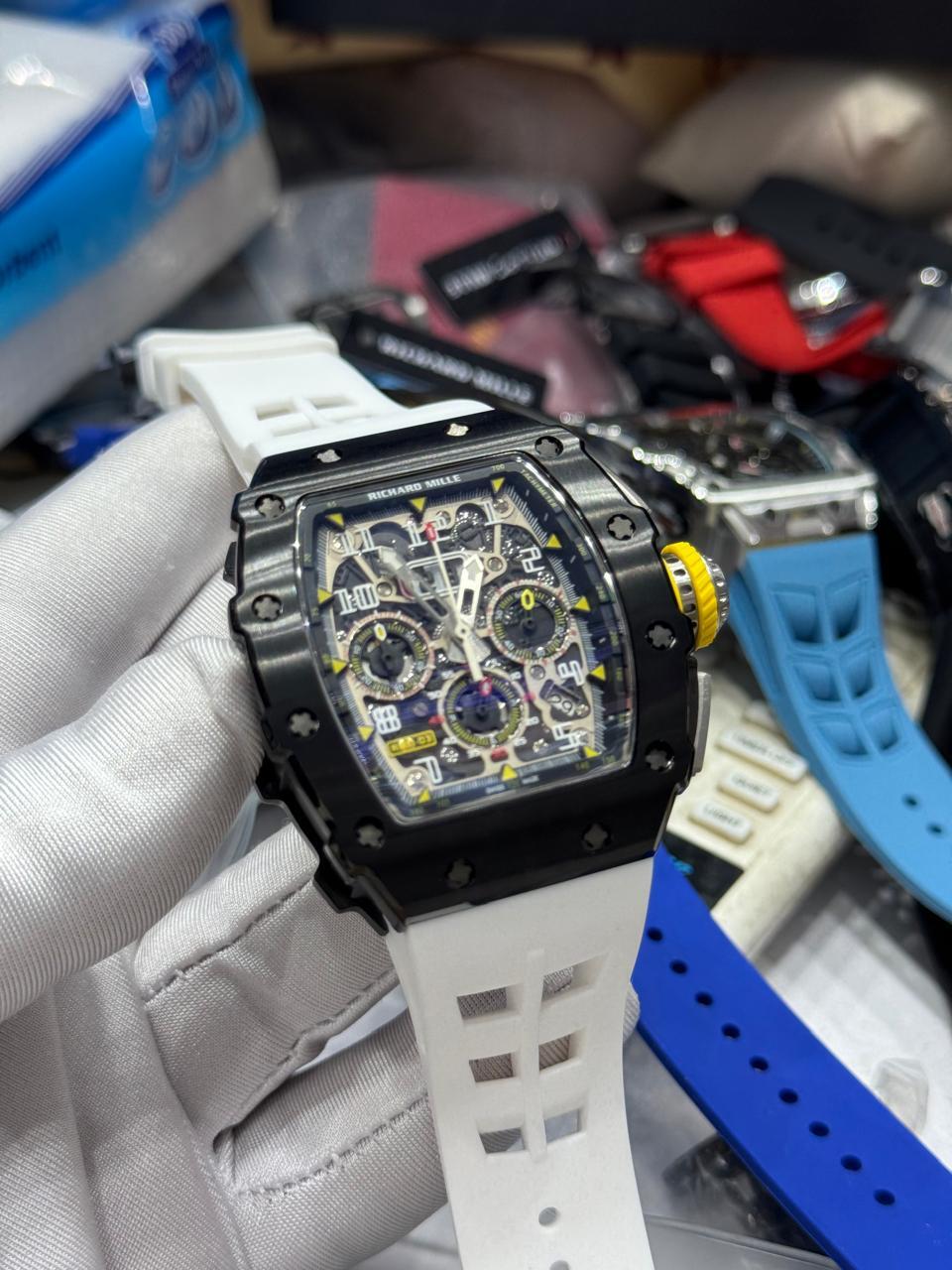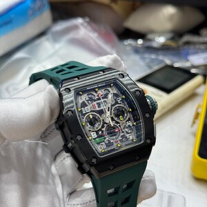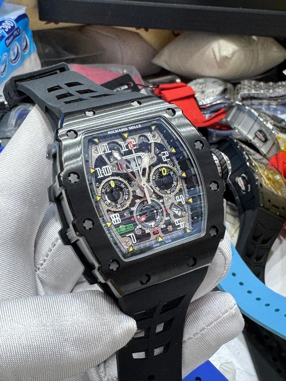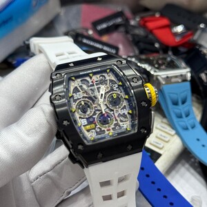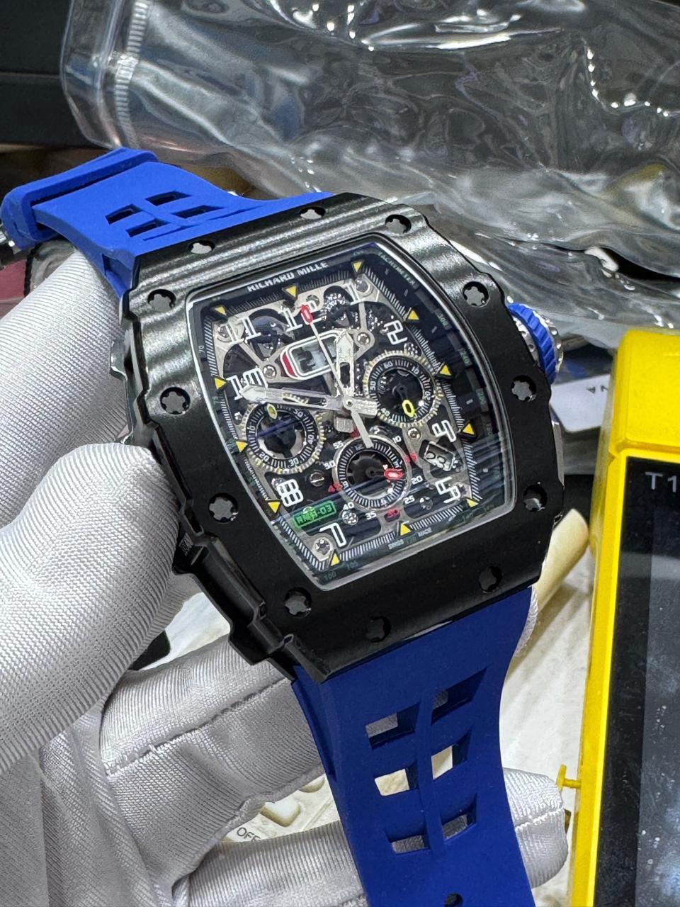 ساعة ريتشارد ميل RM65-01 بتصميم رياضي فاخر وهندسة داخلية مكشوفة تعكس دقة الميكانيك. هيكل قوي بلون أسود، كرونوغراف متعدد الوظائف، مع سوار سيليكون أزرق يمنح راحة وأناقة. جودة كوي ون عالية، مع ملحقات كاملة وعرض يبرز الفخامة والعملية في آن واحد.