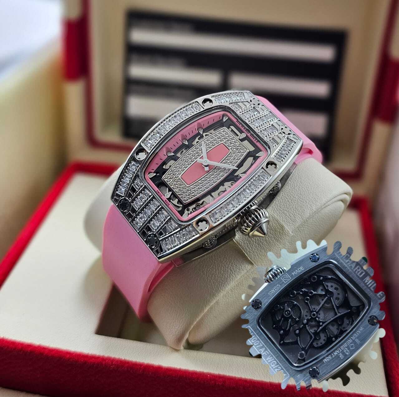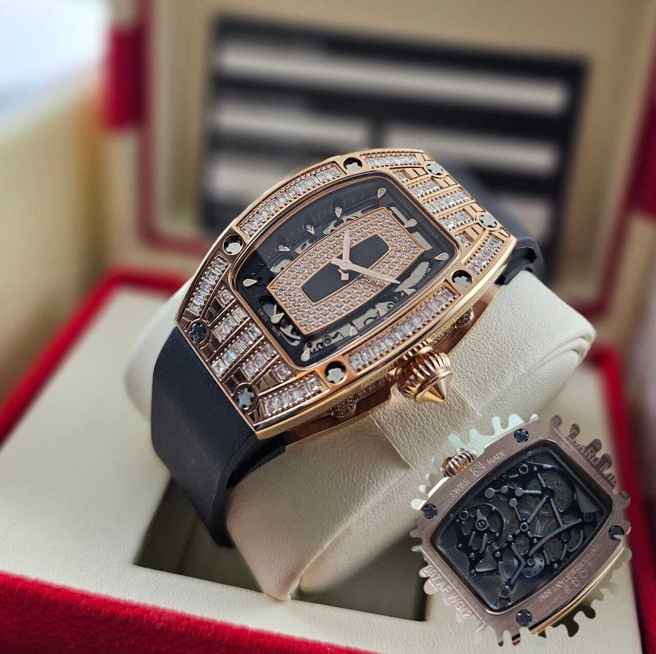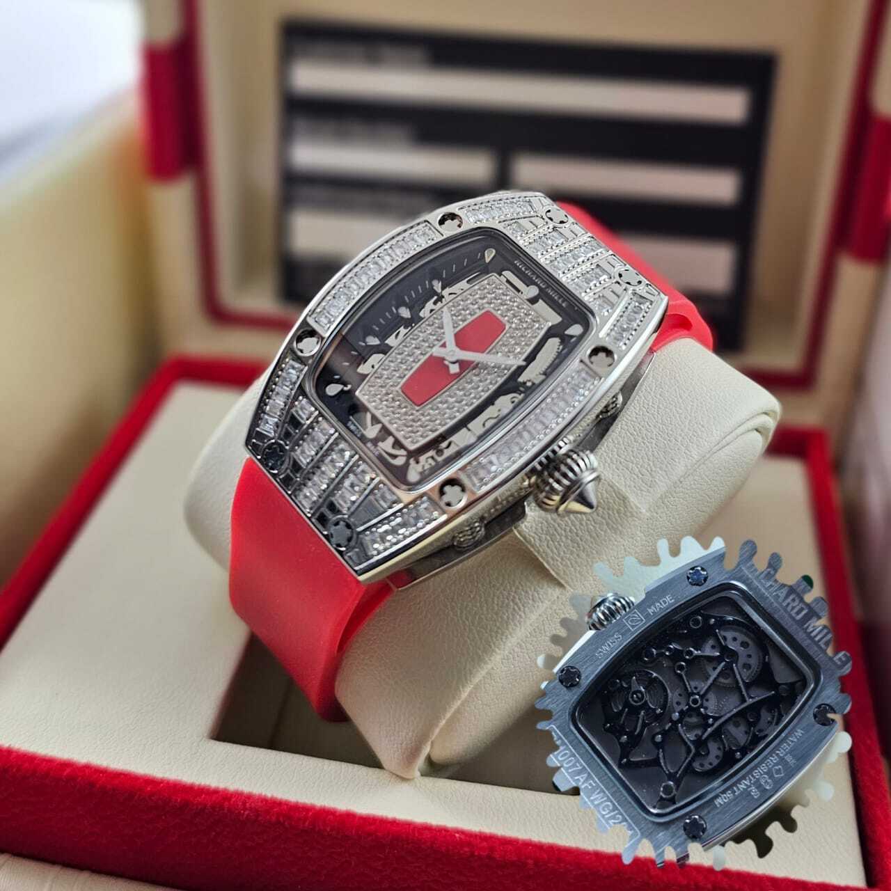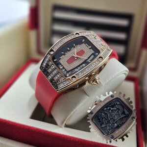 استمتع بإطلالة فريدة مع ساعة ريتشارد ميل الفاخرة، المصممة لمحبي التميز والأناقة الراقية. إطارها مزين بالألماس البراق مع تصميم جريء يجمع بين اللمسات العصرية والكلاسيكية. تأتي بميناء أسود فاخر مع تفاصيل بارزة ولمسات بcolor الأحمر، وسوار سيل