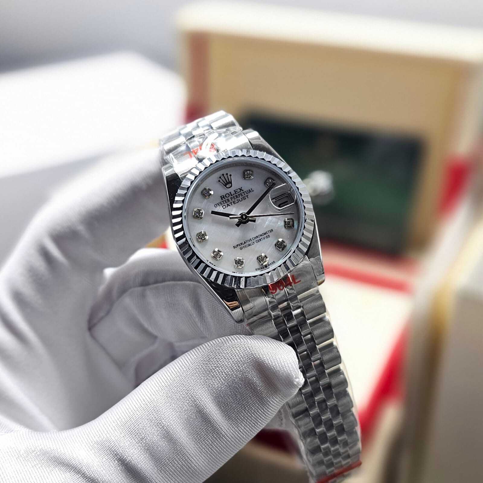 ساعة رولكس ديت جست بتصميم فاخر يجمع بين الأناقة والكلاسيكية، مزودة بميناء لؤلؤي مرصع بمؤشرات زركون مع إطار مرصع بالأحجار الفاخرة. مصنوعة من الستانلس ستيل ولون ذهبي مع سوار جوبيل الفخم. خيار مثالي لإطلالة راقية تعكس الذوق الرفيع.