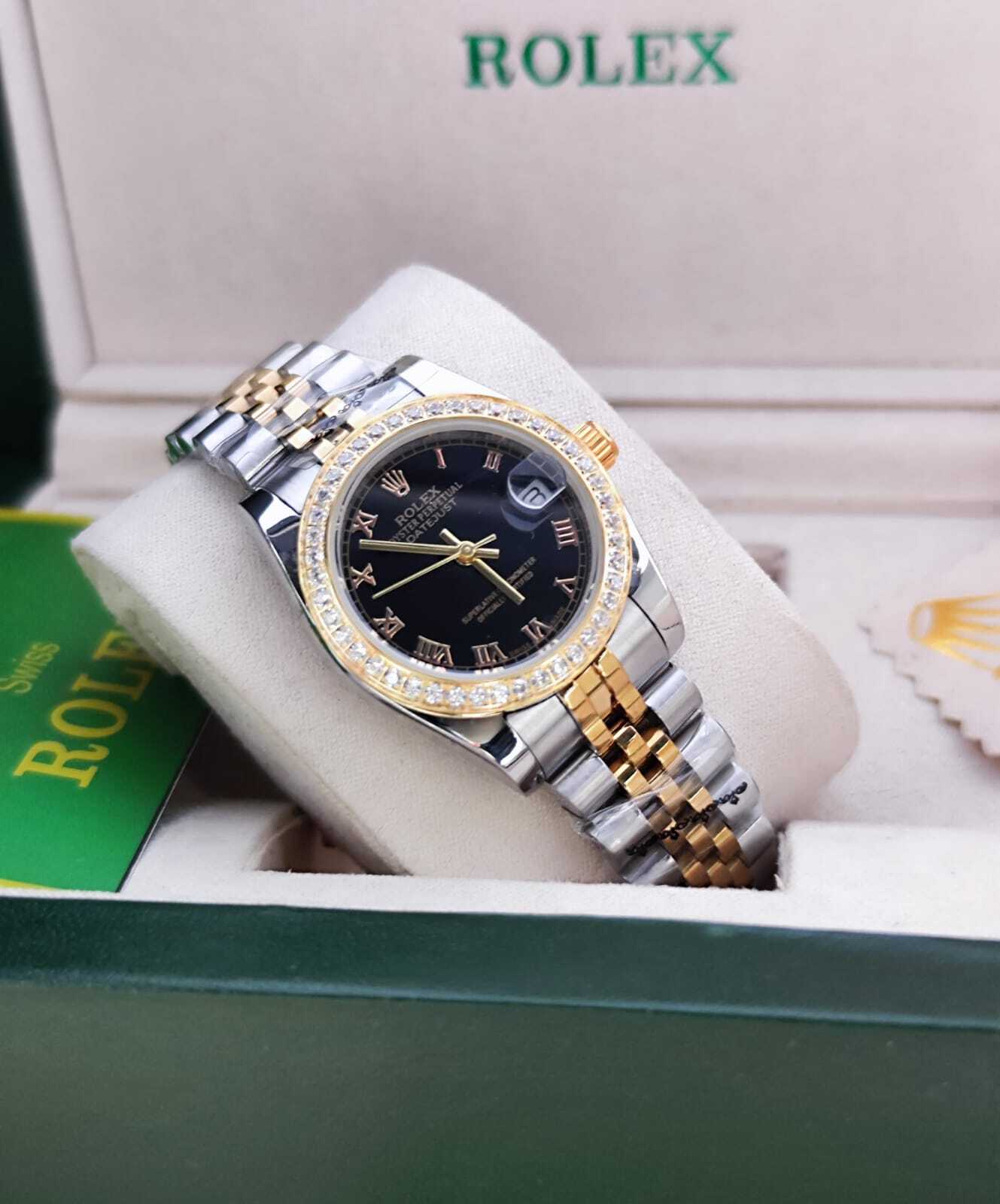 ساعة رولكس ديت جست الفاخرة للنساء تتميز بتصميمها الأنيق والمميز. إطار مرصع بالفصوص اللامعة. مينا بحجم مثالي مع أرقام عربية الحزام مصنوع من معدن ستانلس ستيل المقاوم للصدأ لضمان مدة زمنية أطول.
