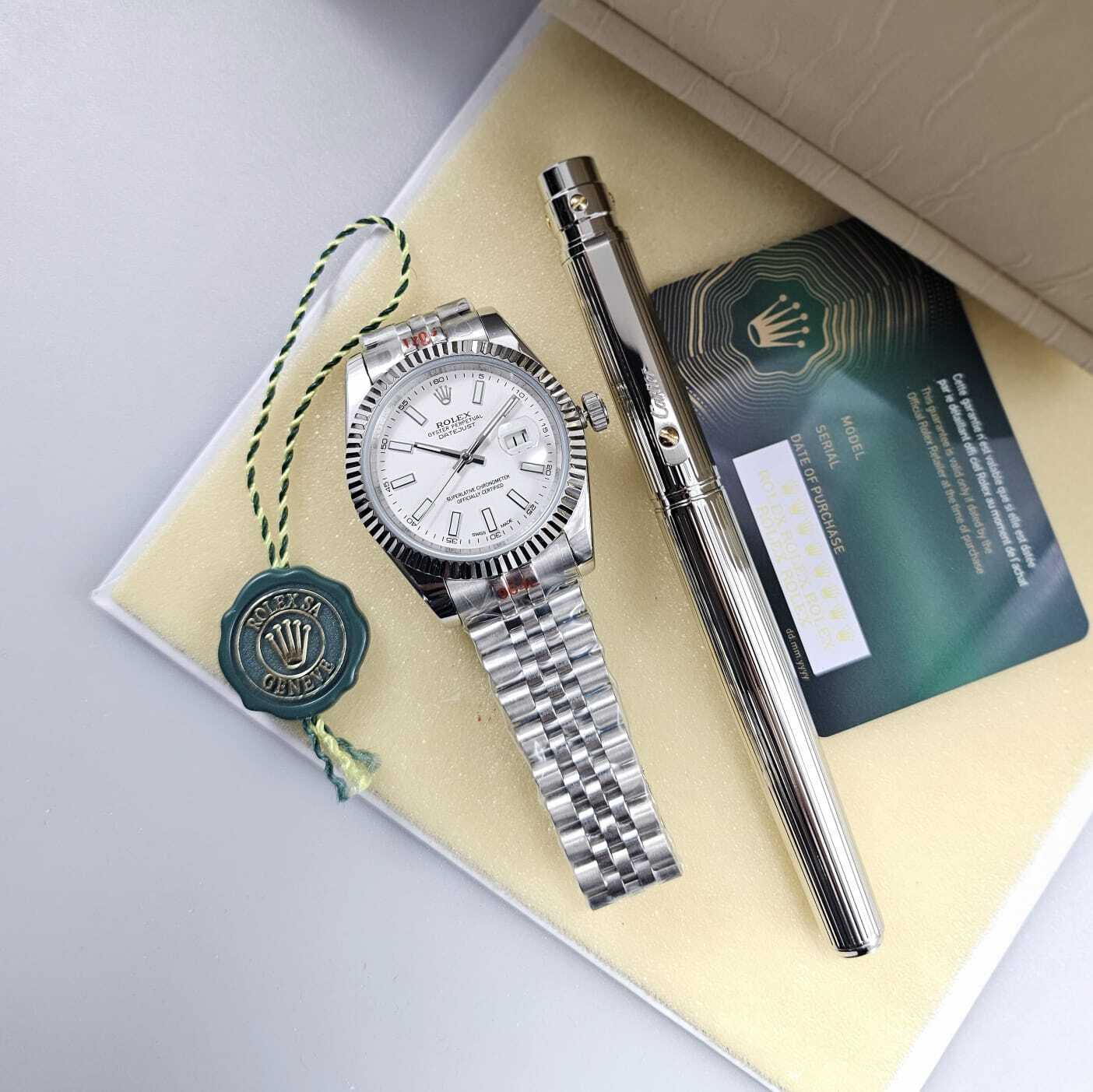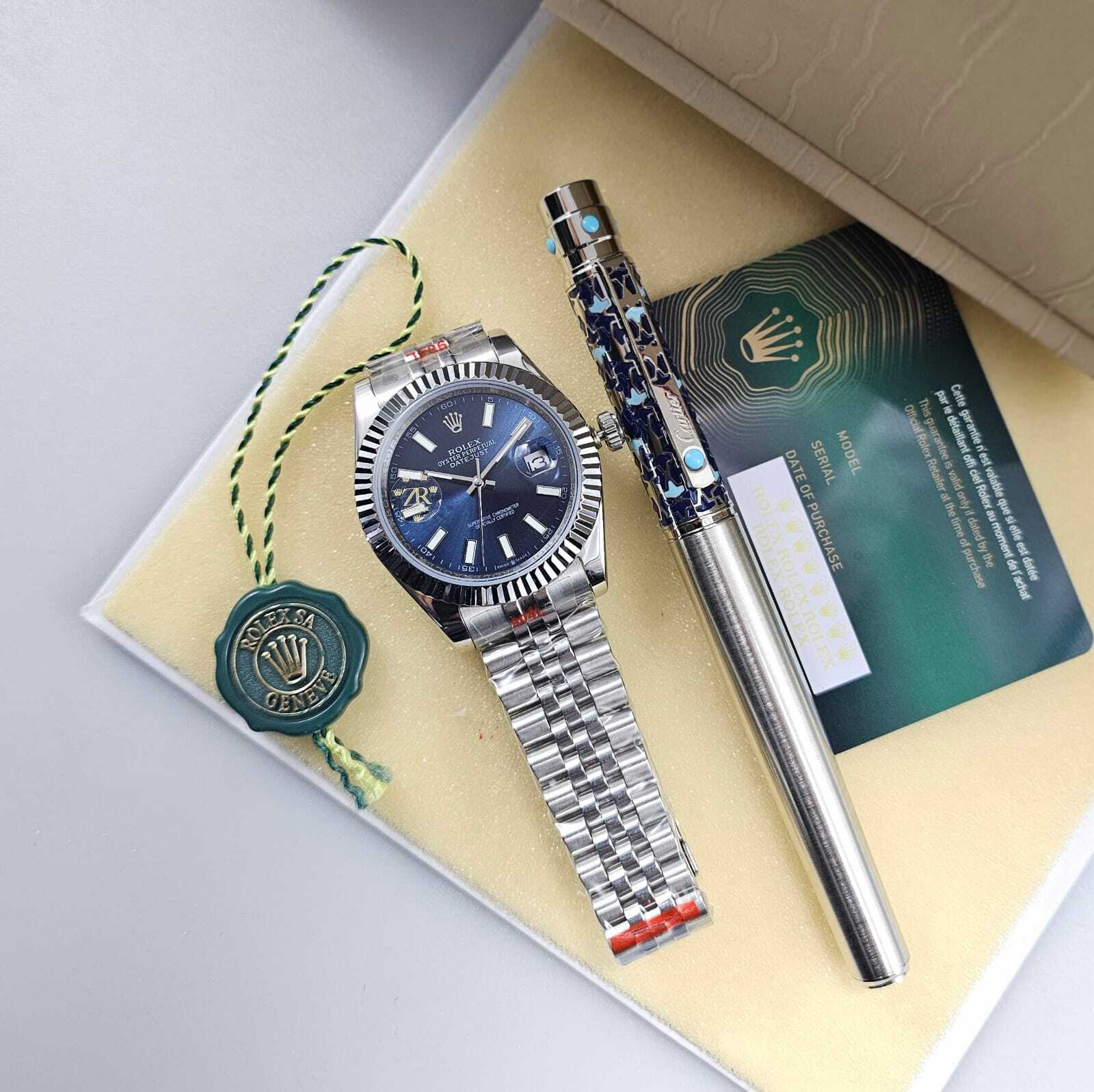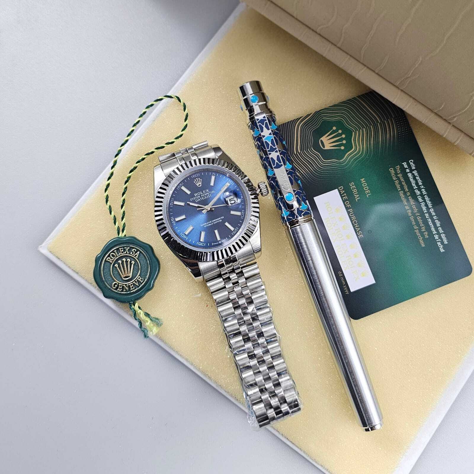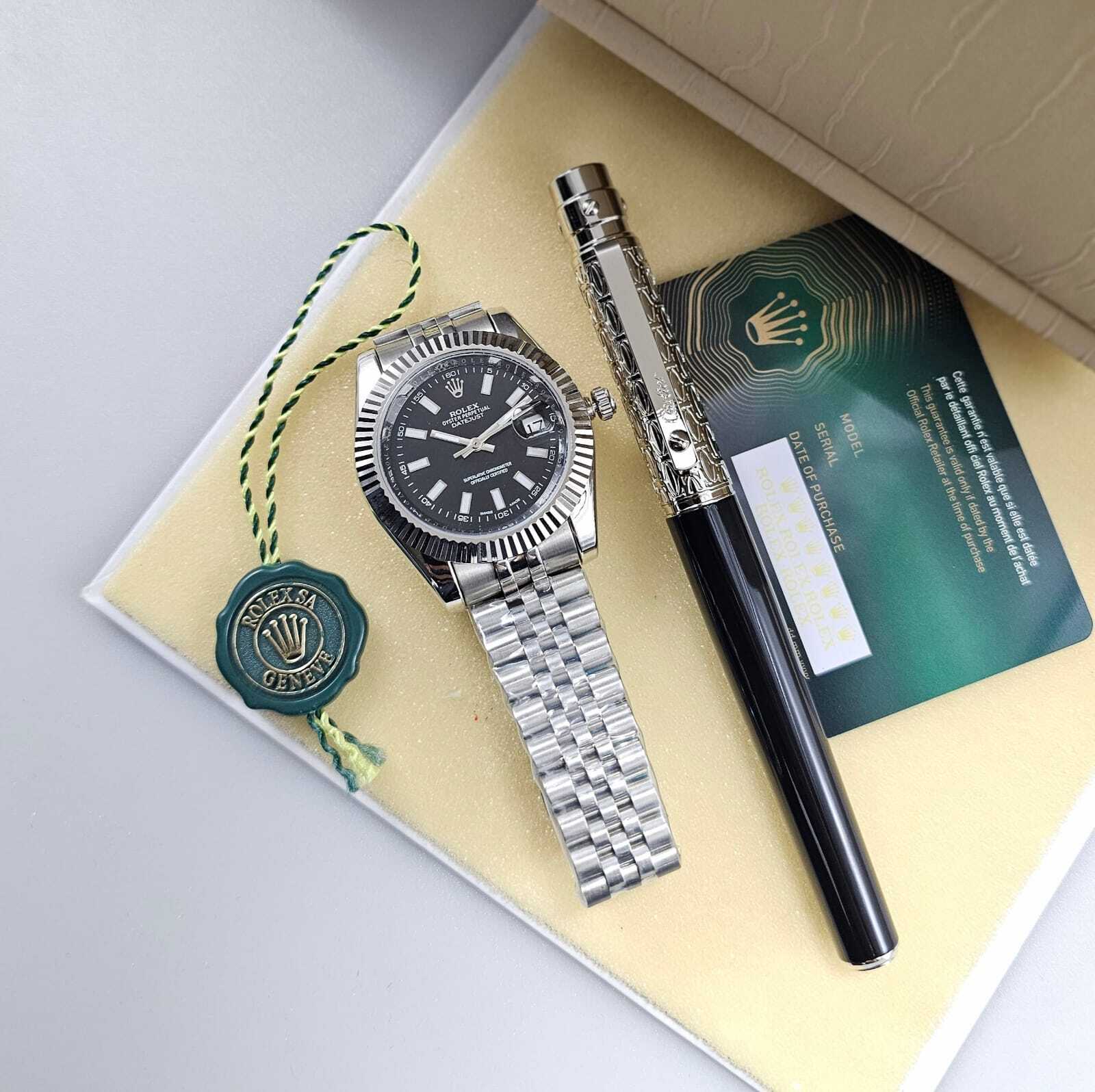 ساعة فاخرة بتصميم أنيق يعكس الحرفية العالية، تتميز بميناء أنيق وهيكل مصقول بدقة، مع سوار متين يوفر راحة وأناقة لا مثيل لها. قلم فاخر مزخرف بتفاصيل مميزة، ليكونا معًا رمزًا للذوق الرفيع والتميز. تفاصيل الساعة: المواصفة التفاصيل