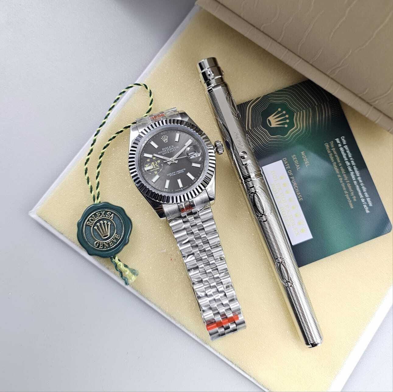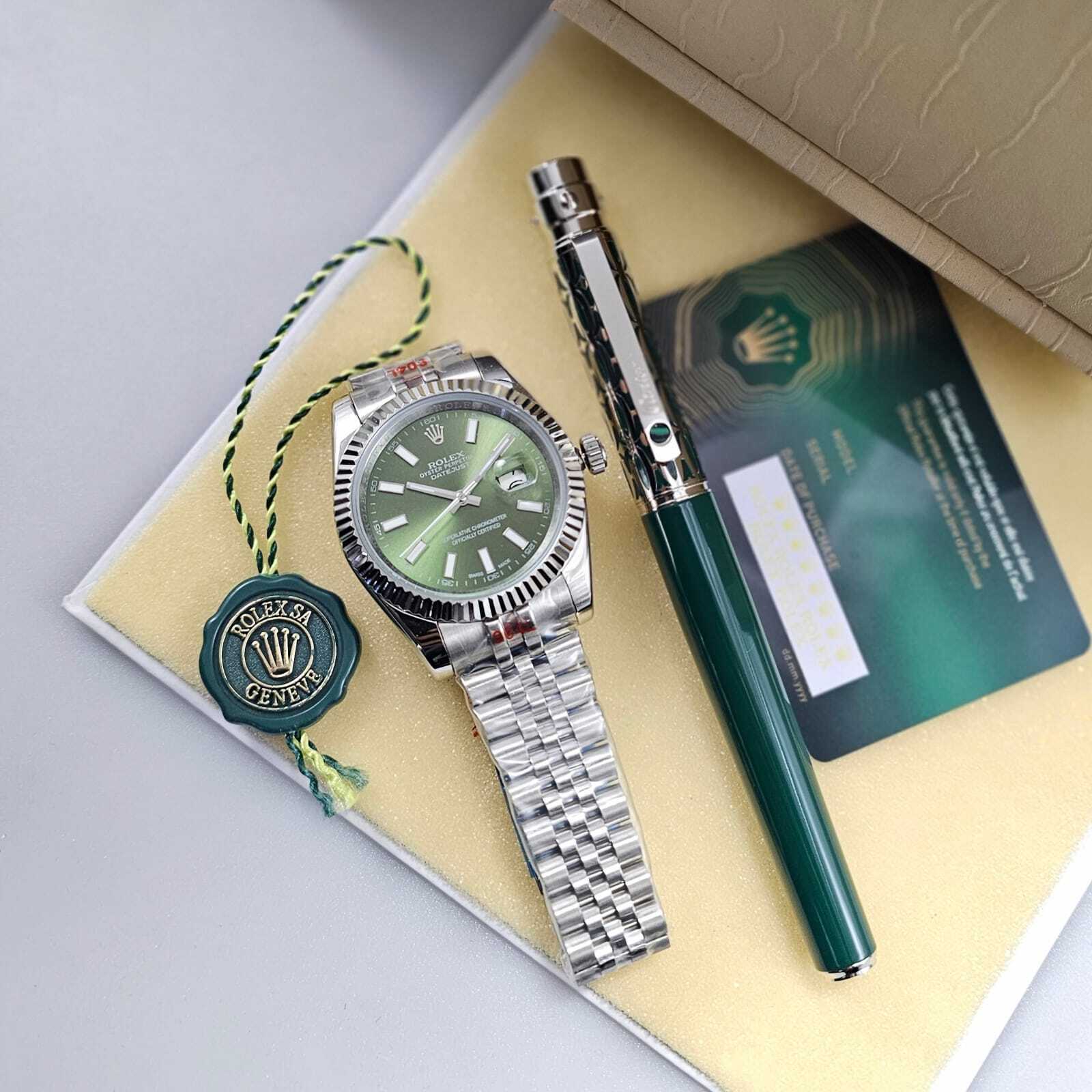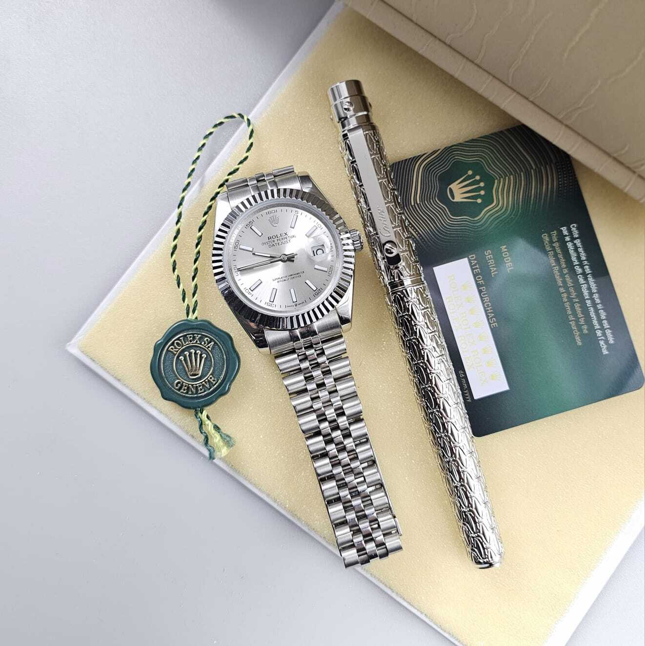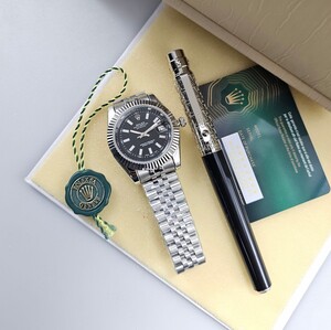 ساعة فاخرة بتصميم أنيق يعكس الحرفية العالية، تتميز بميناء أنيق وهيكل مصقول بدقة، مع سوار متين يوفر راحة وأناقة لا مثيل لها. قلم فاخر مزخرف بتفاصيل مميزة، ليكونا معًا رمزًا للذوق الرفيع والتميز. تفاصيل الساعة: المواصفة التفاصيل