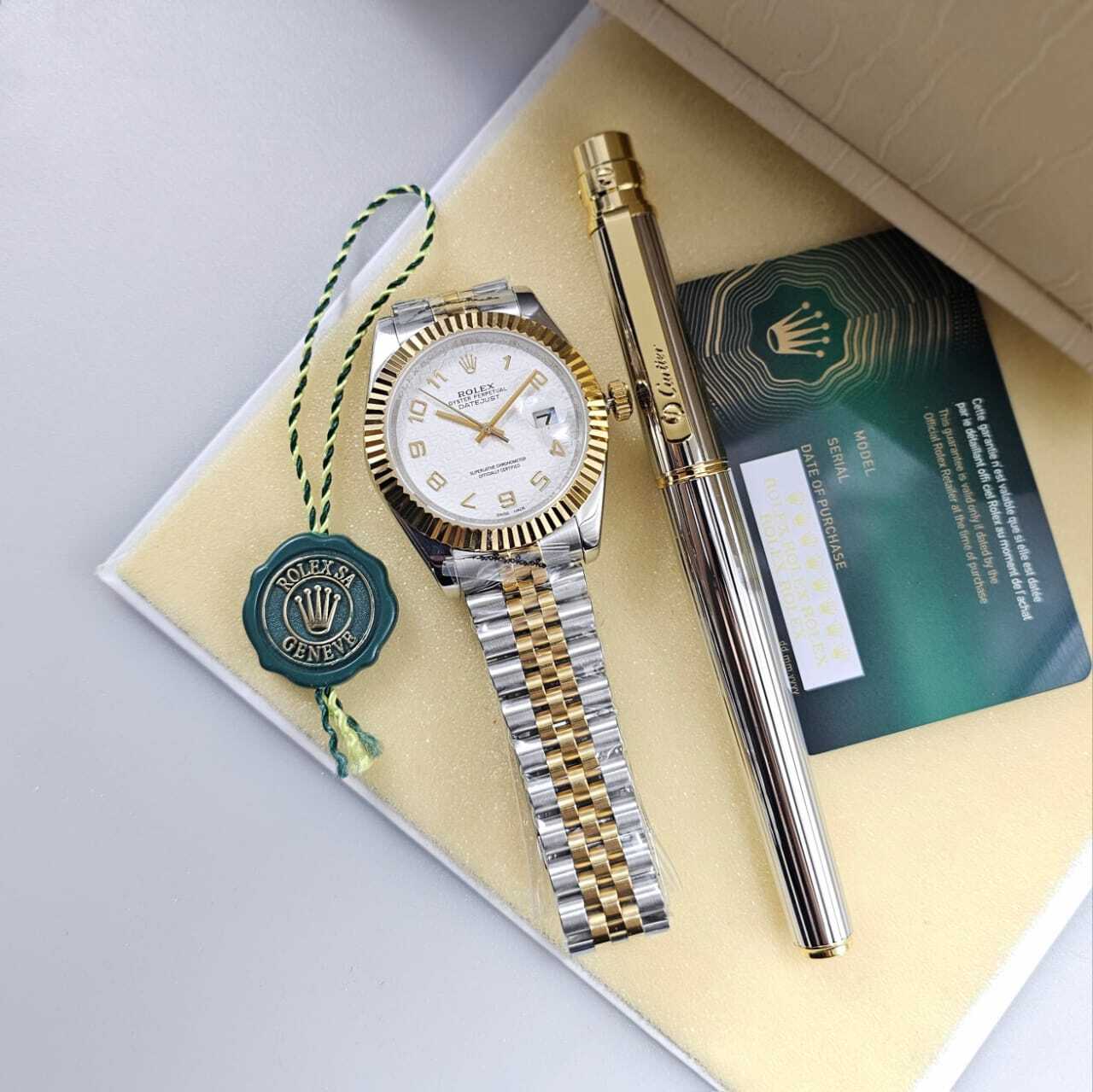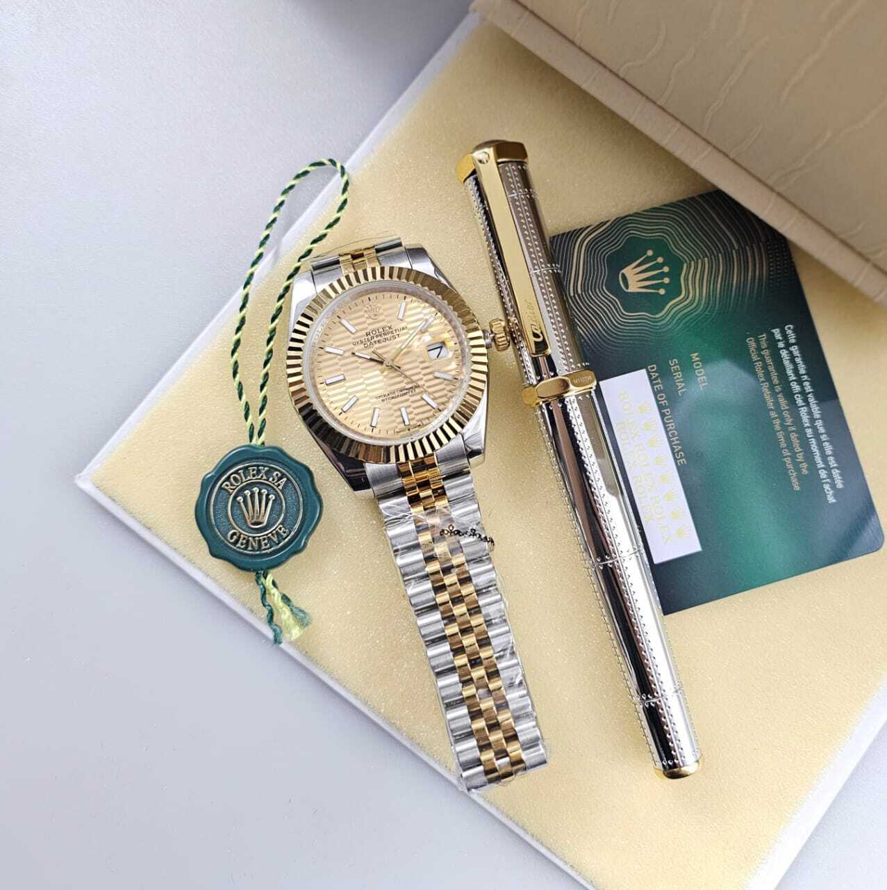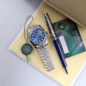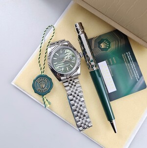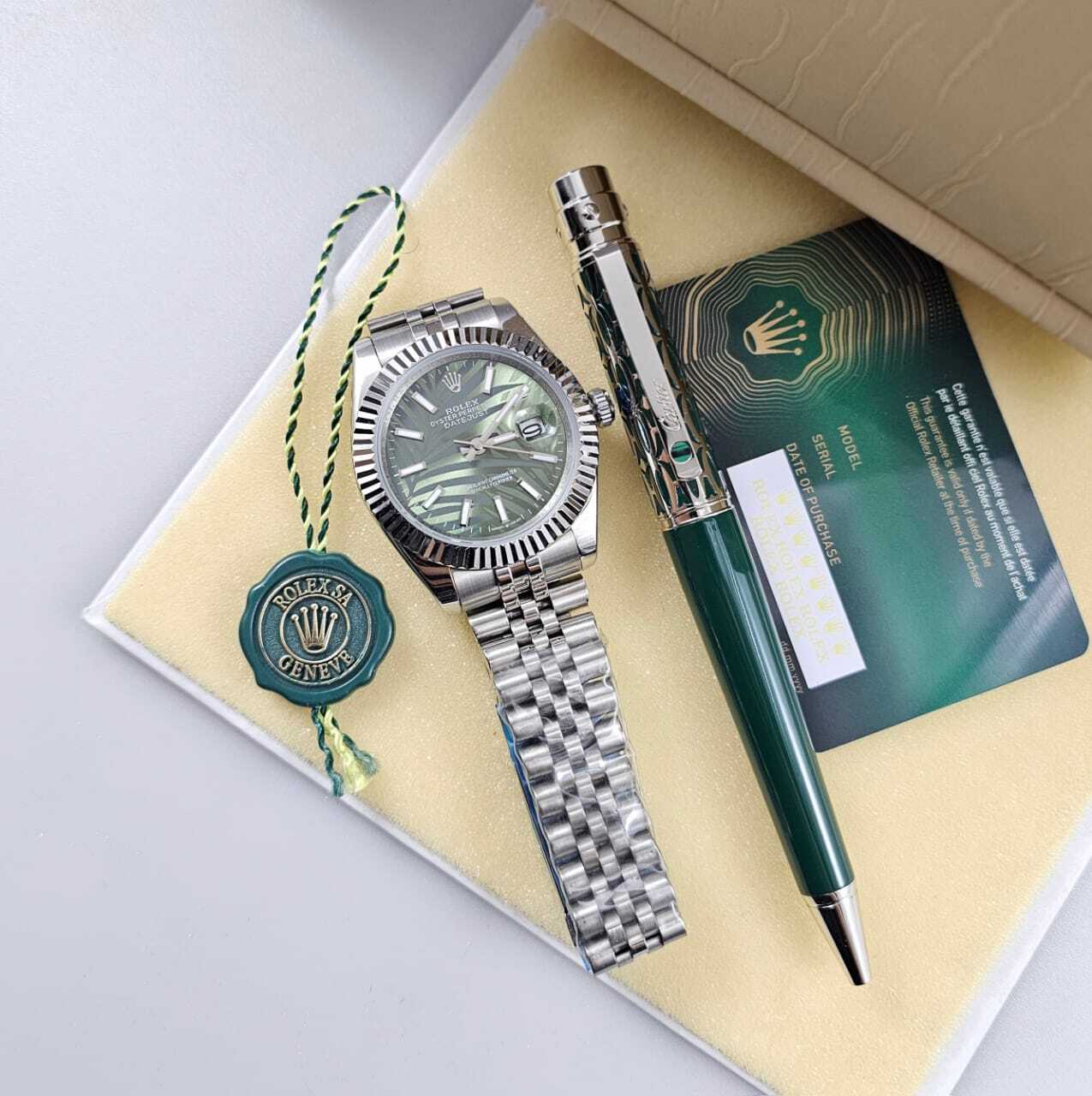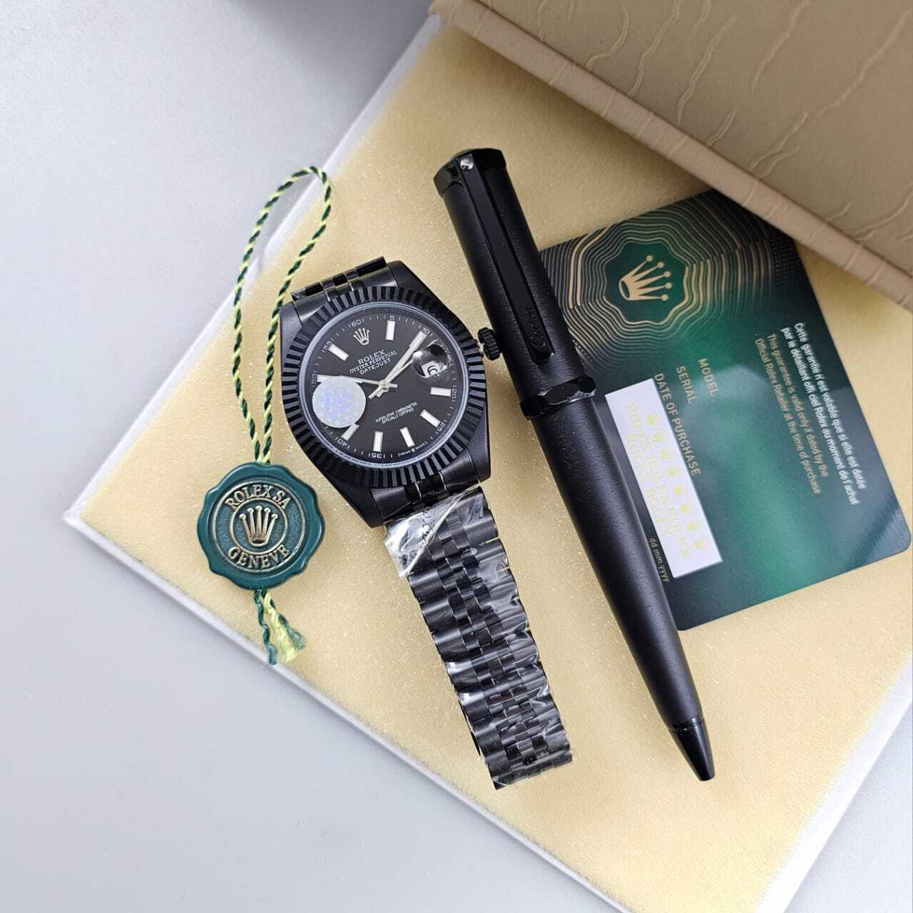 استمتع بجمالية ساعة رولكس الفاخرة مع تفاصيل دقيقة، مصنوعة من أجود المواد مع قلم فاخر. مجموعة مثالية للأشخاص الذين يعشقون الفخامة. تشمل العلبة، الكيس، والكرت لتكتمل تجربة الفخامة.