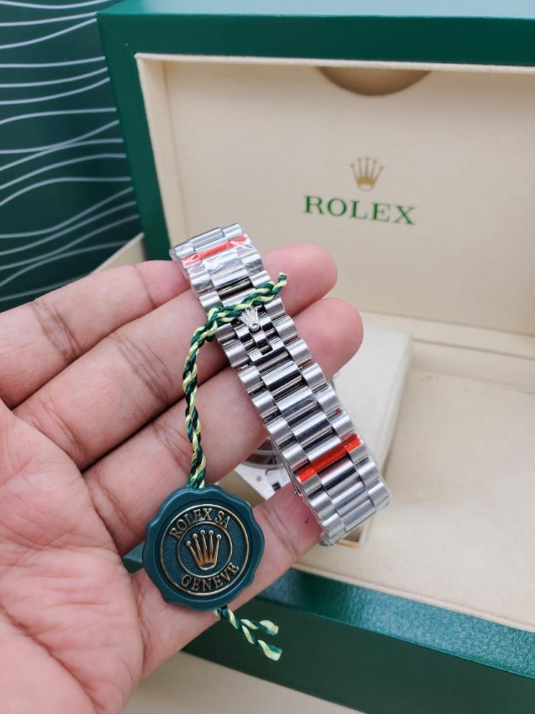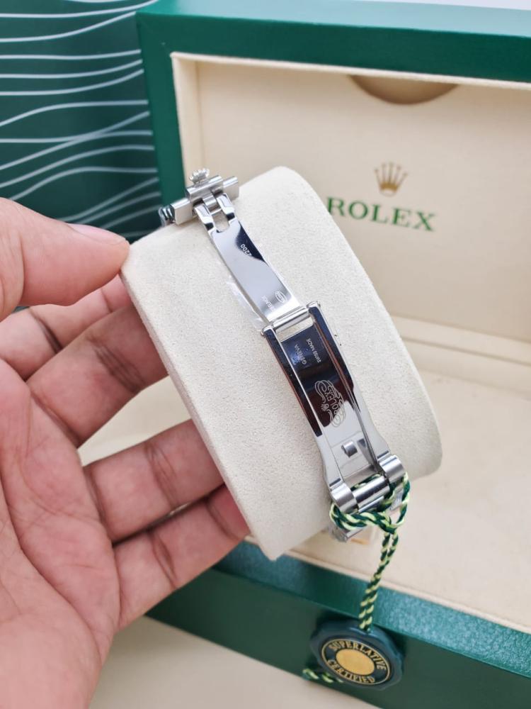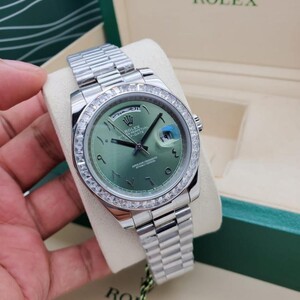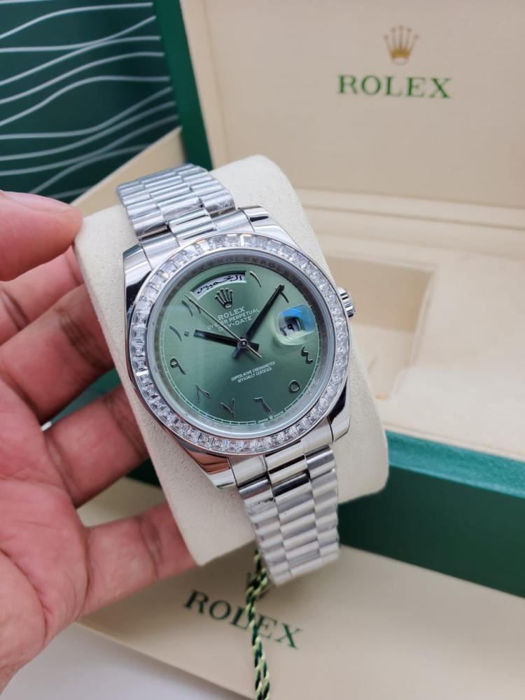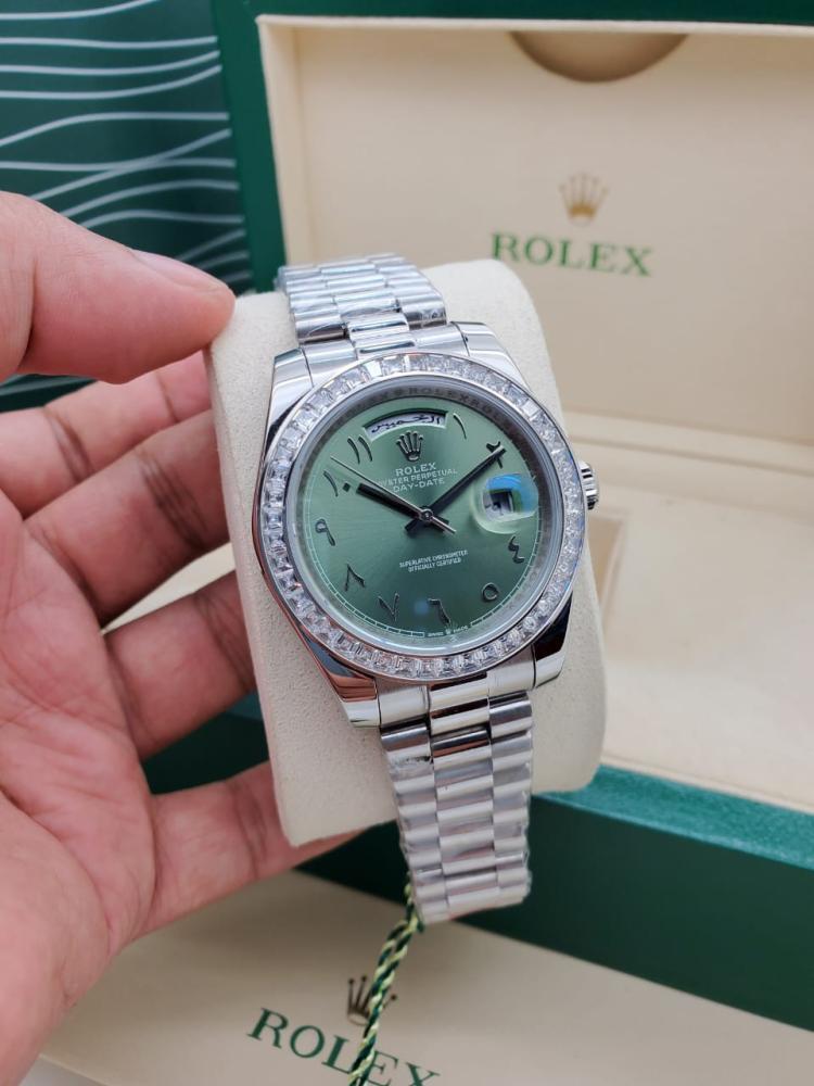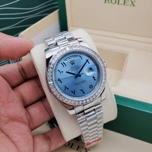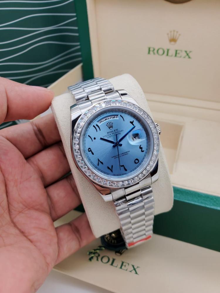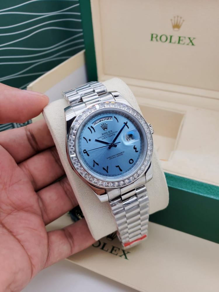 رولكس داي ديت بتصميم مميز، أرقام عربية على ميناء ازرق فاتح او أخضر ، إطار مرصع بفصوص لامعة وهيكل من الستانلس ستيل، تعمل بآلية أوتوماتيكية بقطر 40 ملم. ساعة مثالية تجمع بين الأناقة والجودة العالية.