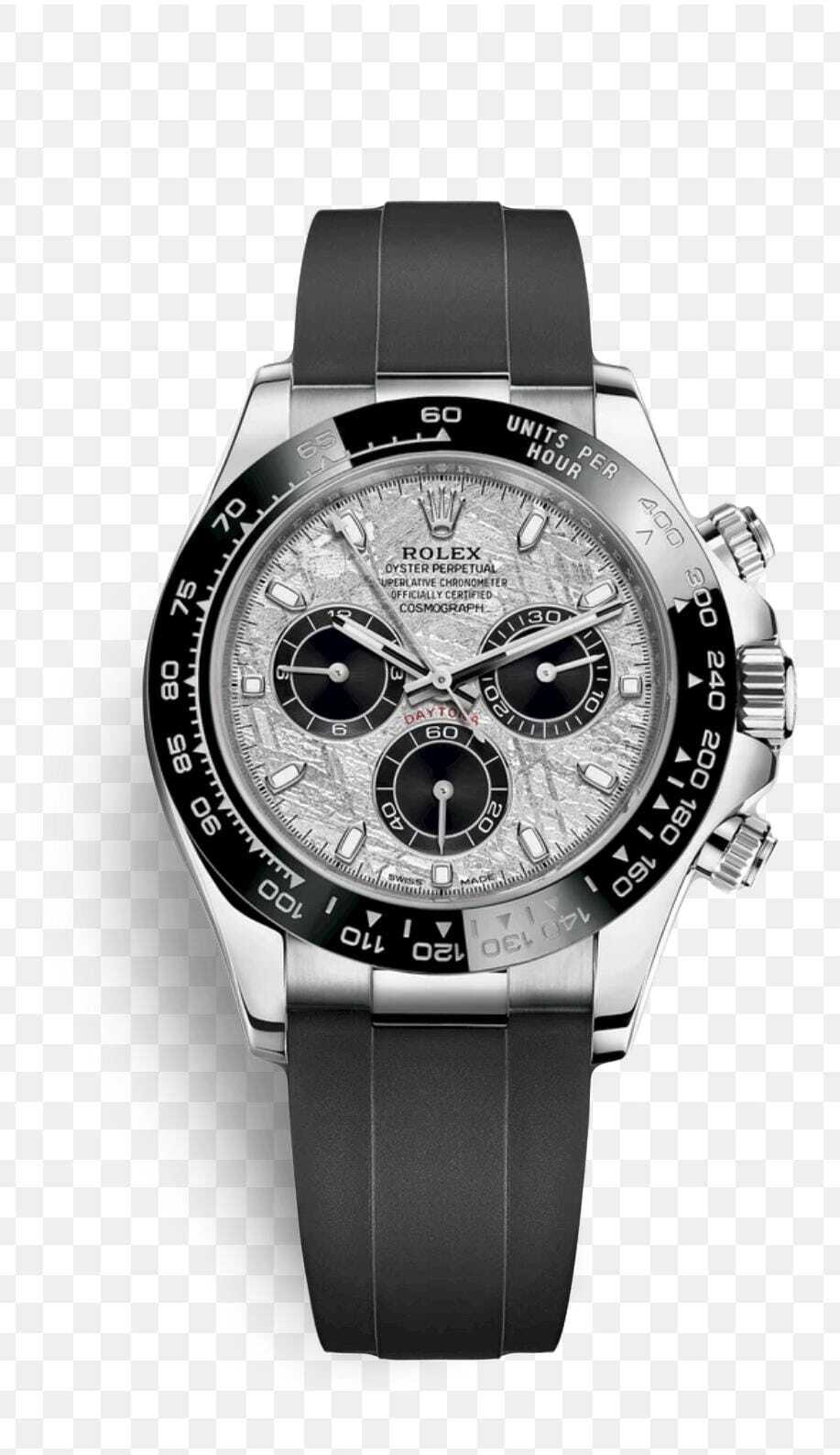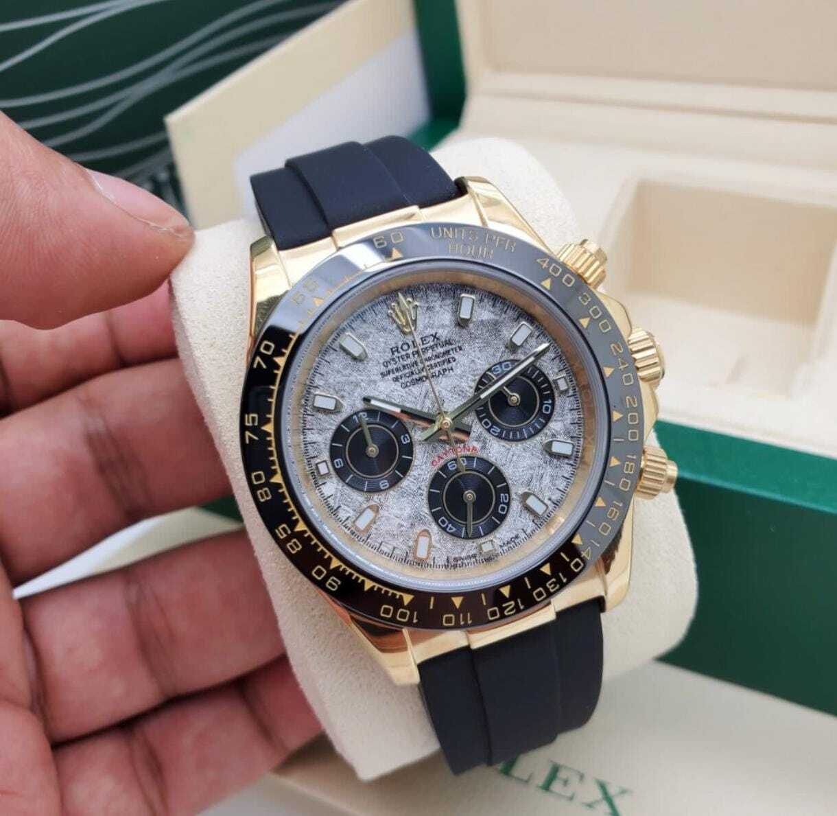 ساعة رولكس ديتونا بتصميم استثنائي يجمع بين الفخامة والعصرية، مع مينا مصنوع من السيراميك وسير من المطاط (ربل) عالي الجودة. هذه القطعة مثالية لمحبي التصميم الرياضي مع لمسة من الأناقة الراقية.