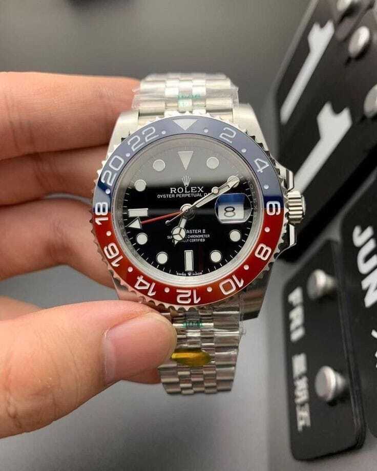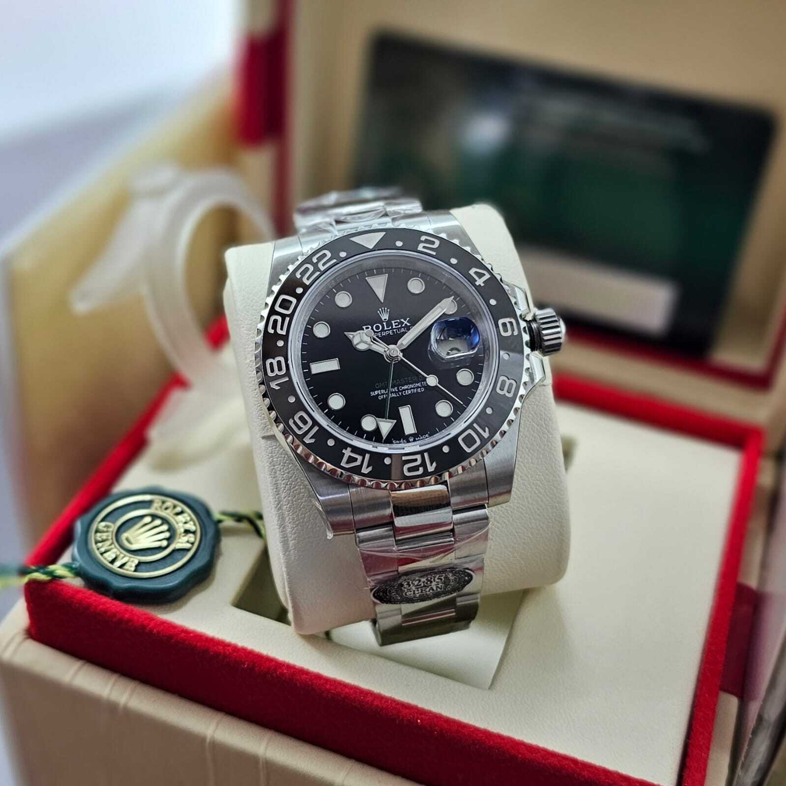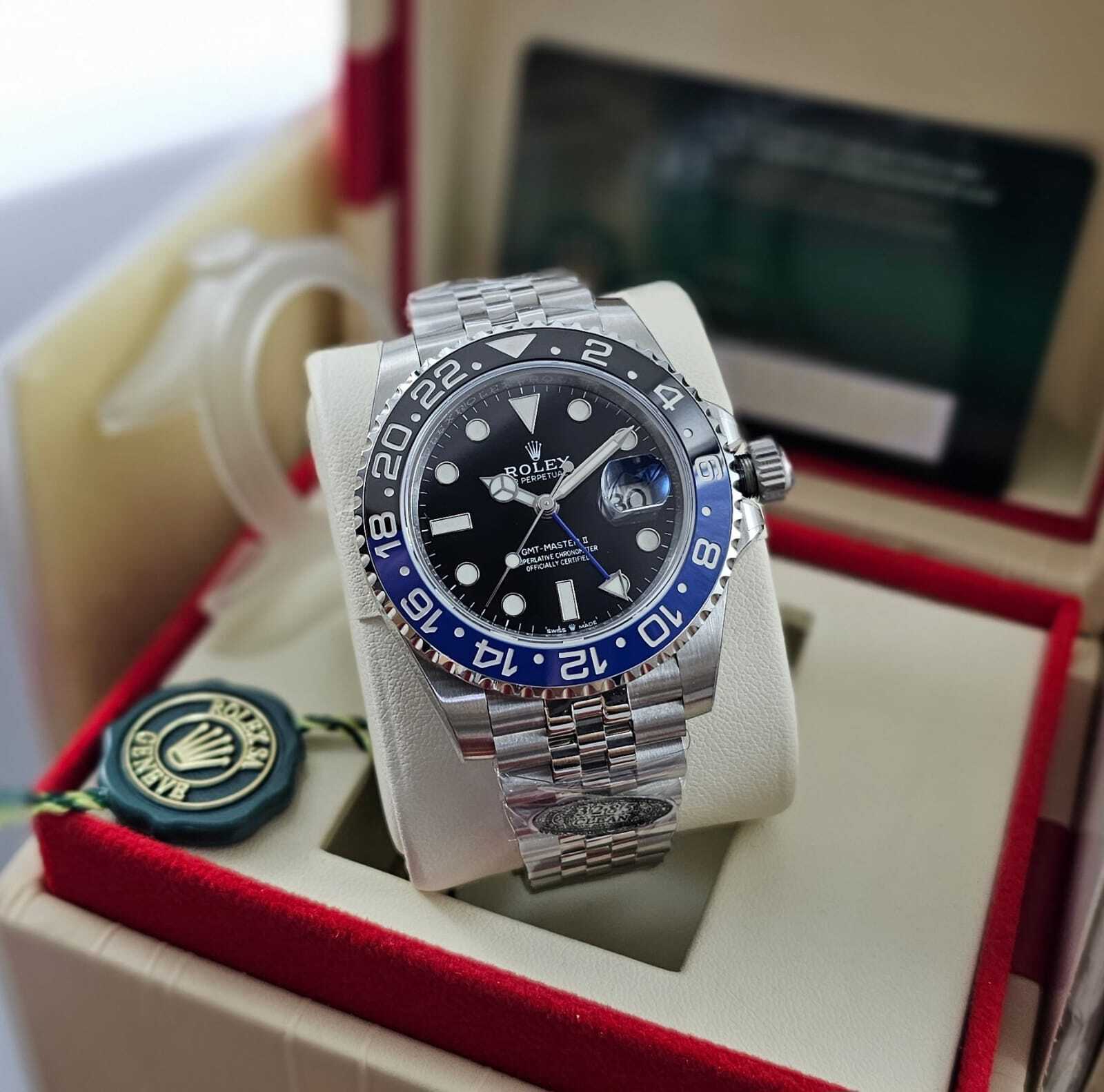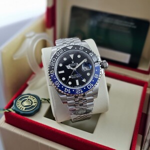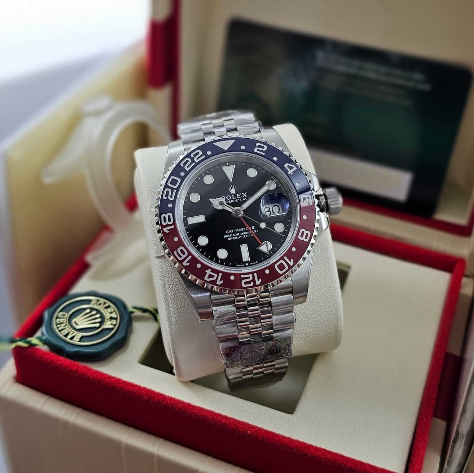 ساعة رولكس جي إم تي ماستر كواليتي بتصميم فاخر مطابق للأصلية، مزودة بمكينة أوتوماتيك عالية الدقة.، مع ميناء أسود وعقارب مضيئة، وسوار جوبلي أنيق من الستانلس ستيل، ما يجعلها مزيجًا مثاليًا من الأناقة والأداء.