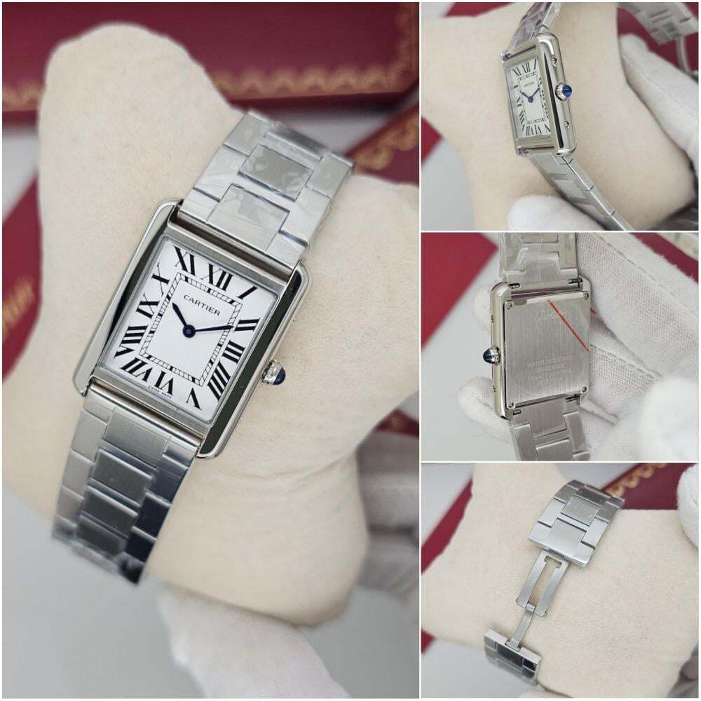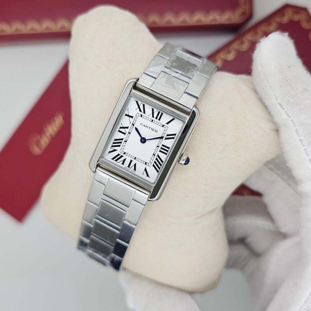 ساعة تانك دي كارتير أنيقة بتصميم فضي لامع، هيكل وسوار من ستانلس ستيل، ميناء بأرقام رومانية، مقاس 36 مم يناسب اليد النحيفة. تعمل بماكينة كوارتز عالية الجودة، مع ضمان سنة.