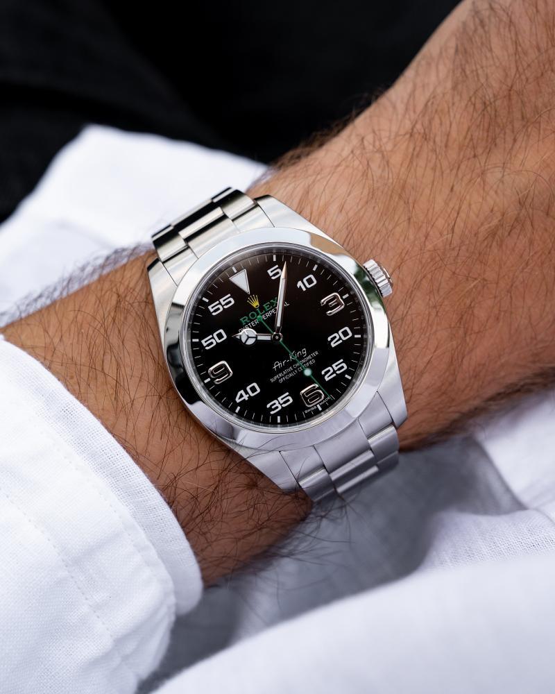 ساعة رولكس إير كينغ الرجالية، تصميم كلاسيكي بحجم أنيق بقطر 39 مم. تعمل بآلية بطارية دقيقة وتتميز بجودة عالية. مصنوعة من هيكل وسوار ستانلس ستيل متين، مما يضفي عليها لمسة من الفخامة والمتانة، لتناسب الإطلالات اليومية والمناسبات.