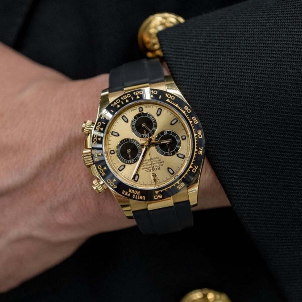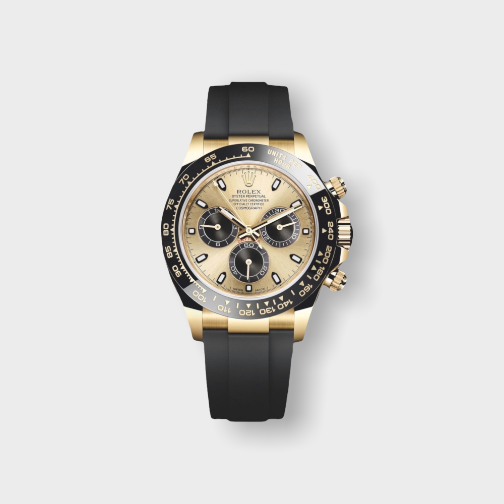 رولكس دايتونا بتصميم رياضي أنيق وهيكل من الذهب الأصفر، مزودة بسوار مطاطي أسود مقاوم، وكرونوغراف دقيق. ساعة تجمع بين الفخامة والأداء العالي لعشاق التميز والدقة.