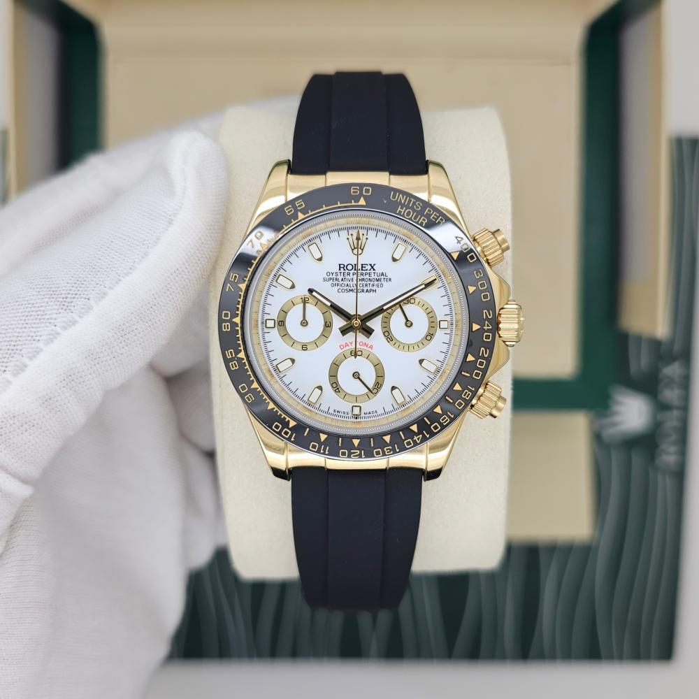 ساعة رولكس دايتونا بتصميم رياضي أنيق، مصنوعة من ستانلس ستيل عالي الجودة، مع سوار ربل مميز. تعمل بنظام كرونوغراف (ستوب واتش) بدقة فائقة. مقاومة للماء ومزودة بضمان سنة كاملة. تشمل علبة فاخرة وإكسسوارات العلامة.