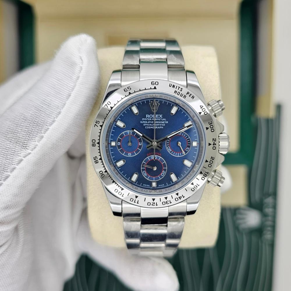 ساعة رولكس رجالية موديل دايتونا بتصميم عصري أنيق. تتميز بنظام كرونوغراف (ستوب واتش) ومكينة تعمل بالبطارية. الهيكل مصنوع من الستانلس ستيل بميناء كحلي فخم. الساعة تأتي بمقاس قطر 40 ملم وحزام معدني متين.