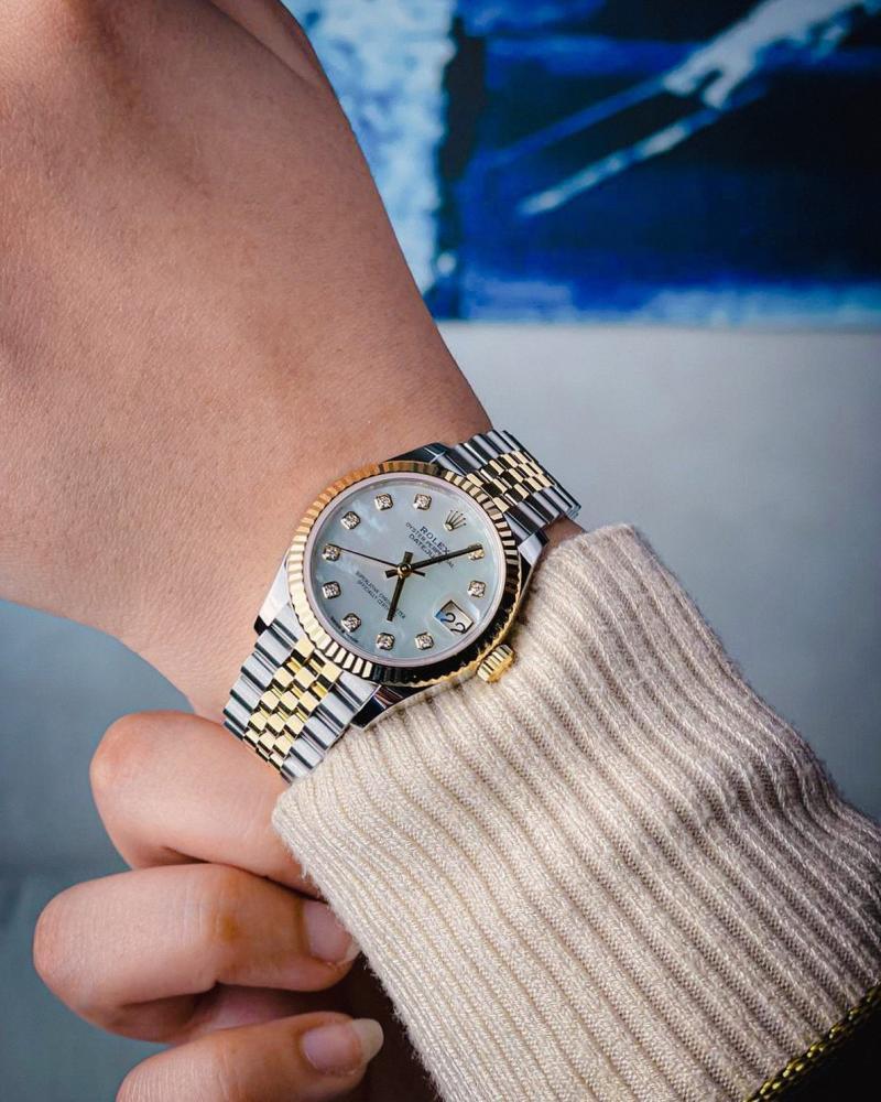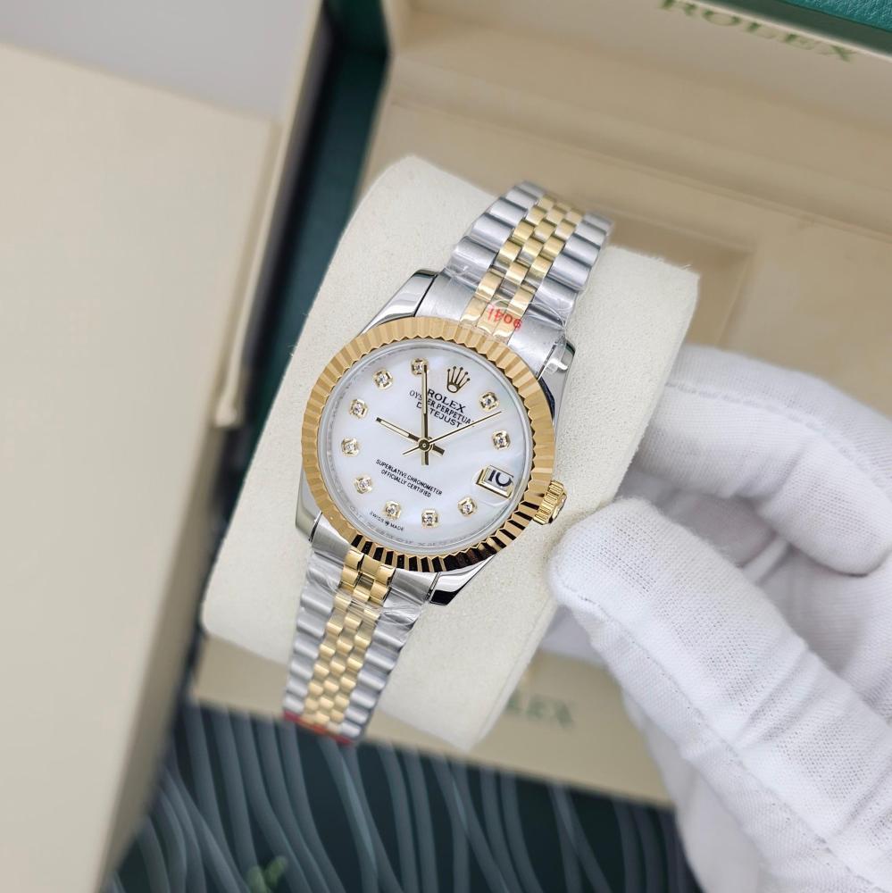 ساعة رولكس دايت جست النسائية بتصميم فاخر وأنيق، مصنوعة من الستانلس ستيل ولون ذهبي ، بميناء أبيض جذاب مزود بمؤشرات مرصعة بالزركون . تتميز بإطار ذهبي محزز وسوار جوبيلي. مثالية للإطلالات الراقية. جودة عالية.