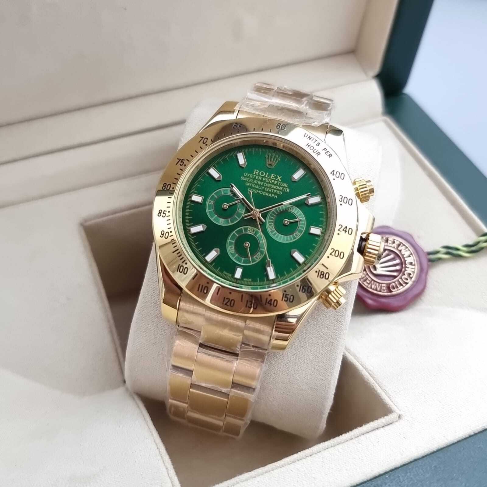 ساعة رولكس ديتونا الكلاسيكية بلمسة فريدة ومذهلة، تتميز بهيكل من الستانلس ستيل مطلي باللون الذهبي الأنيق مع ميناء أخضر لامع يعكس الأناقة والتميز. قطعة مثالية لعشاق الفخامة والتصاميم الفريدة.