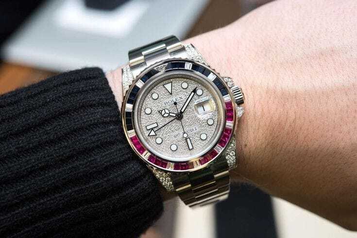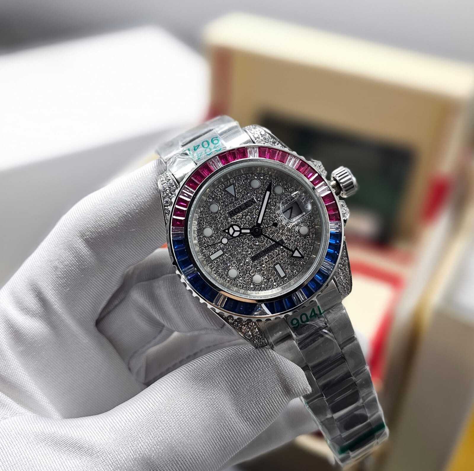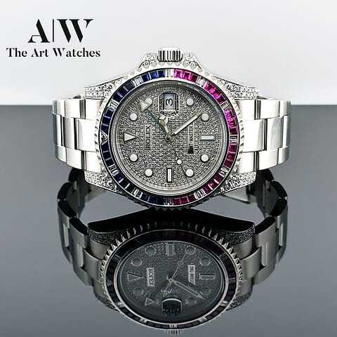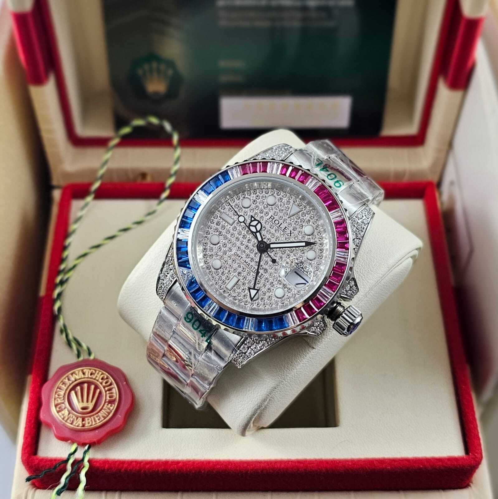 ساعة رولكس GMT ماستر II بتصميم فاخر مرصع بالكامل بالفصوص، تجمع بين الأناقة والأداء الميكانيكي الدقيق. إطار مرصع بأحجار متعددة الألوان يضفي عليها مظهراً راقياً، مع مكينة أوتوماتيك وسوار ستانلس ستيل عالي الجودة.